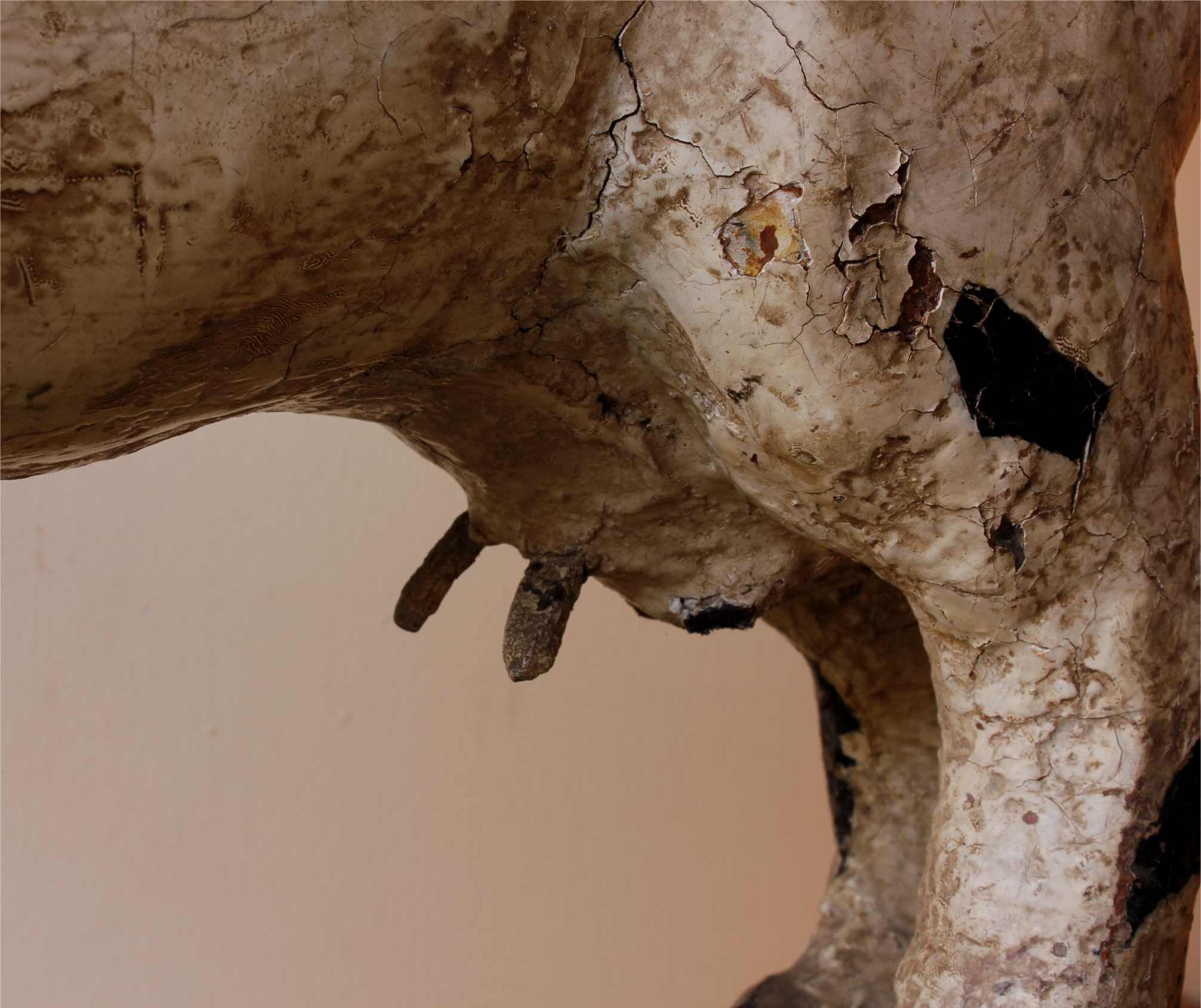 This super decorative antique piece has a fabulous look with it's dried black and white paint, has nice detail that include horns, leather ears, nose, metal eyes and udders.