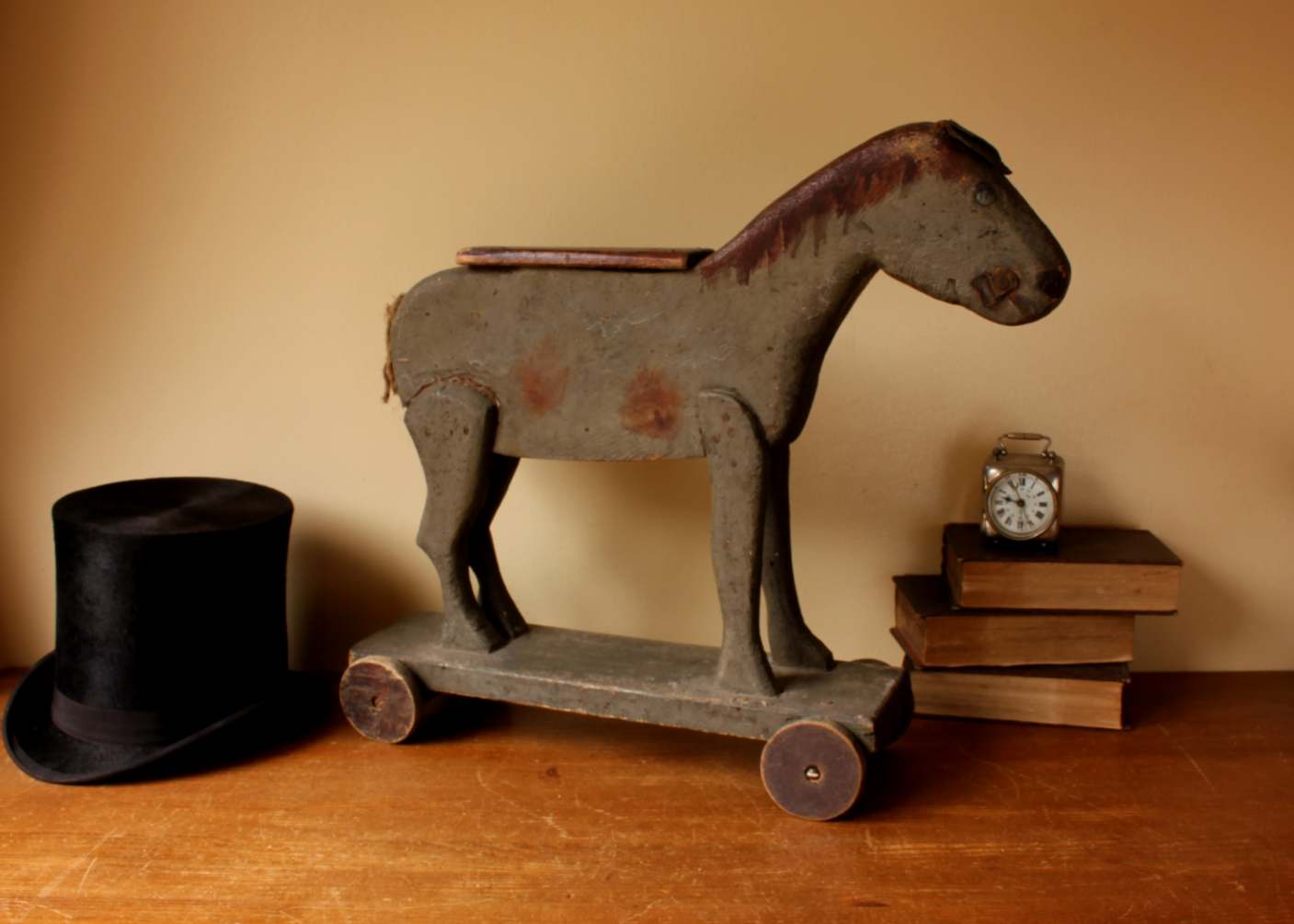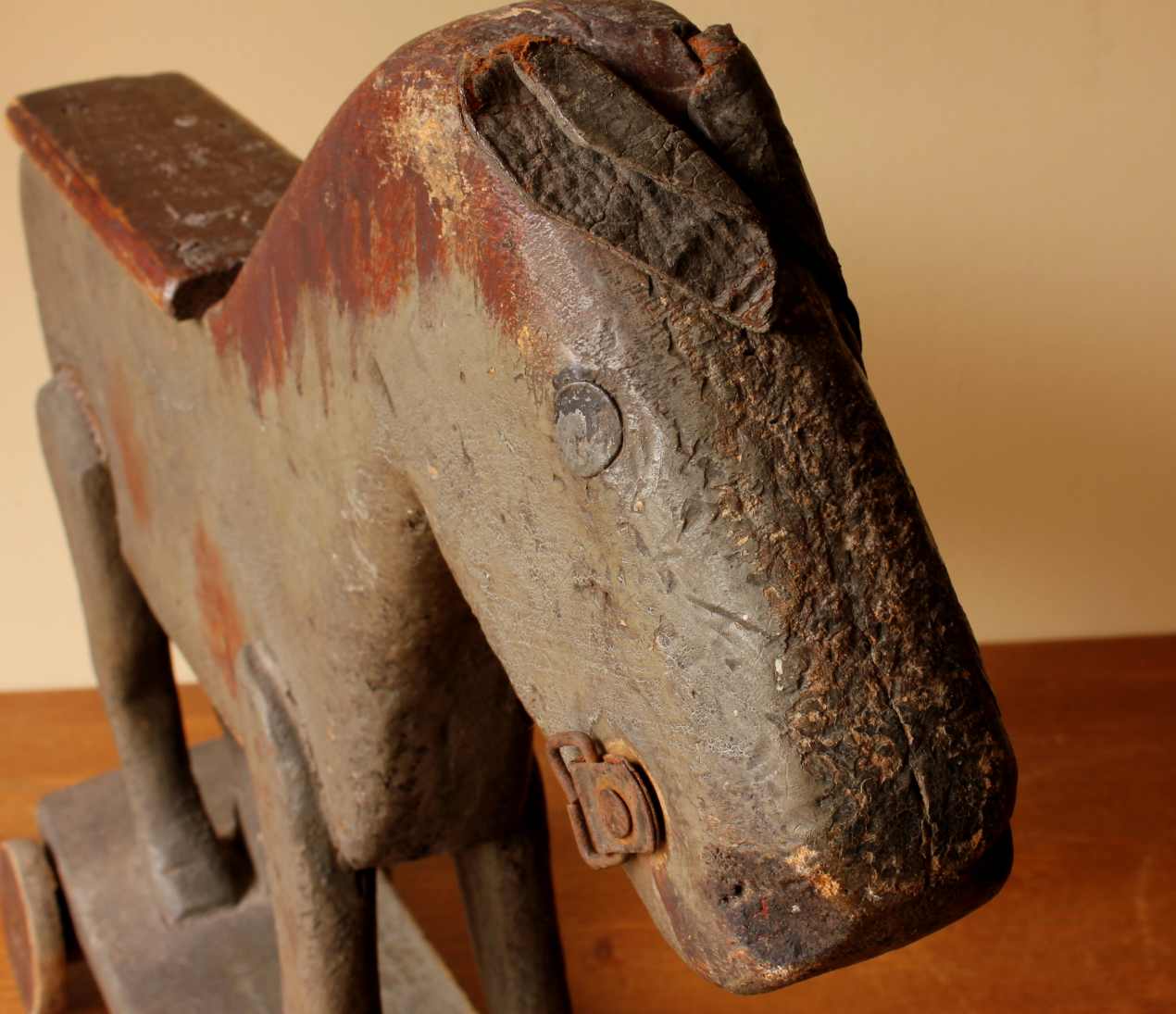 This antique folk art pull along toy donkey which looks to date from c1900 would have been lovingly made by hand and has charming details that include leather ears, string tail and is painted in grey and brown paint which has now aged and worn giving a great colour and patina.
