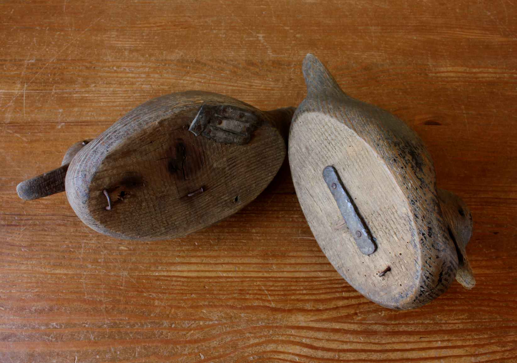 These two decorative and original antique decoy ducks which are made of wood still have some of the remains of their original paint showing, have painted metal eyes, are fitted with bottom balance weights and are nice early ones.