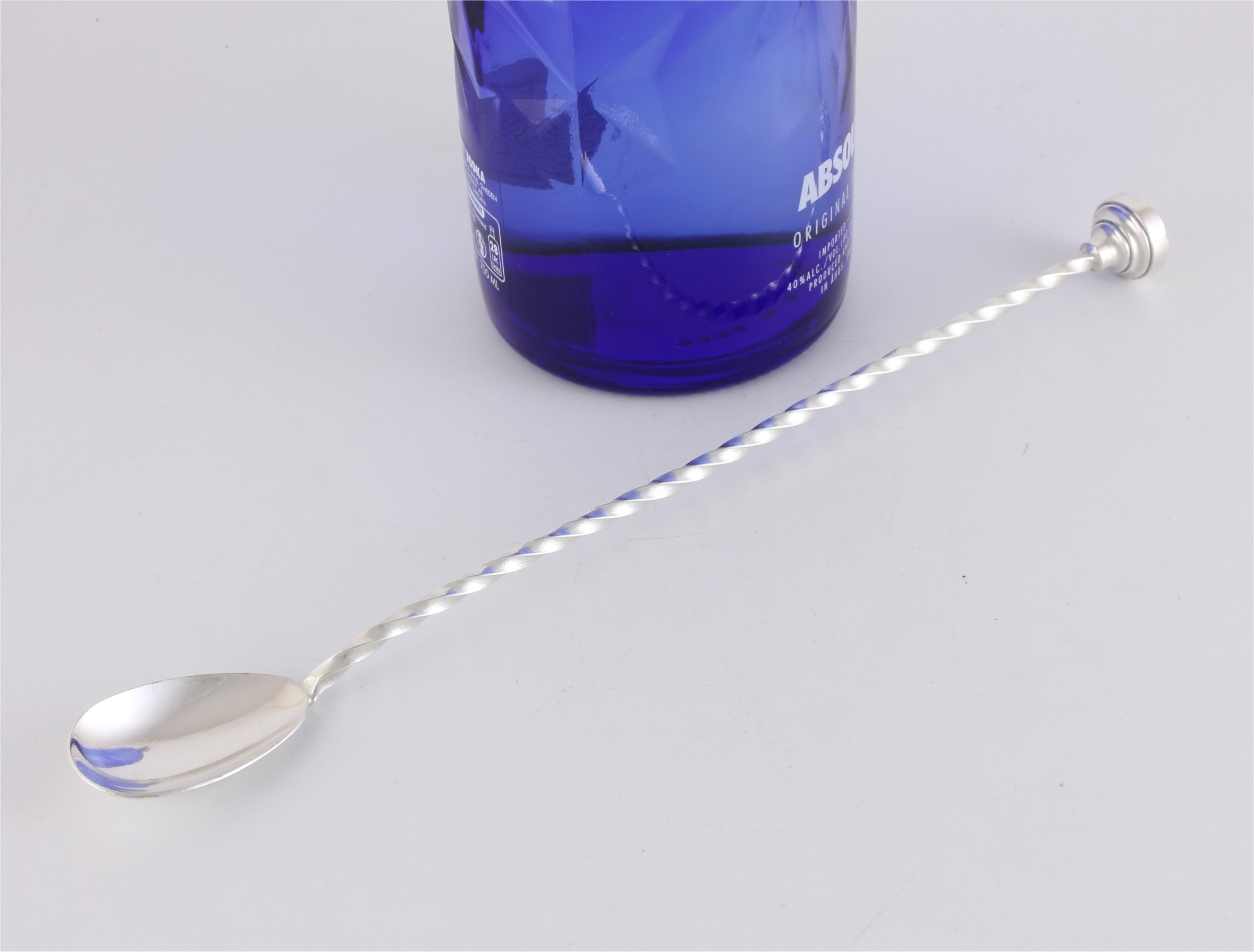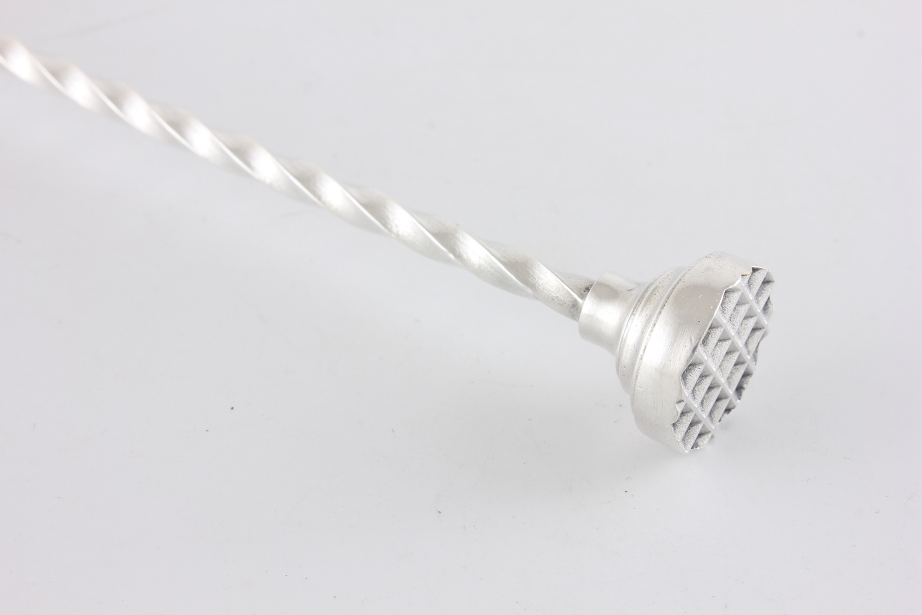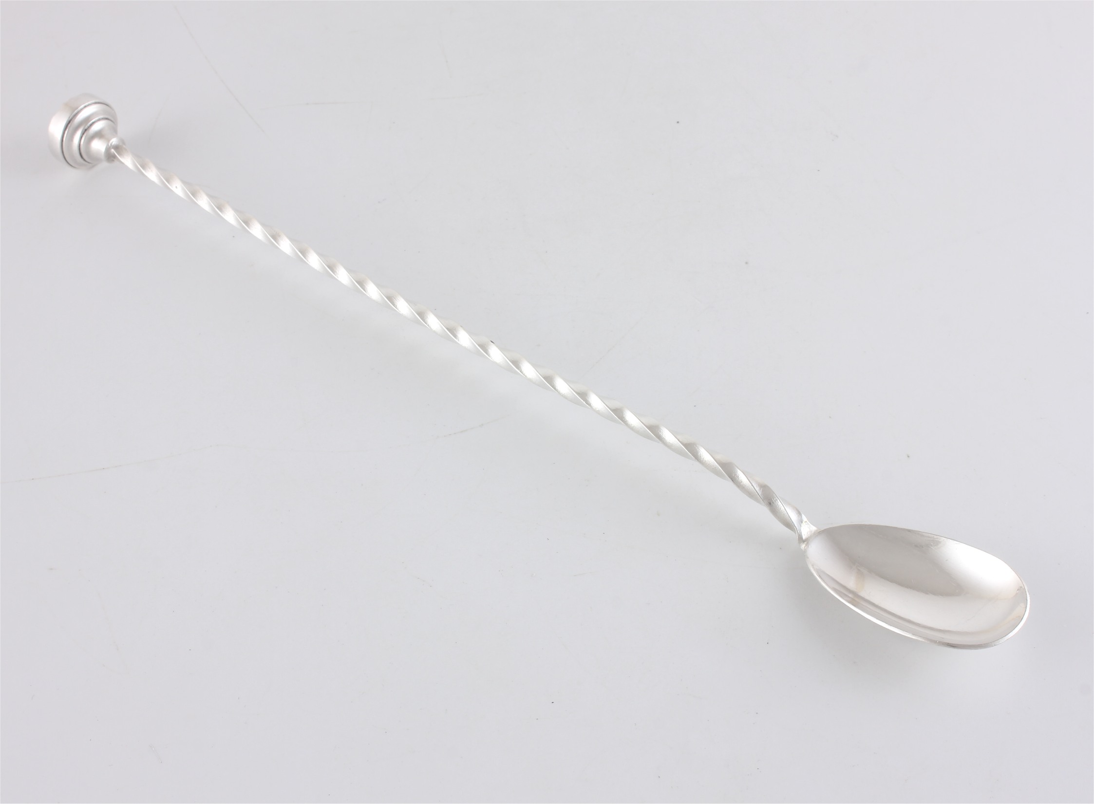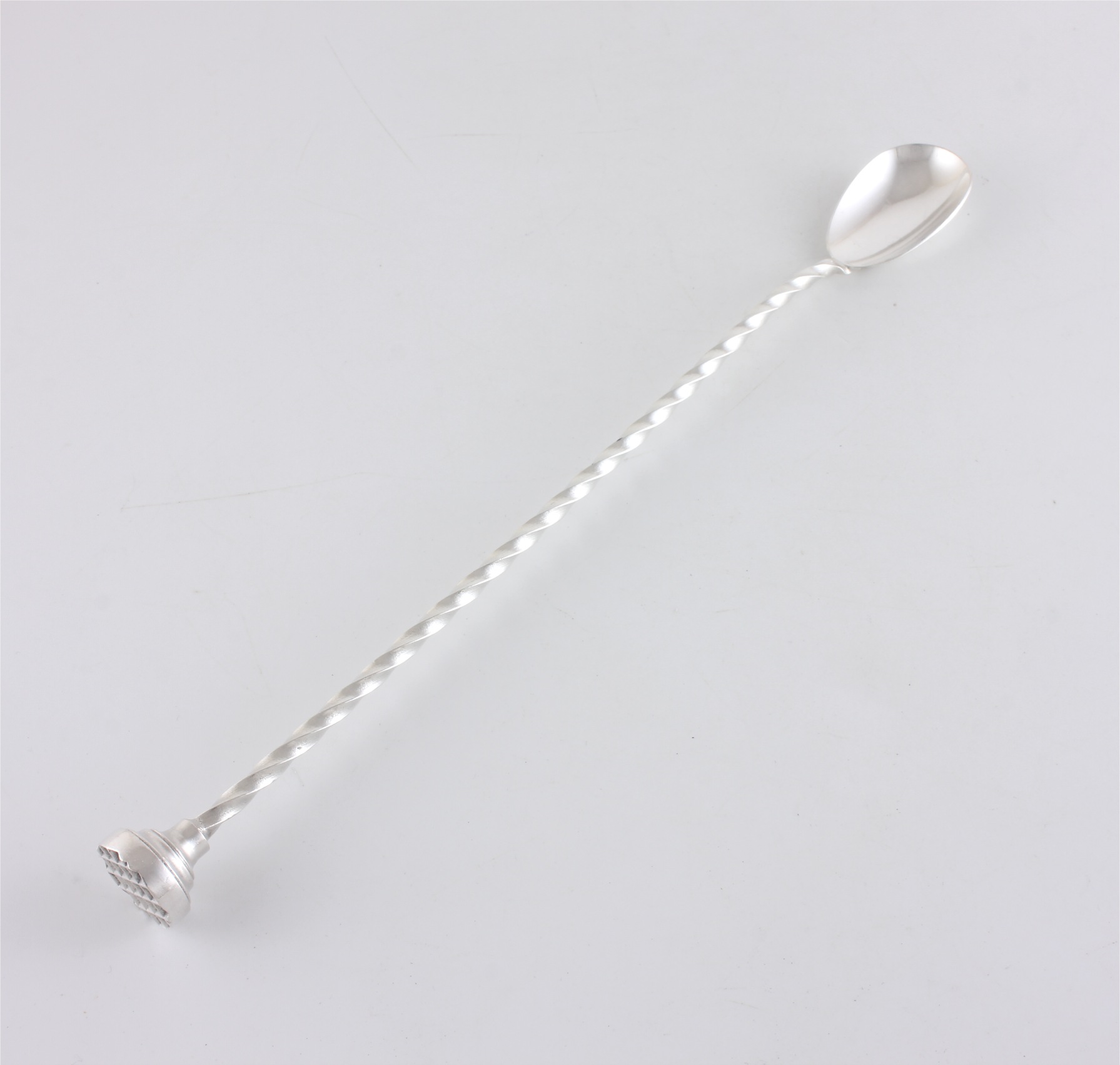 This stylish antique French silver plated long cocktail stirrer spoon which dates from the 1920's has a twisted design with a large spoon to one end and a round muddler which has a criss-cross pattern at the other end for crushing your cocktail ingredients.