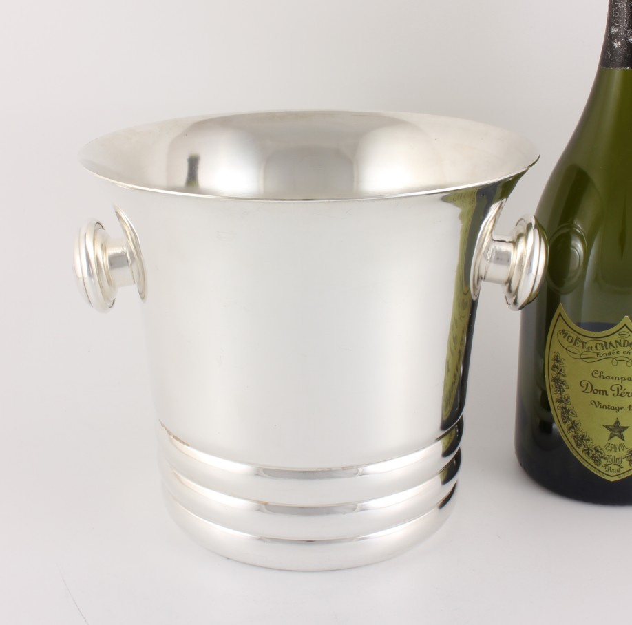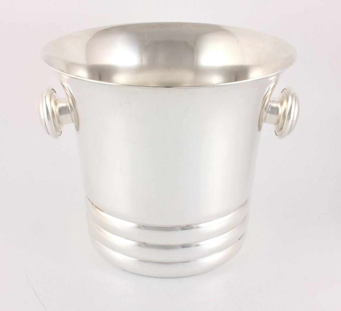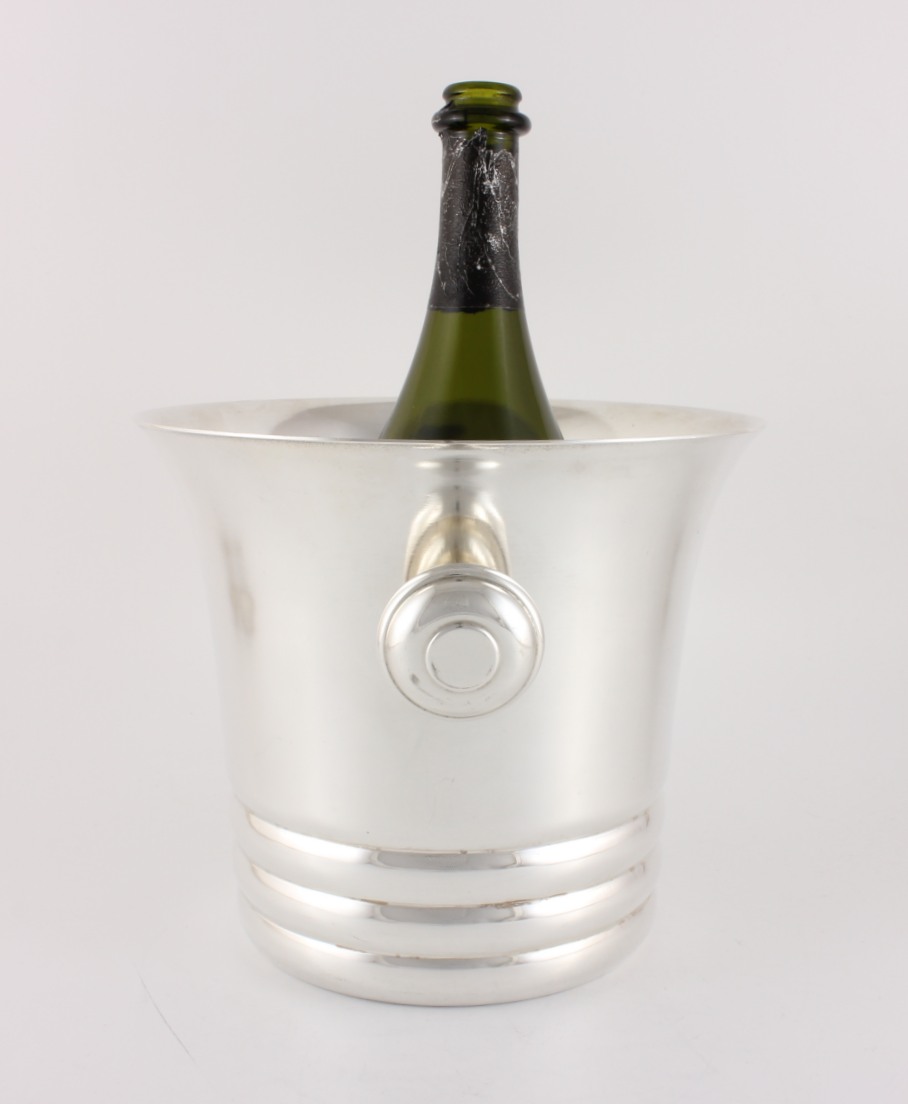 This handsome Art Deco silver plated French wine or Champagne cooler which dates from the first half of the 20th century features a fluted top, two round knob side handles and is marked to the base with the maker's mark.