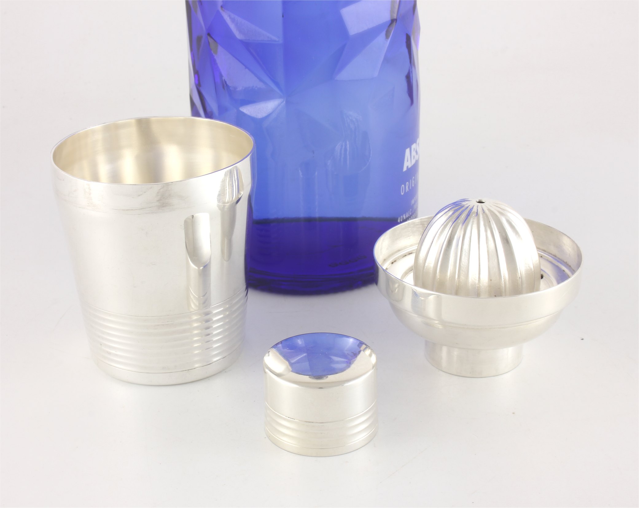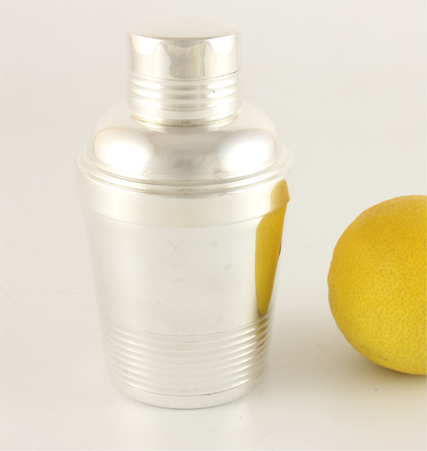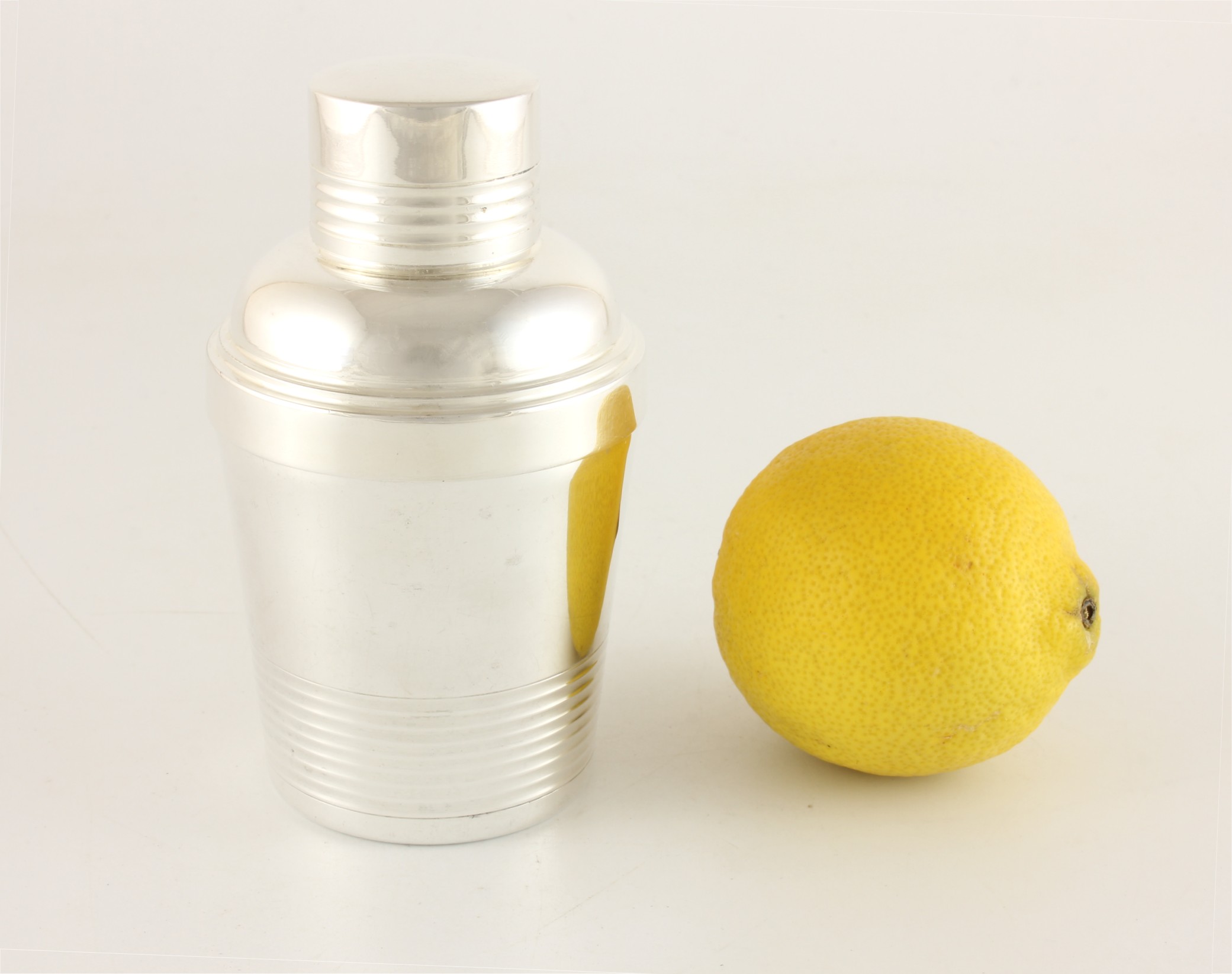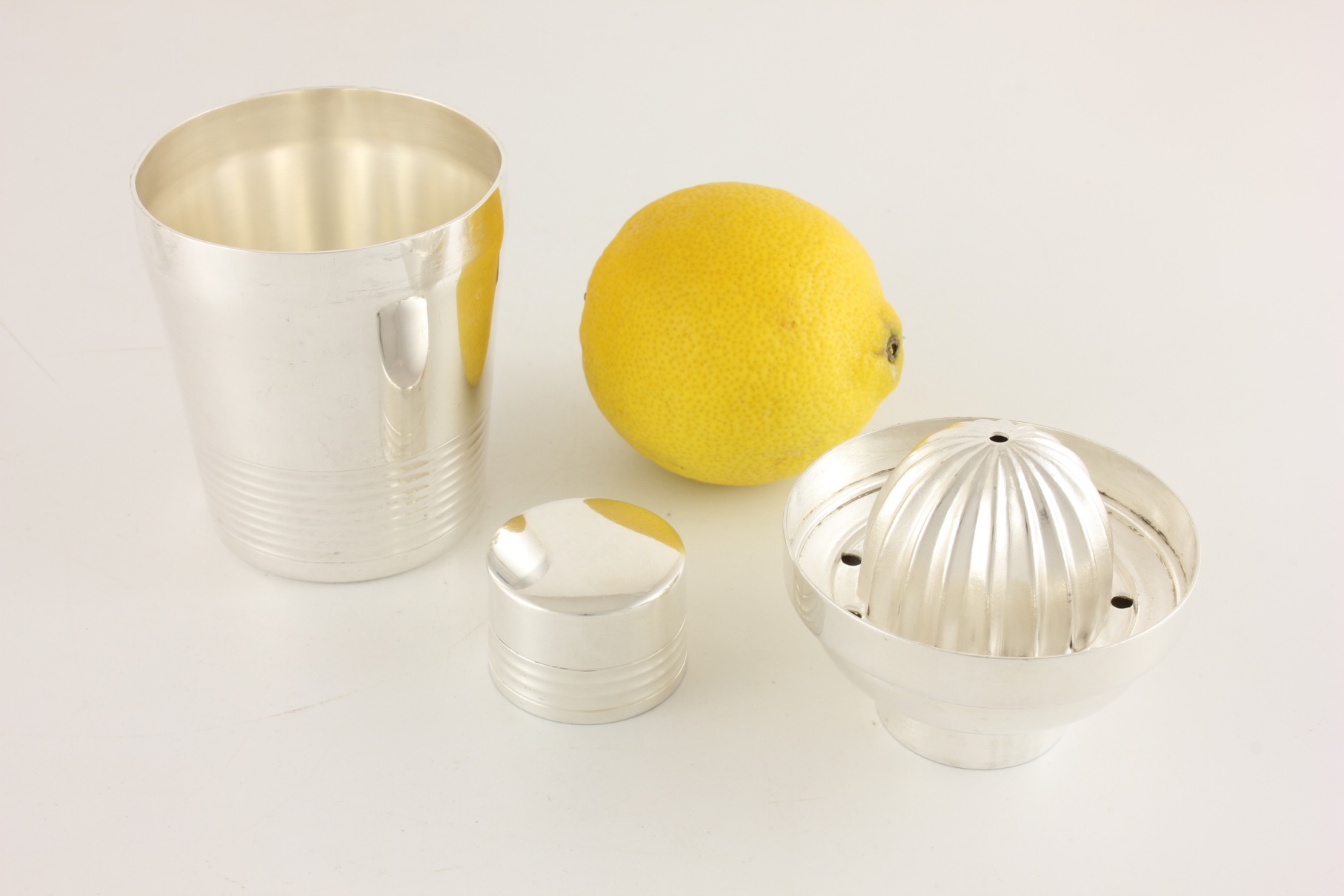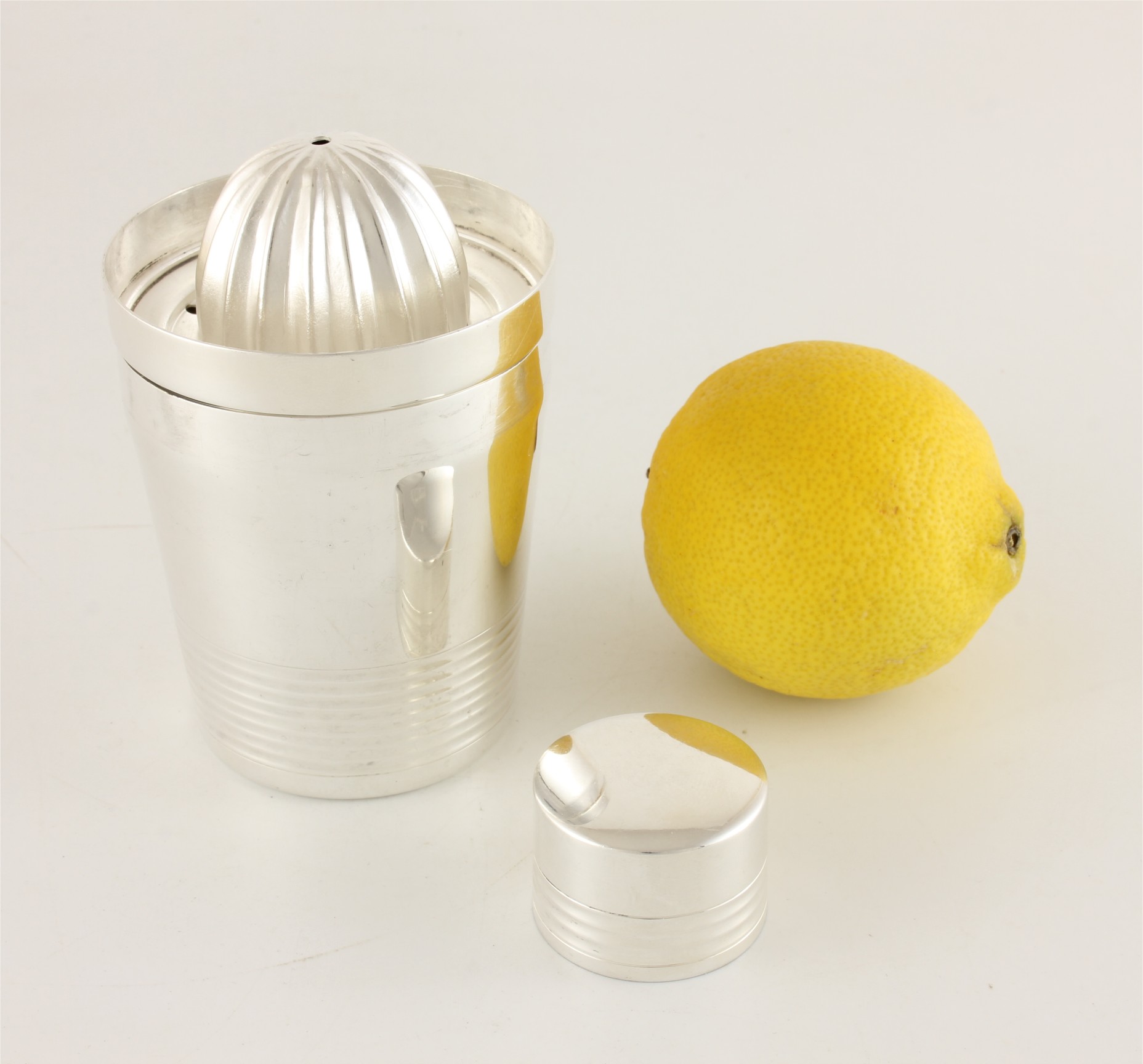 This charming piece comes in 3 parts and is in the style of a miniature Art Deco ring design cocktail shaker. The top and bottom sections come apart to reveal the lemon squeezer inside the top section which you can turn upside down to fit back into the bottom section where the juice accumulates whilst the pips remain in the strainer.