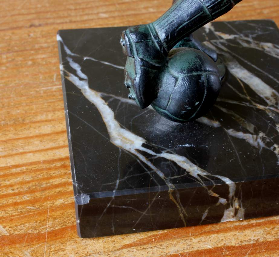 This Art Deco style French football statue which is made of cast metal sits on a square marble base and dates from the mid 20th century.