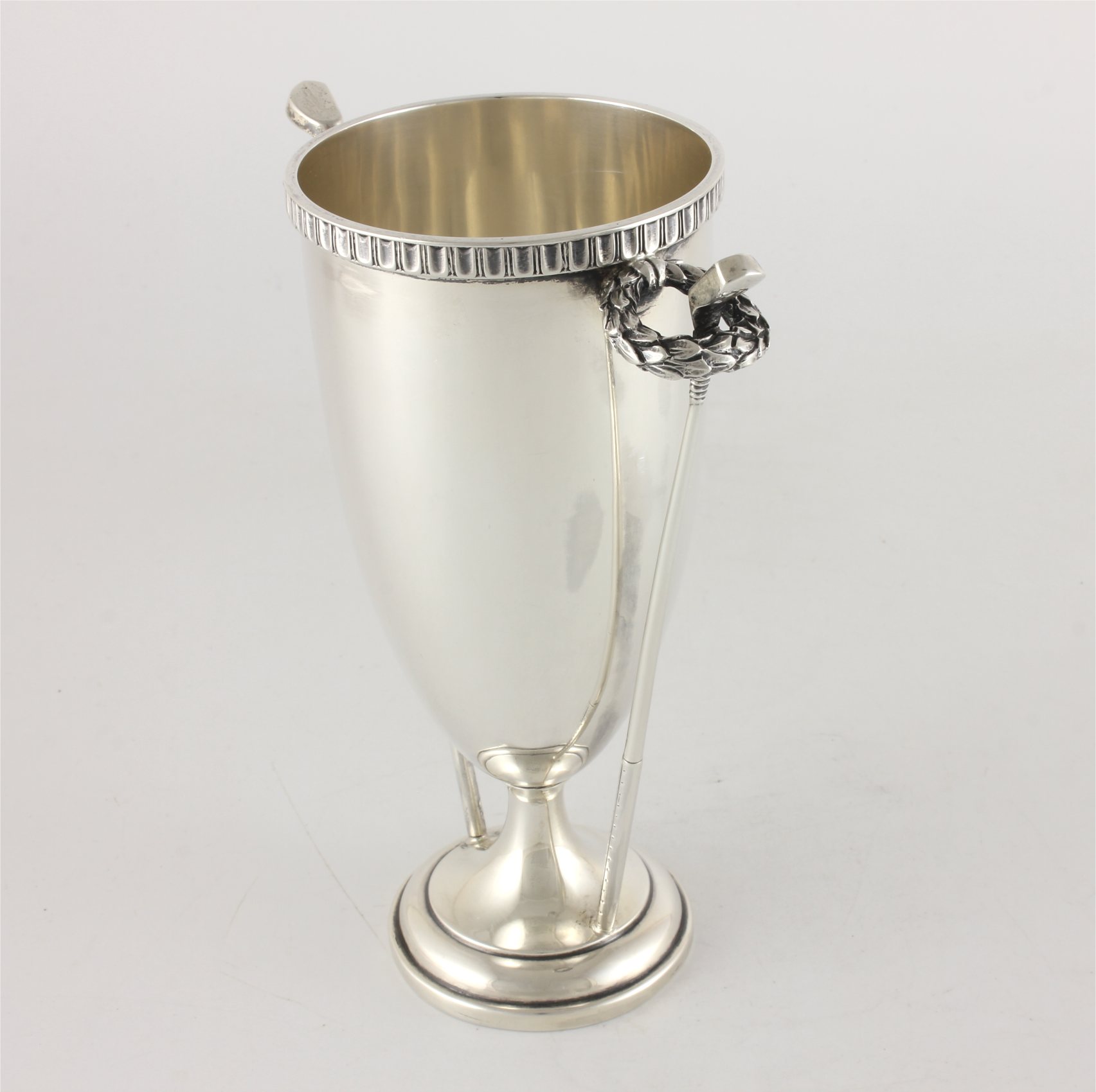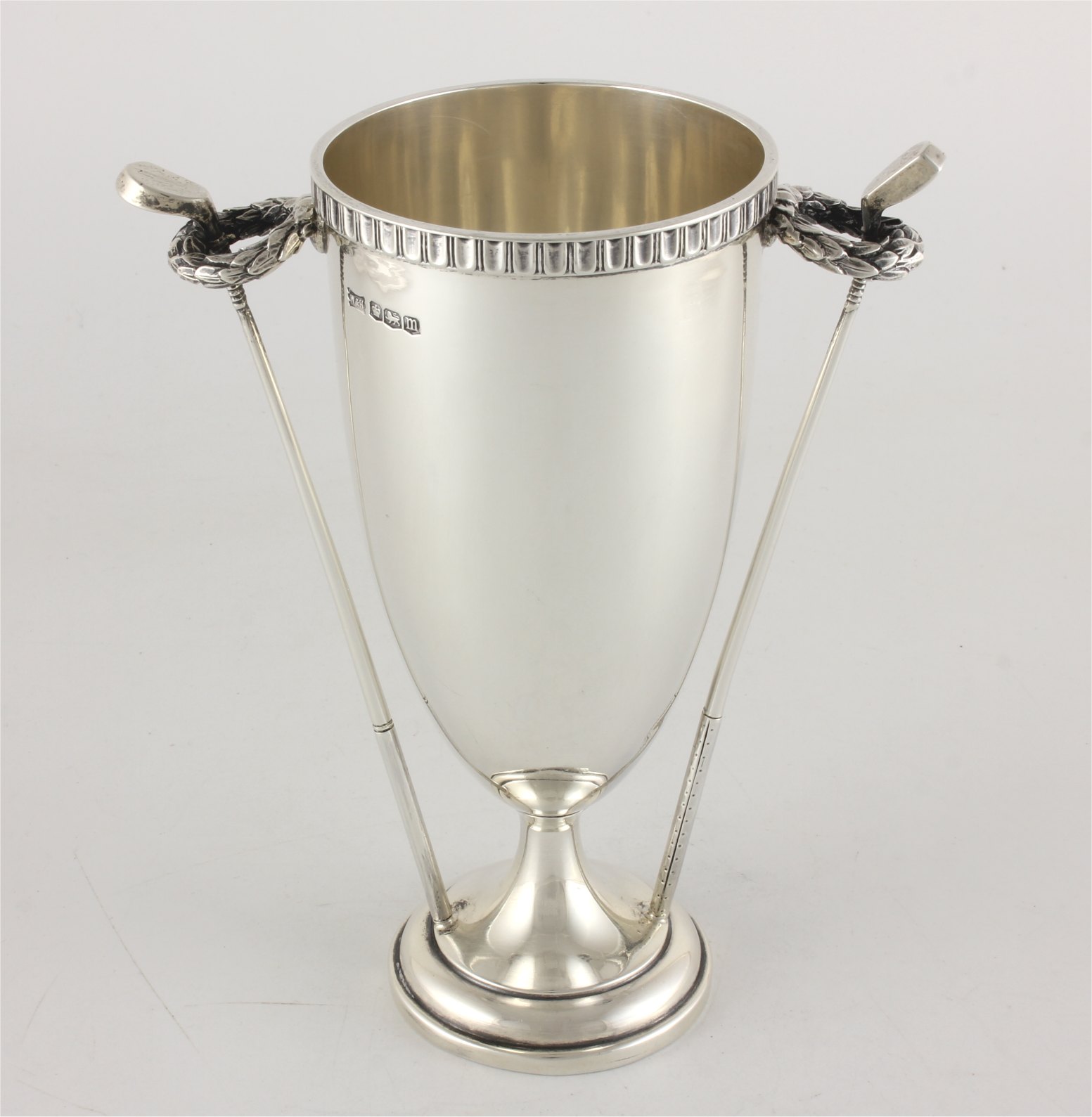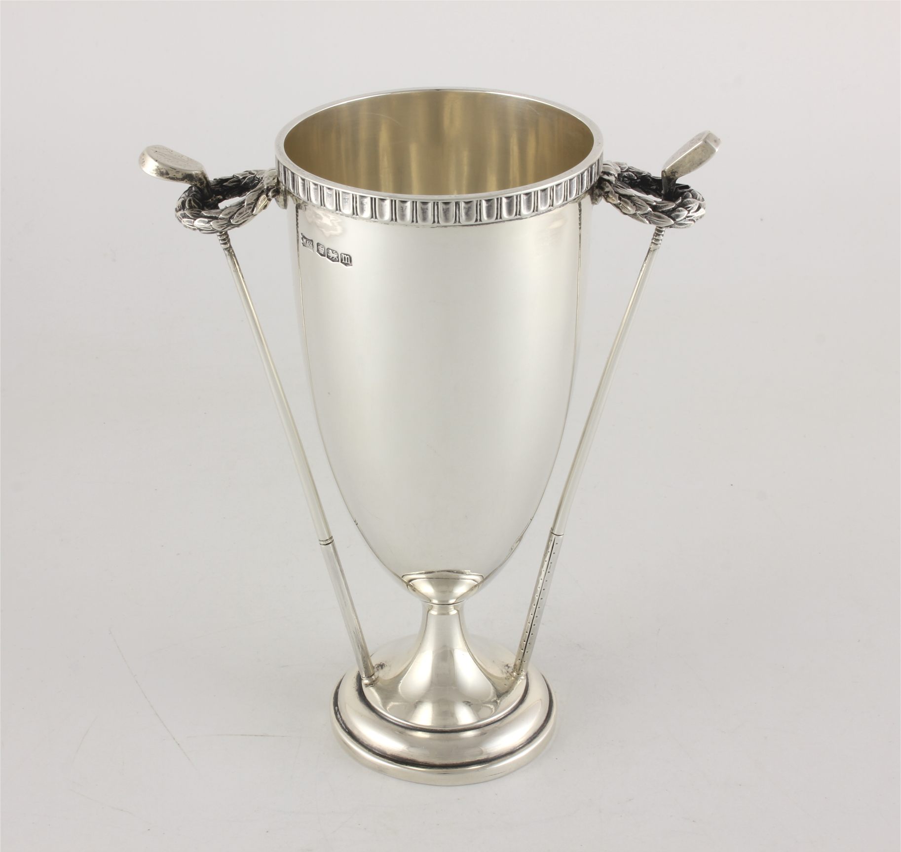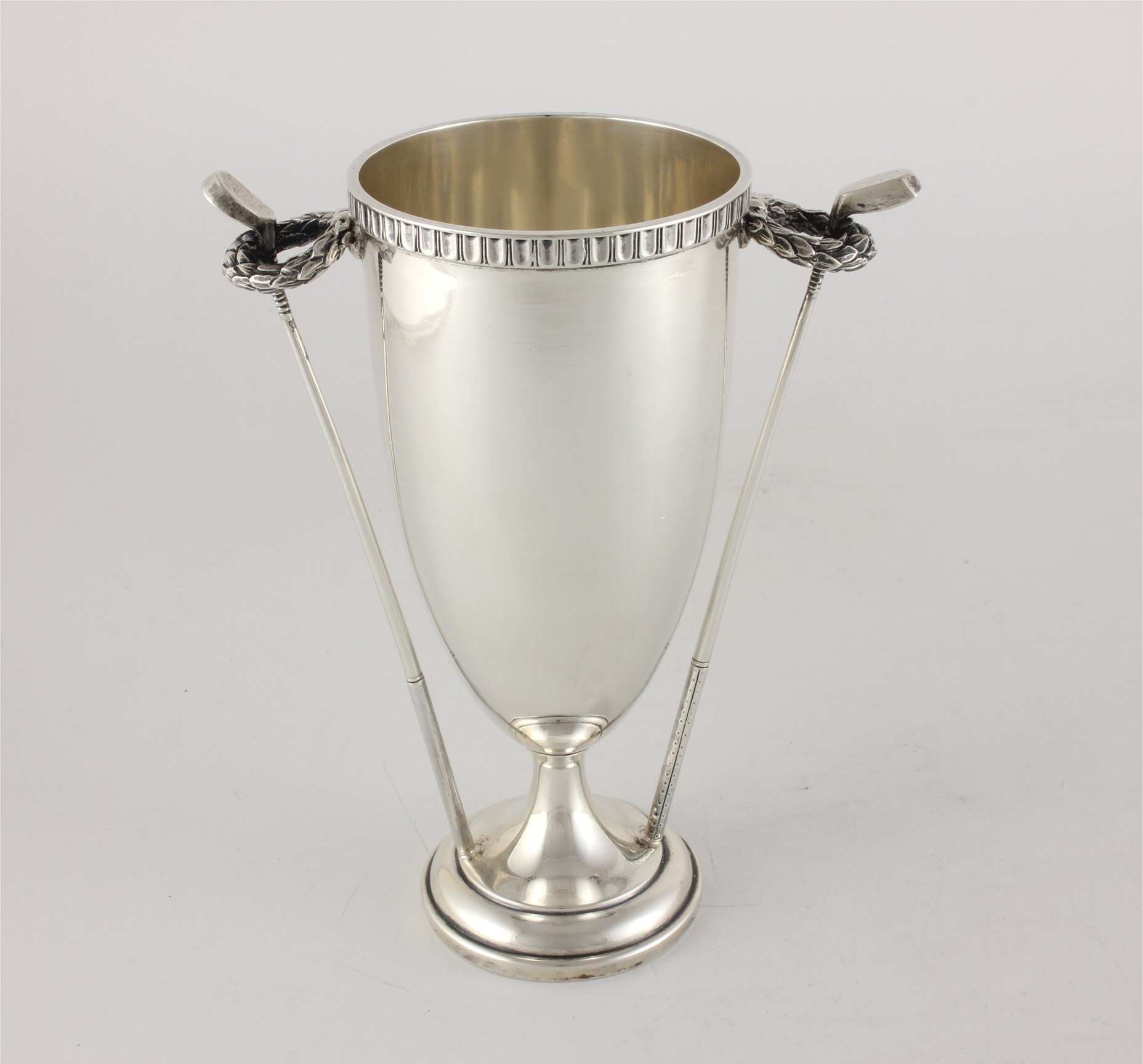 This wonderful antique golf trophy which is made of solid sterling silver has handles designed as a golf club with a laurel wreath either side and is fully hallmarked for Sheffield 1929.