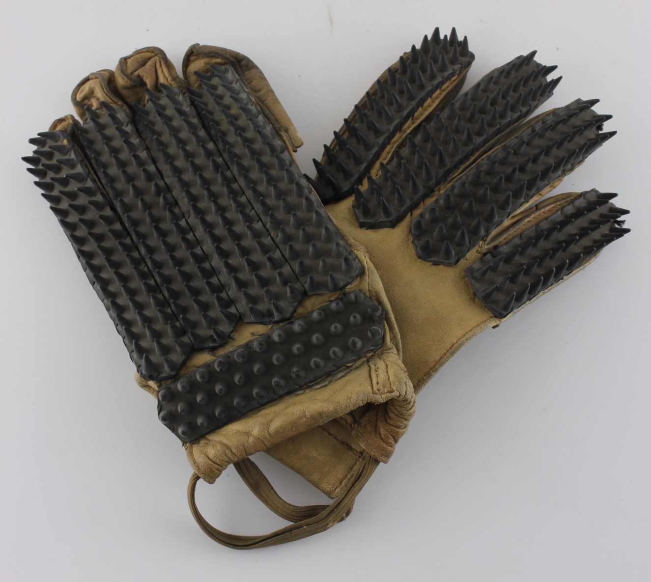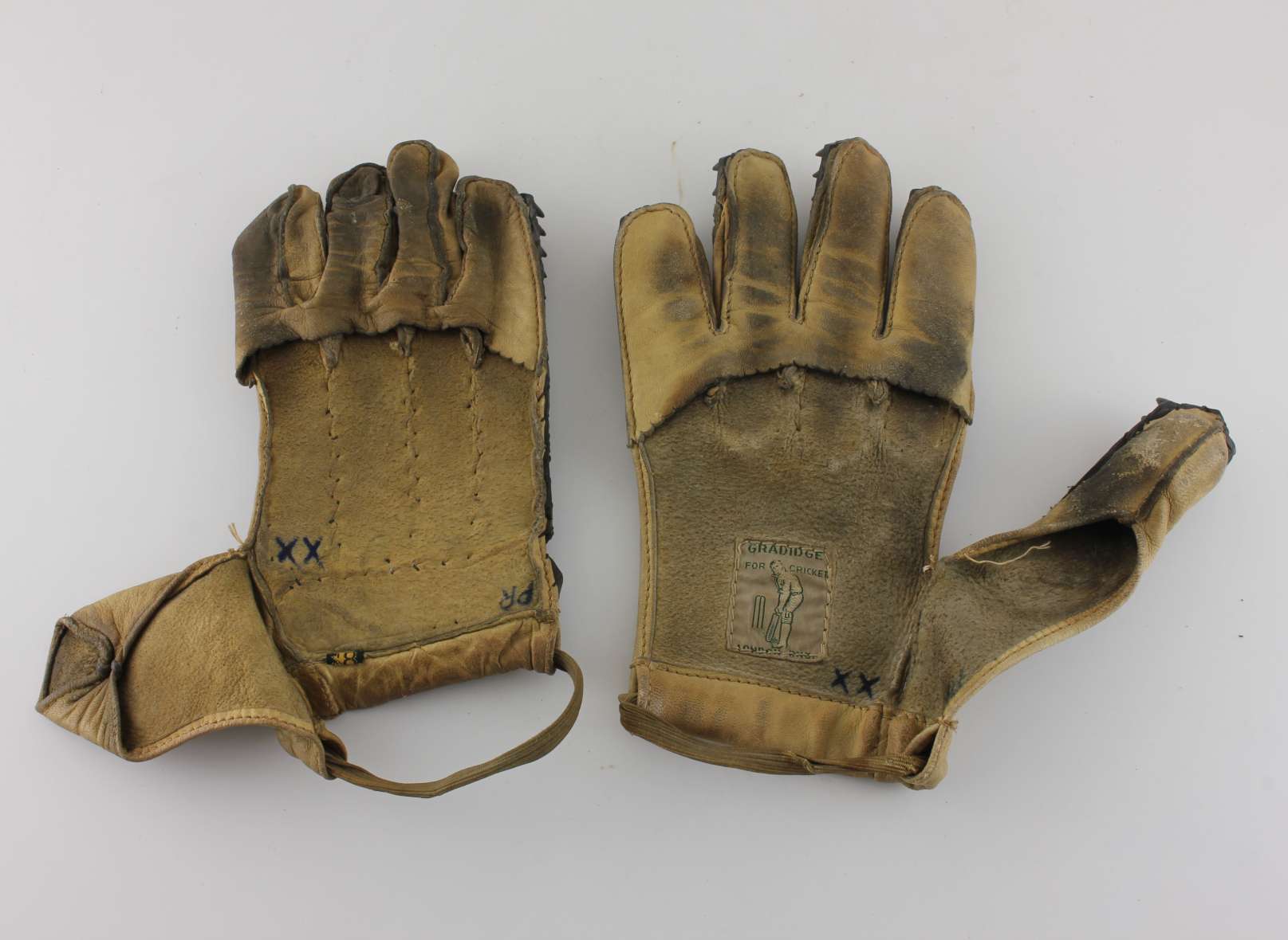 This wonderful original pair of leather cricket gloves which date from c1930 have spiked hand / finger protection and feature the Gradidge for Cricket label on the inside.