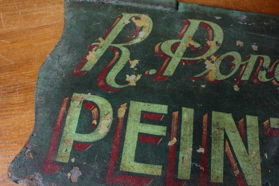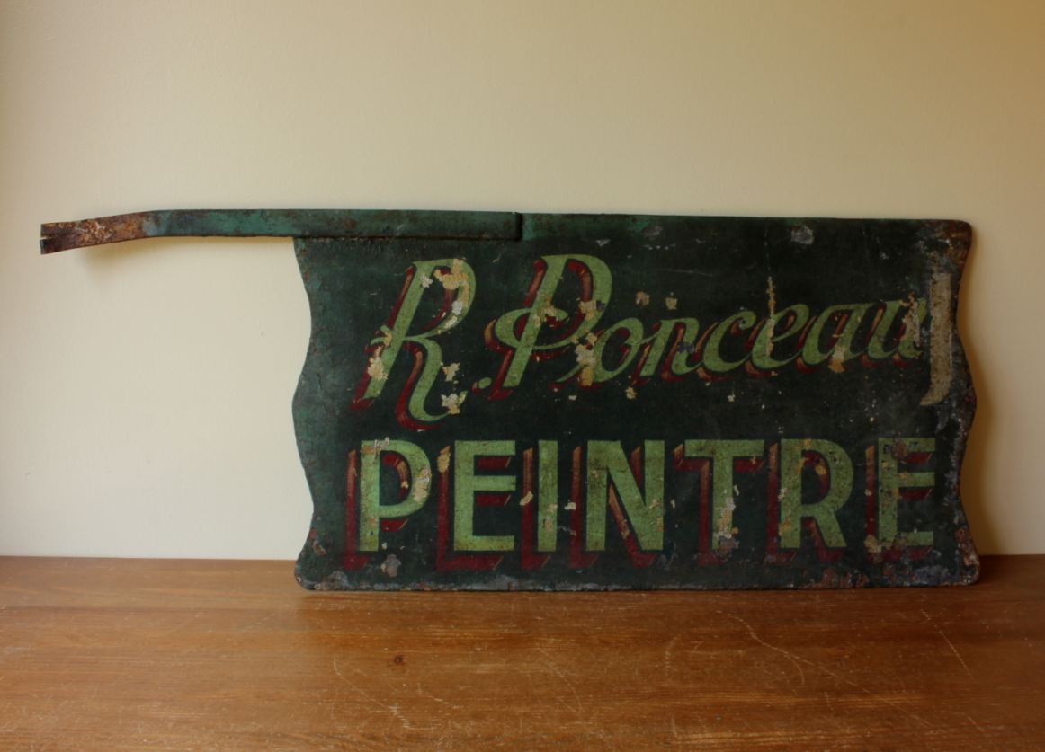 This French tradesman's sign which is made of metal has a painted green background, has the wording R Ponceau Peintre hand painted to each side in green and red and dates from c1900.