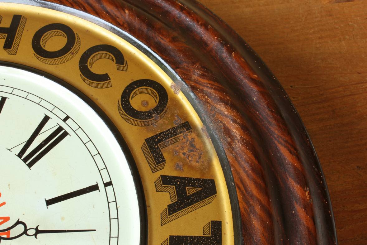 A highly decorative advertising clock that has lots of charm and would make a wonderful feature in a cafe, Pattisserie, chocolate shop or kitchen.