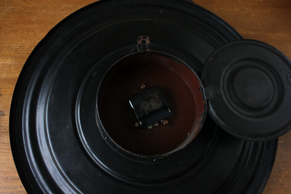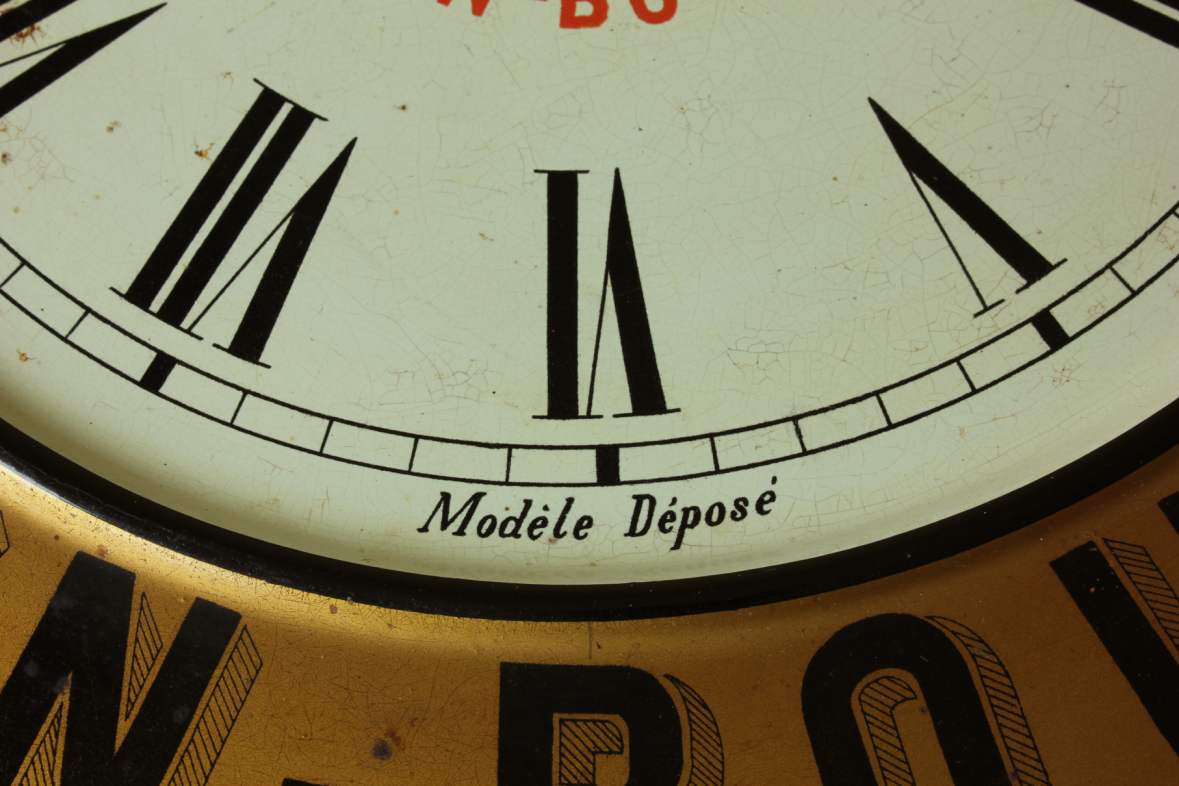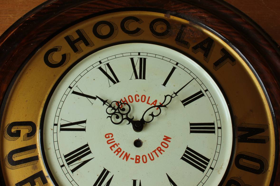 This stylish chocolate advertising wall clock which dates from c1930 is made of embossed painted metal and would have originally been hung in a French Cafe to advertise Guerin Boutron Chocolat.