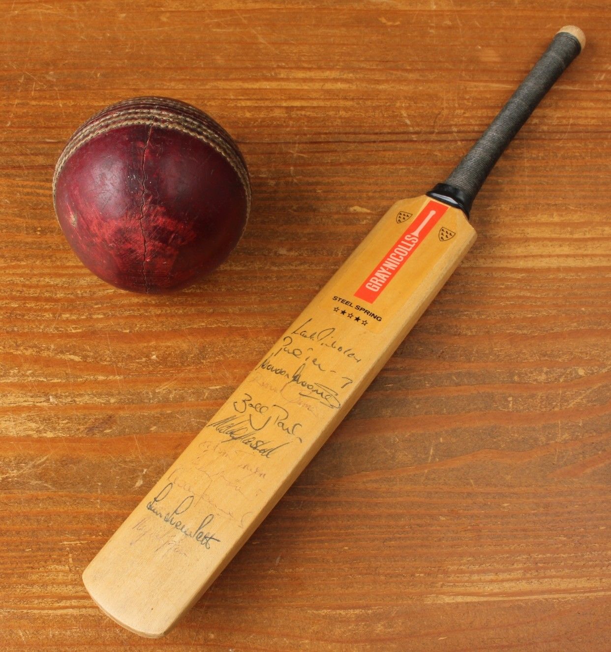 This miniature Gray Nicolls steel spring cricket bat has been signed by a Hampshire 1980's cricket team and bears their original signatures in pen.