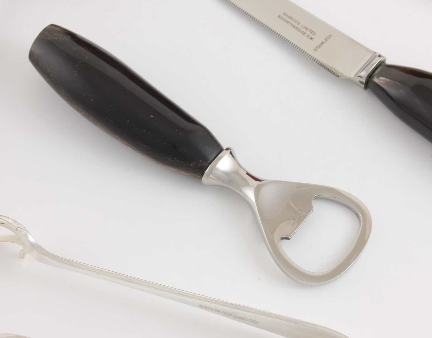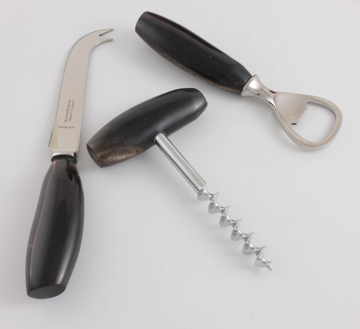 This complete set contains a buffalo horn handled corkscrew, bottle opener and fruit knife along with a silver plated spoon and pair of bird claw ice tongs.