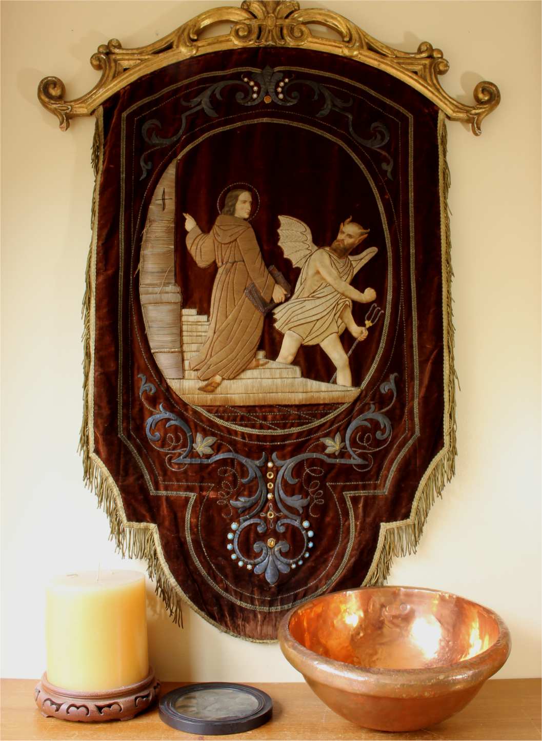 This religious procession banner has a velvet background with gold braid fringing and is decorated with different semi precious stones such as pearls and turquoise. The central scene of the devil and the saint pointing to heaven have wonderful detail such as padded bodies which give a 3D effect, braid stitching and painted faces.