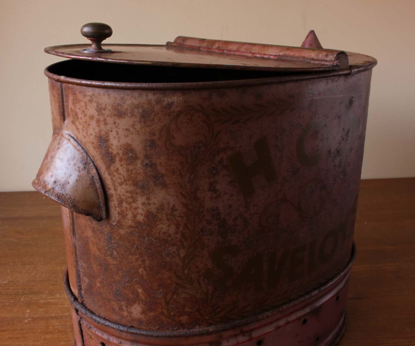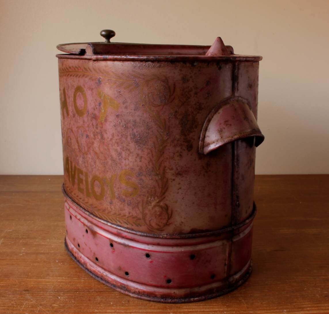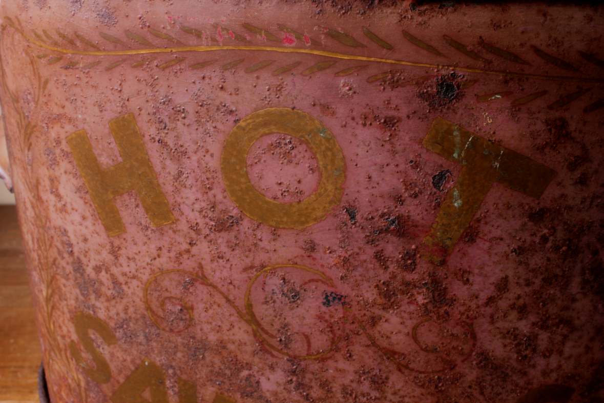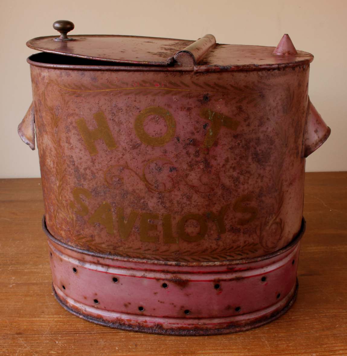This fabulous street vendor's toleware Hot Saveloy warmer which dates from the late 19th / early 20th century is painted using gilt paint with Hot Saveloys to the front, has a lift up lid with a brass knob from where to serve the sausages, a small air vent chimney and has a lower hot water compartment.