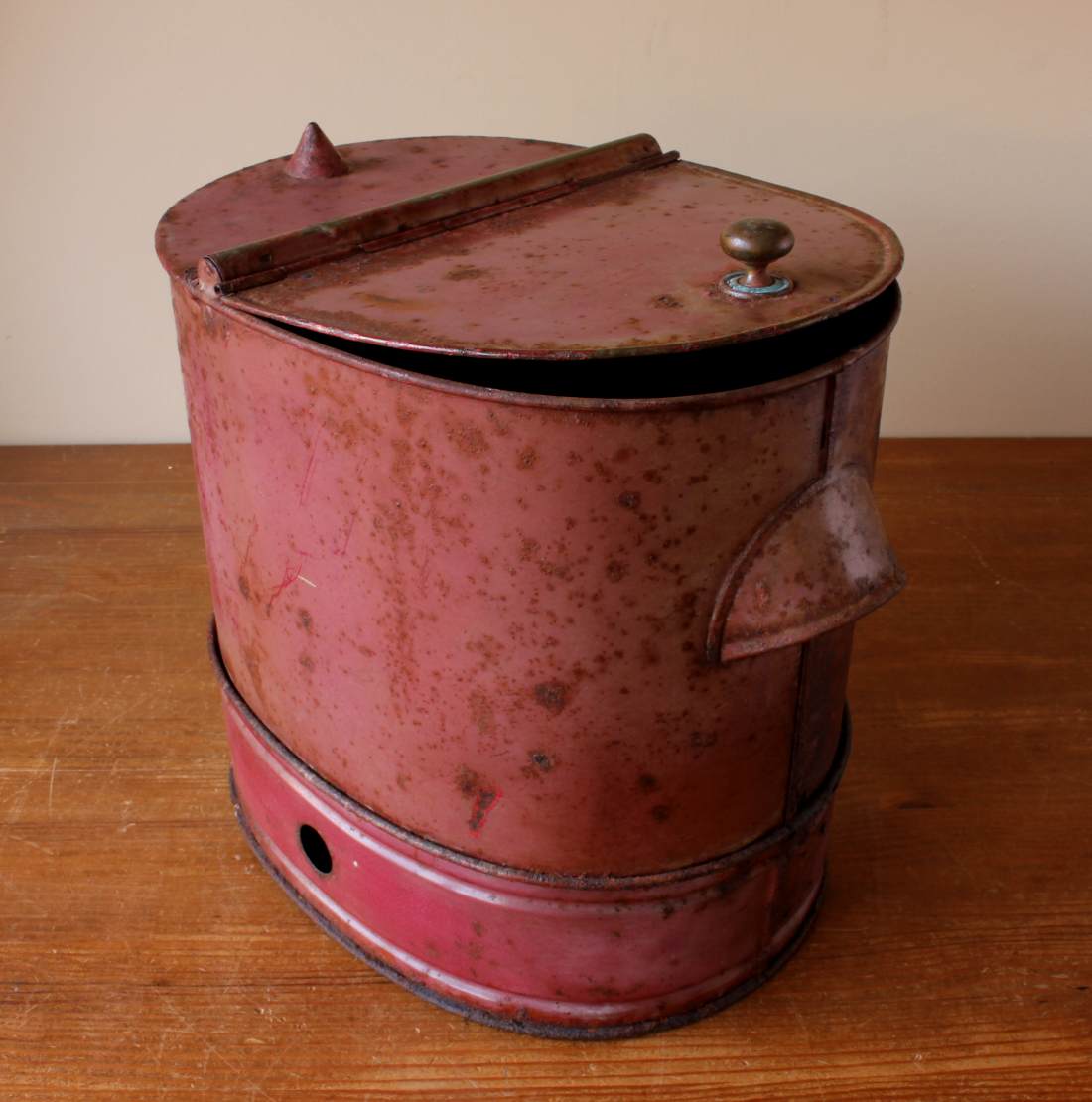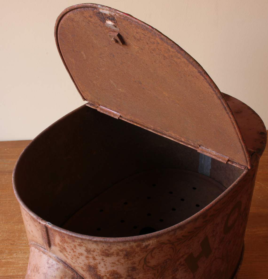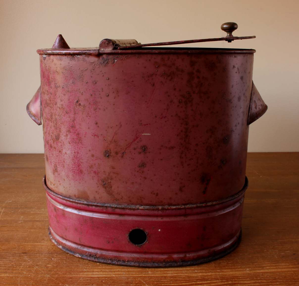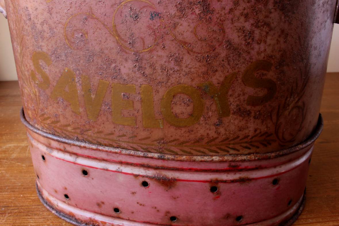 This fabulous street vendor's toleware Hot Saveloy warmer which dates from the late 19th / early 20th century is painted using gilt paint with Hot Saveloys to the front, has a lift up lid with a brass knob from where to serve the sausages, a small air vent chimney and has a lower hot water compartment.
