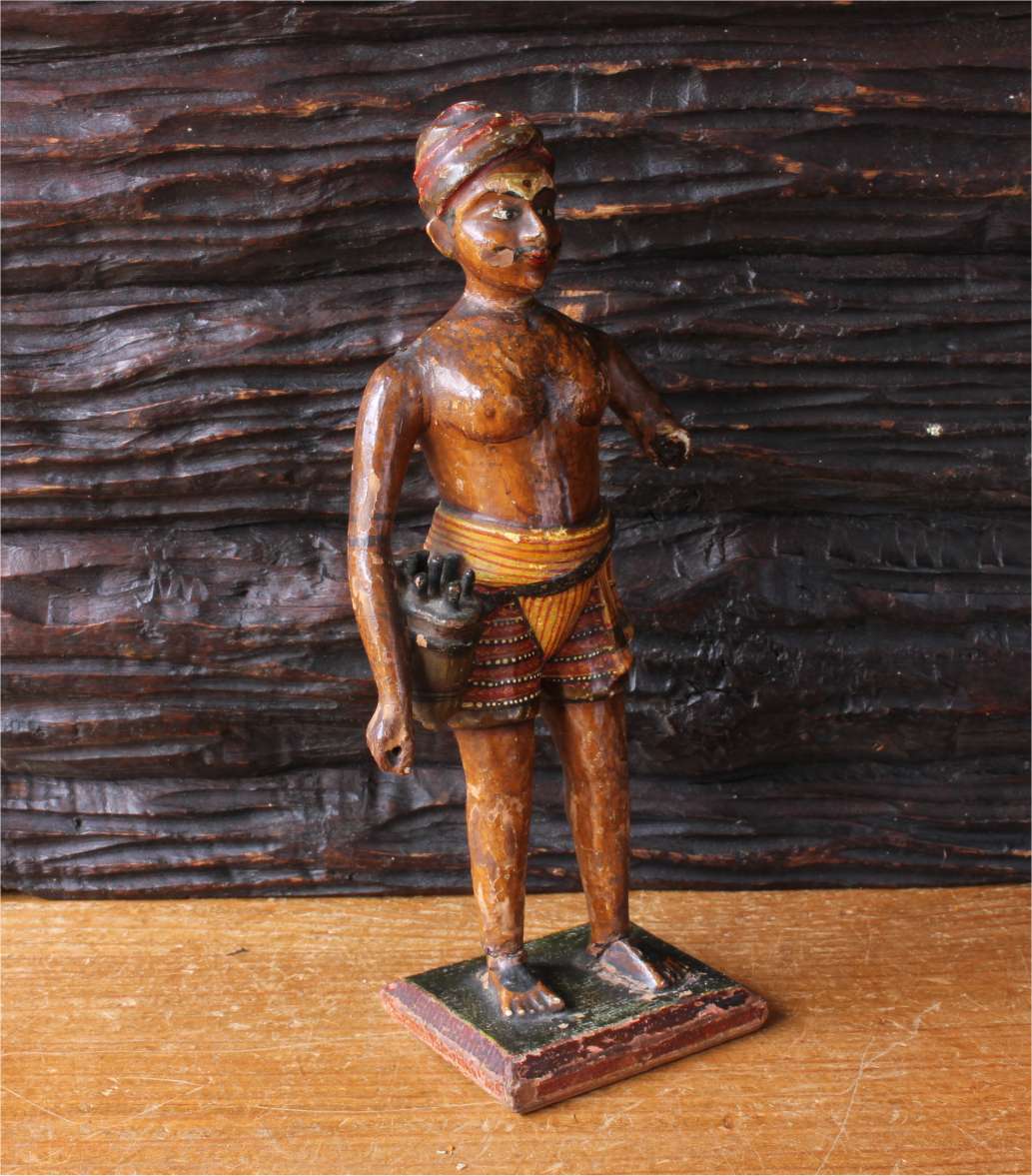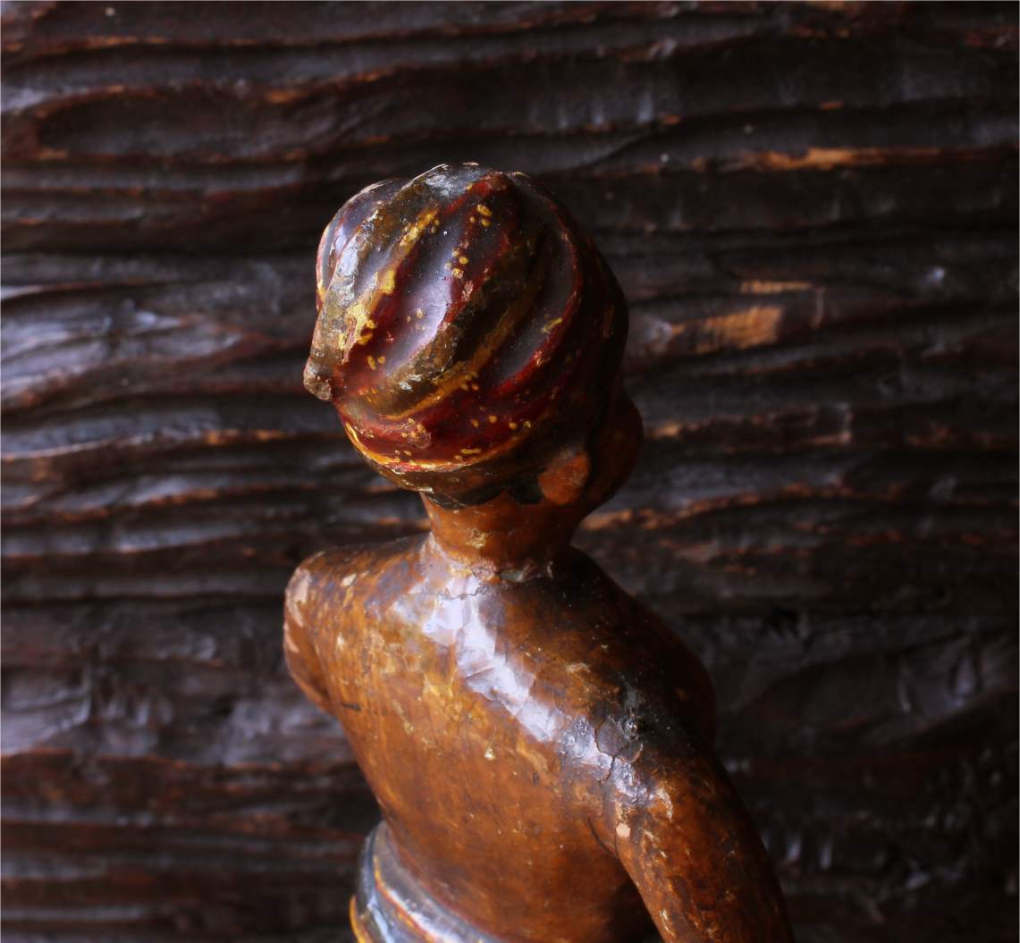This polychrome figure which is beautifully handmade has good detail, sits on his wooden base which has a label to the underside and with it's aged wear is a charming piece that would look great on display.