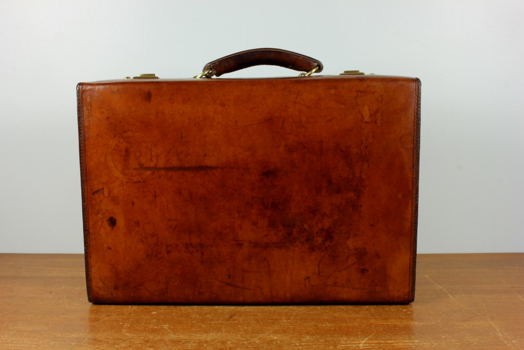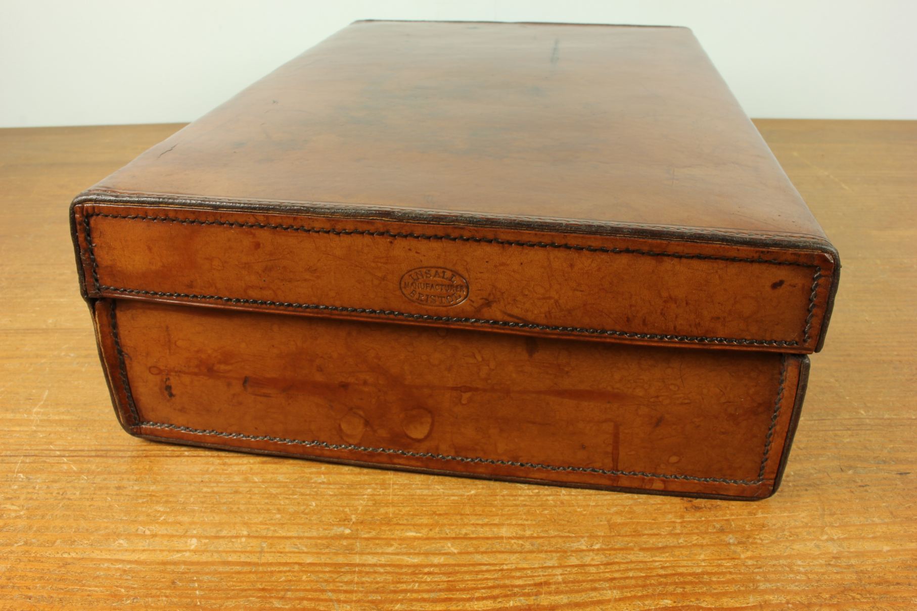 This antique attache case is strong and durable being made from high quality leather, has it's front lower corners shaped to fit inside the top lid, a stitched leather handle with sturdy brass fittings, two brass locks/clasps and is embossed to both ends of the lid with Insall Bristol Manufacturer.