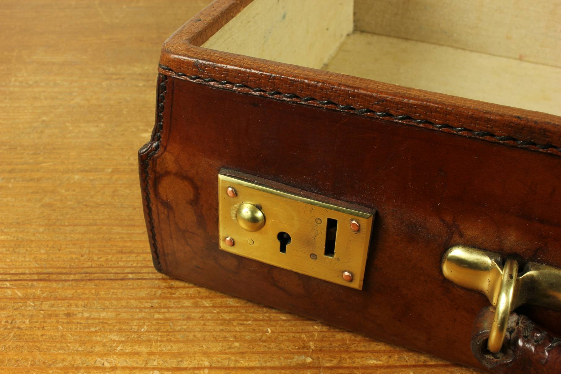 Condition: Excellent used antique condition with signs of use in keeping with age. The case is very sound and usable with good stitching, strong handle and corners. Lock clasps work but we do not have the key. One clasp springs open but the other does not. Some staining to inside lining. Please see pictures.