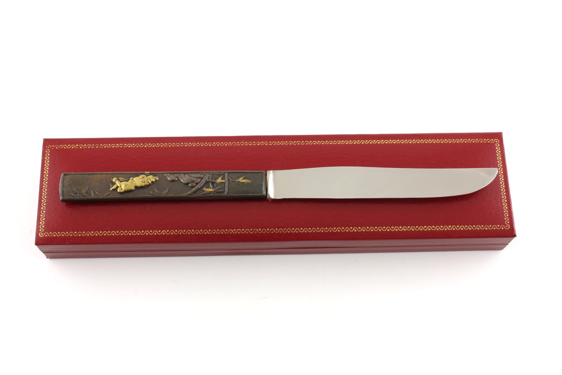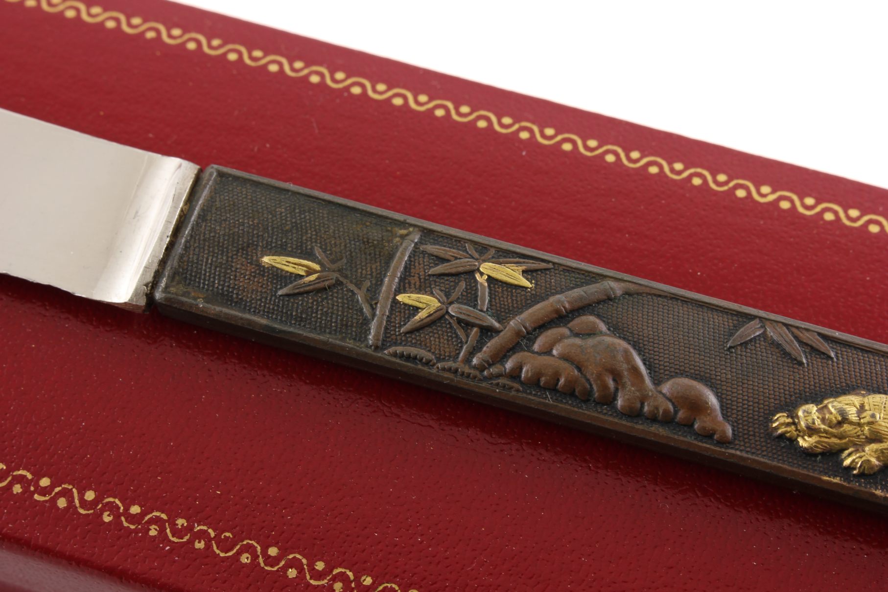 This antique Japanese letter opener which has a bronze Kozuka handle has a silver blade that is marked with a fish type character and dates from the Meiji period.