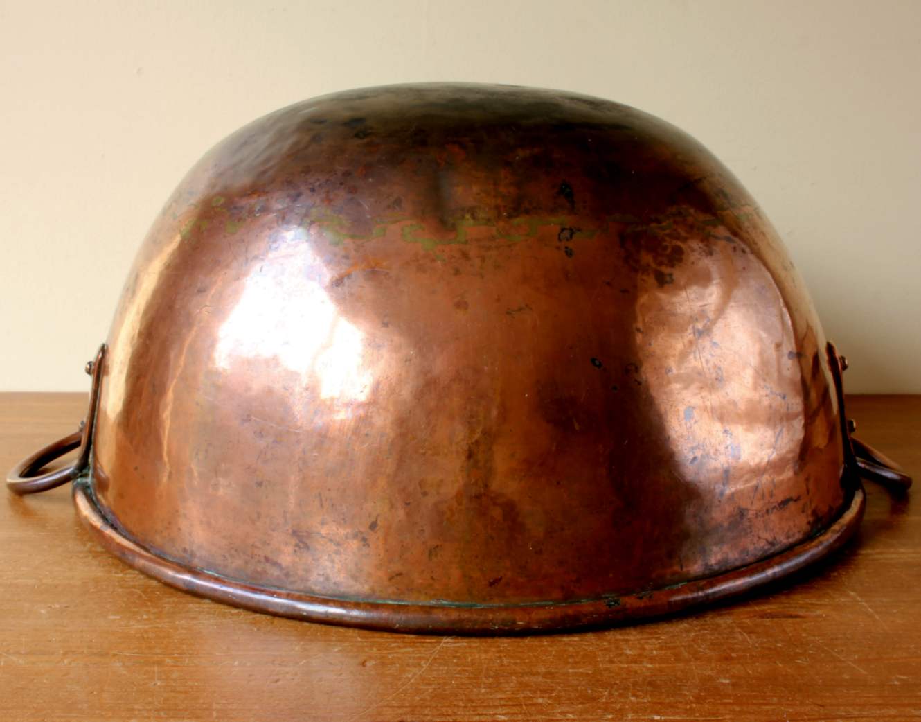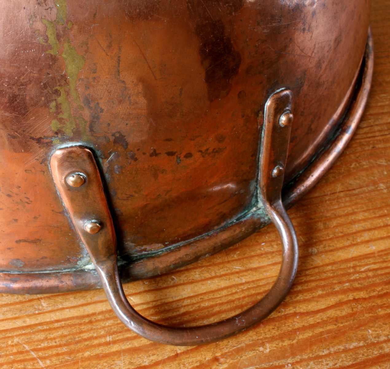 This antique chocolate mixing bowl which is a large size dates from the 19th century, is made of heavy copper, has a rolled rim, two riveted handles and a round bottom. The handmade folded seam runs around the base and up the side.