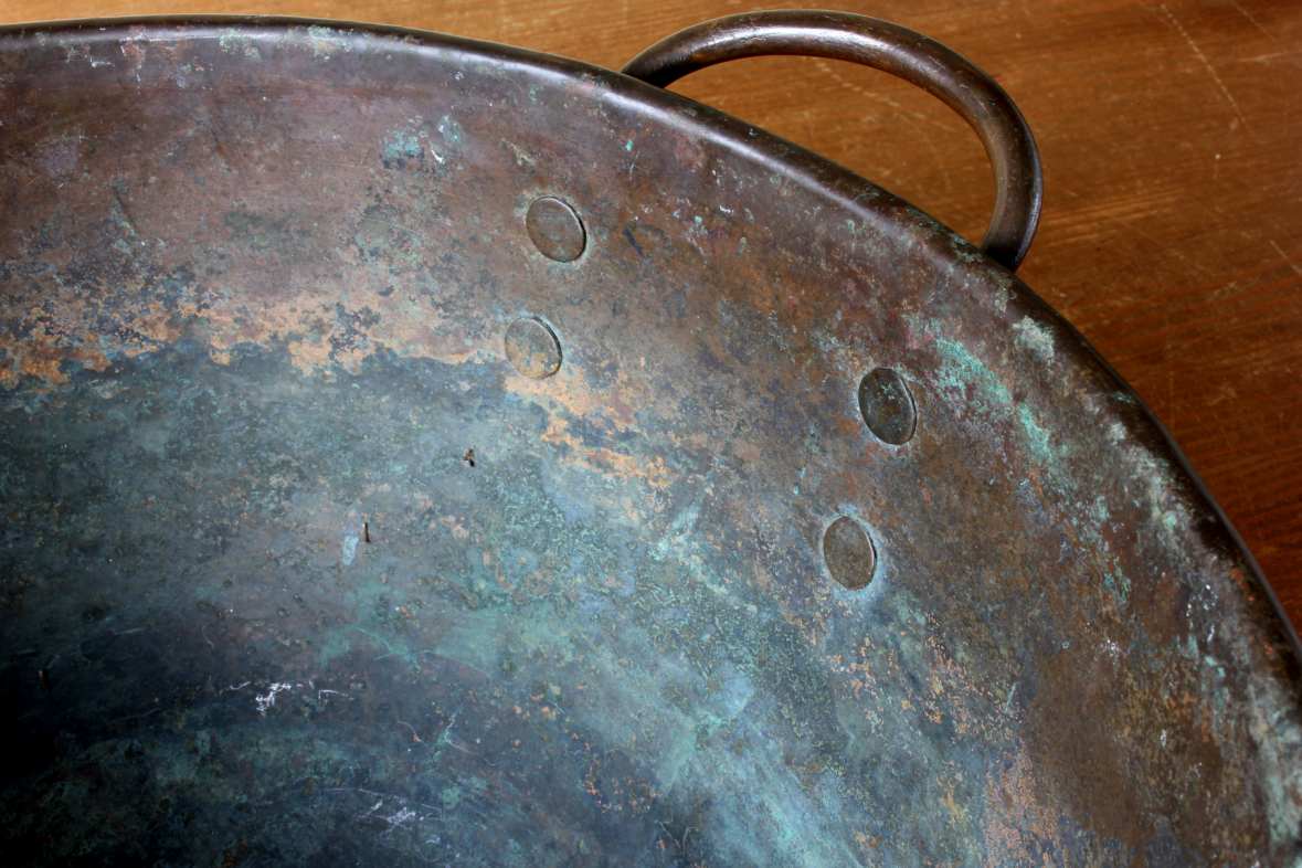 Condition: Wonderful decorative antique condition with signs of wear and use in keeping with age. No holes. Some dents, dings, bumps, scratches, verdigris and patina. The bottom is rounded and is blackened from the heat. The bowl sits on a flat surface but slightly uneven. Please see pictures.