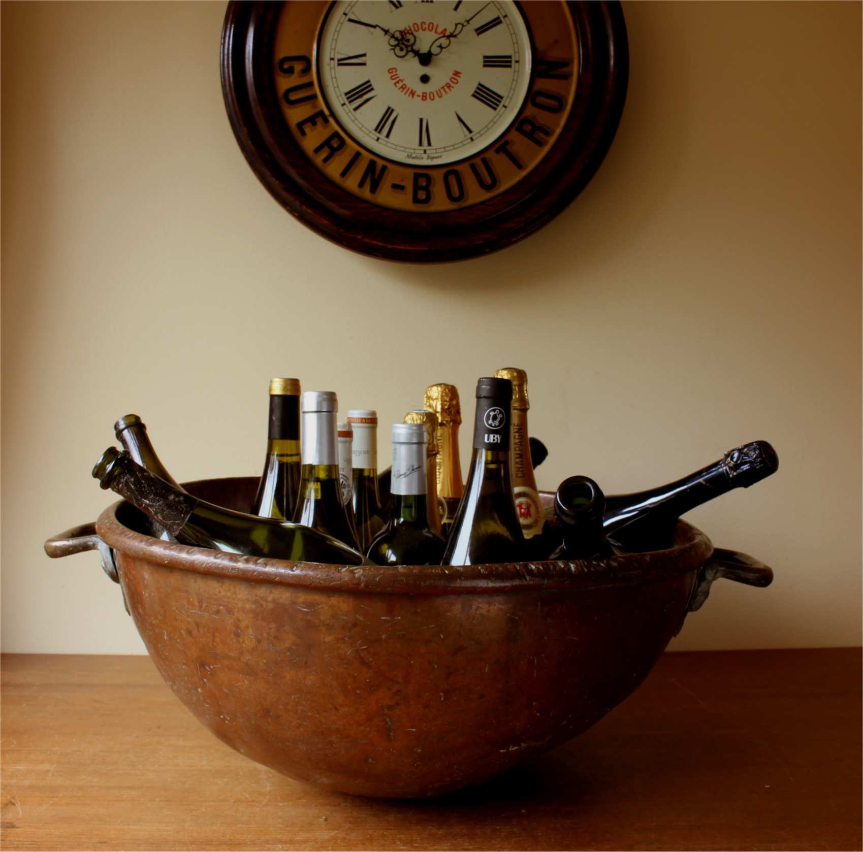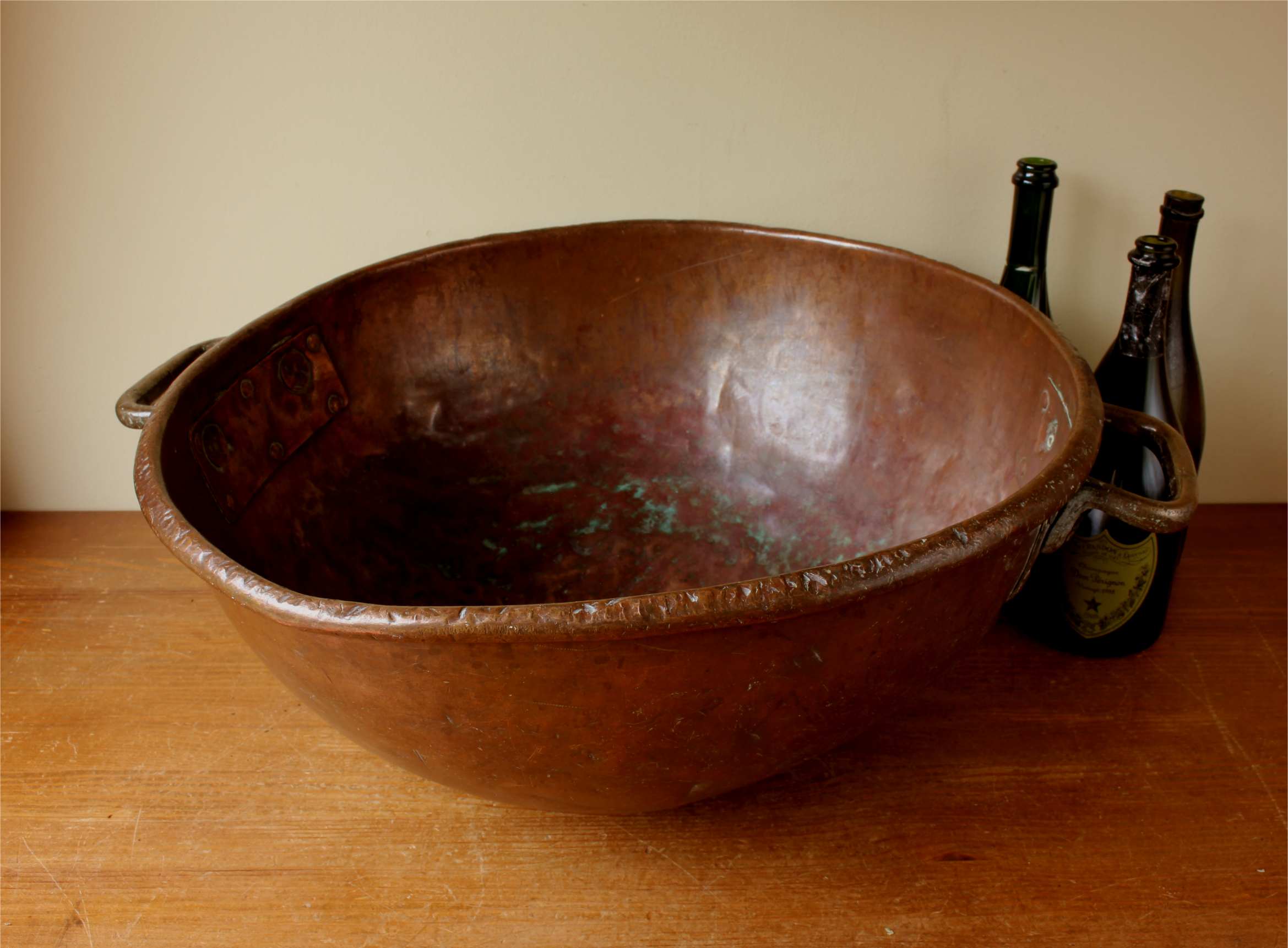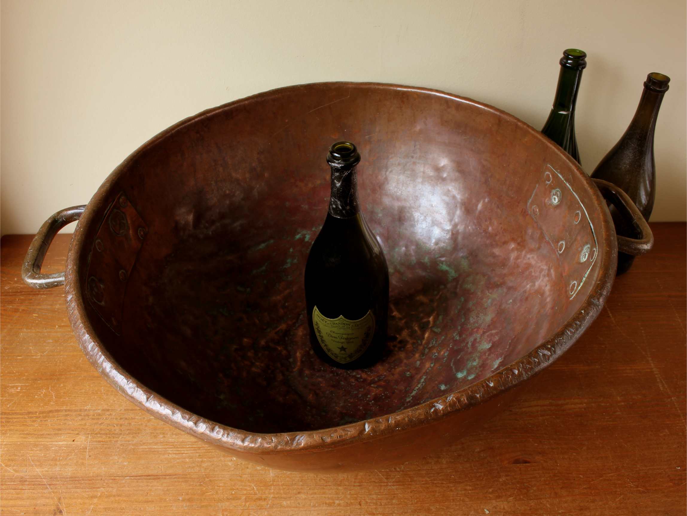 This huge antique chocolate mixing bowl which makes a stunning wine cooler is a very large size, made of heavy copper and dates from c1900.