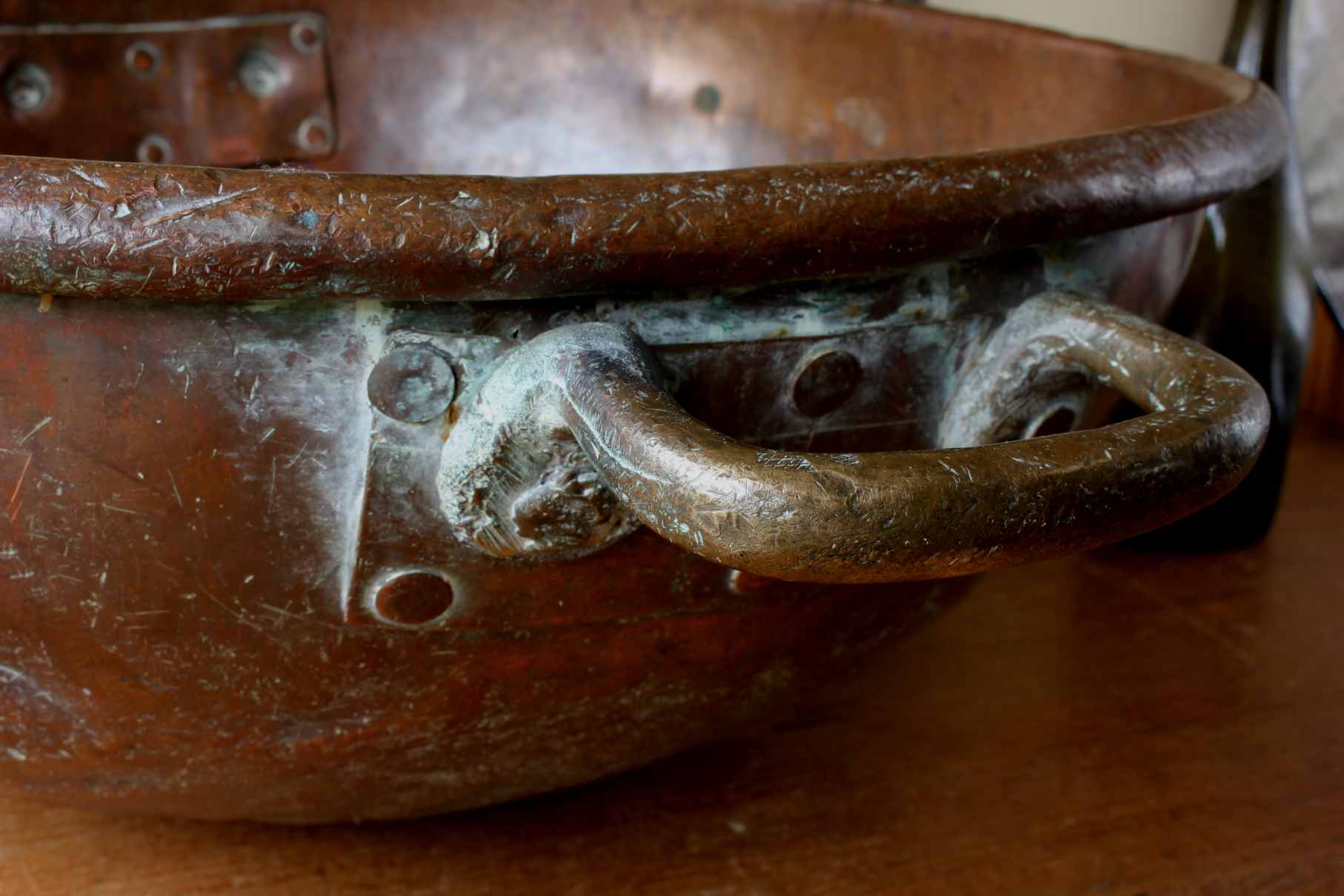This fabulous handmade copper bowl has a round bottom, rolled rim, two riveted brass handles and is a heavy weight.
