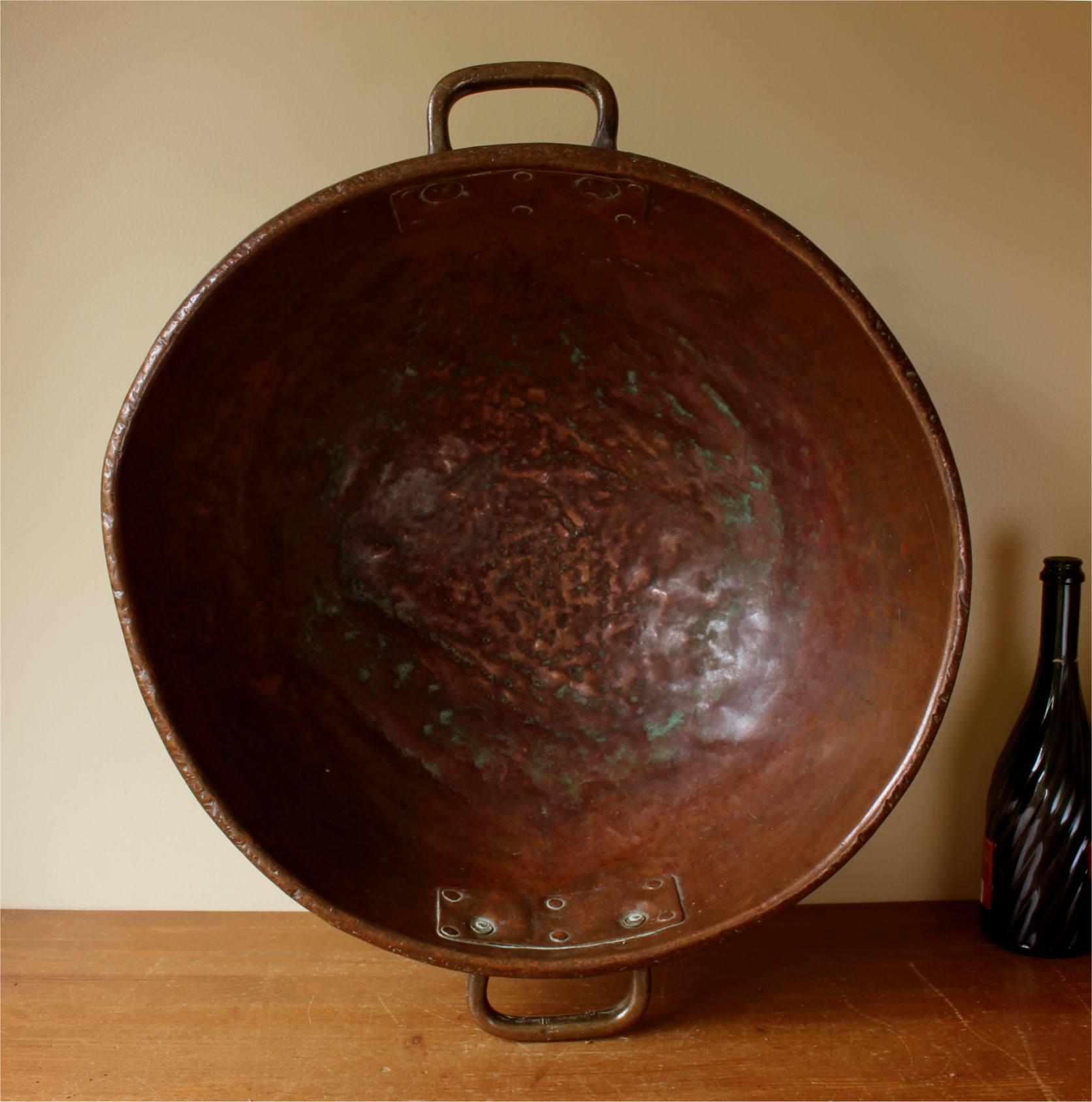 Condition: Wonderful decorative antique condition with signs of wear and use in keeping with age. No holes. All over dents, dings, bumps, scratches and verdigris leaving a wonderful patina. The bottom is rounded but sits on a flat surface. Please see pictures.