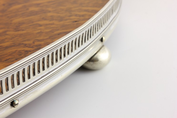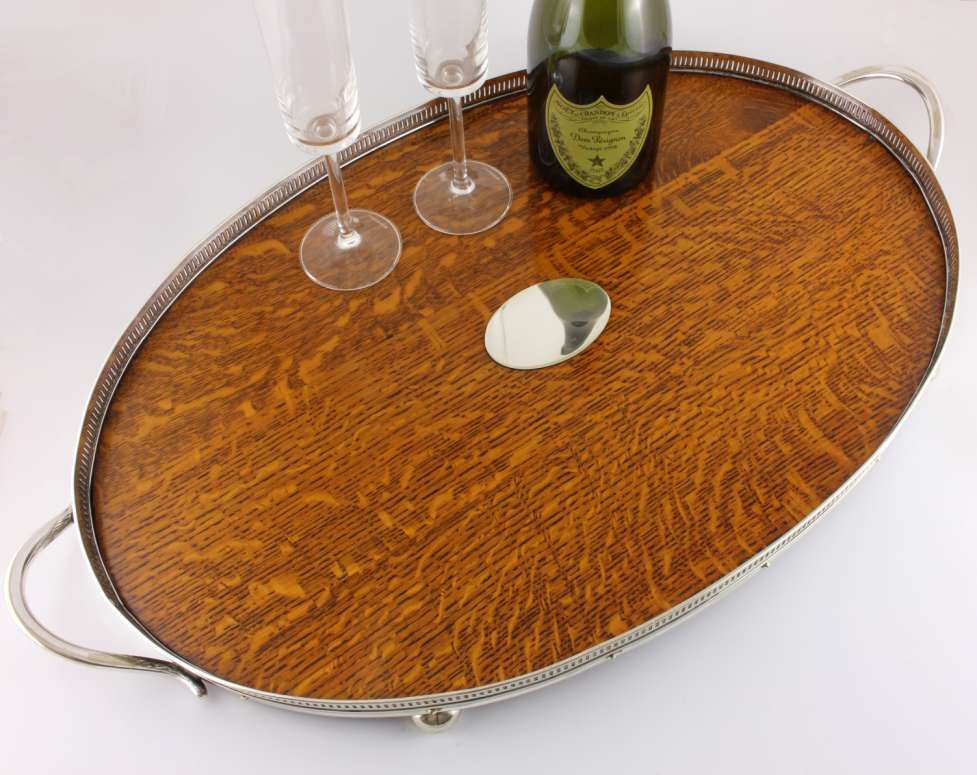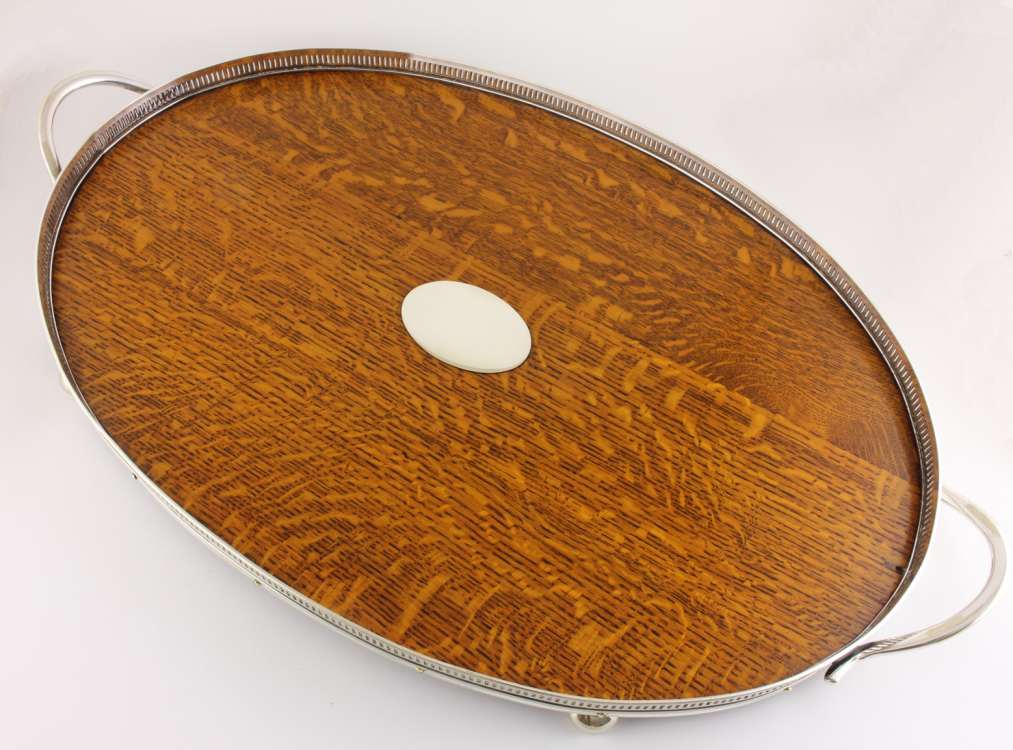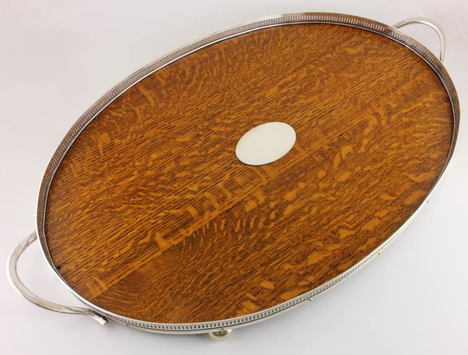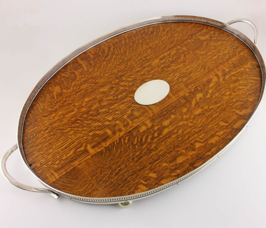 This wooden tray has fancy silver plated slatted gallery, two silver plated side handles, a central oval silver plated plaque which is blank so could be monogrammed if you so wish and sits on four bun feet.