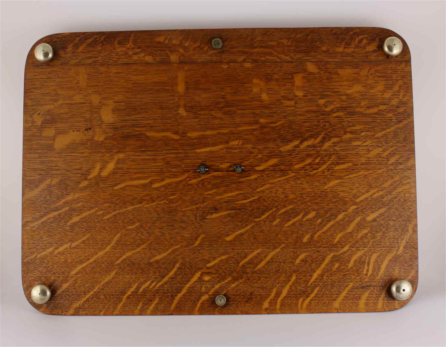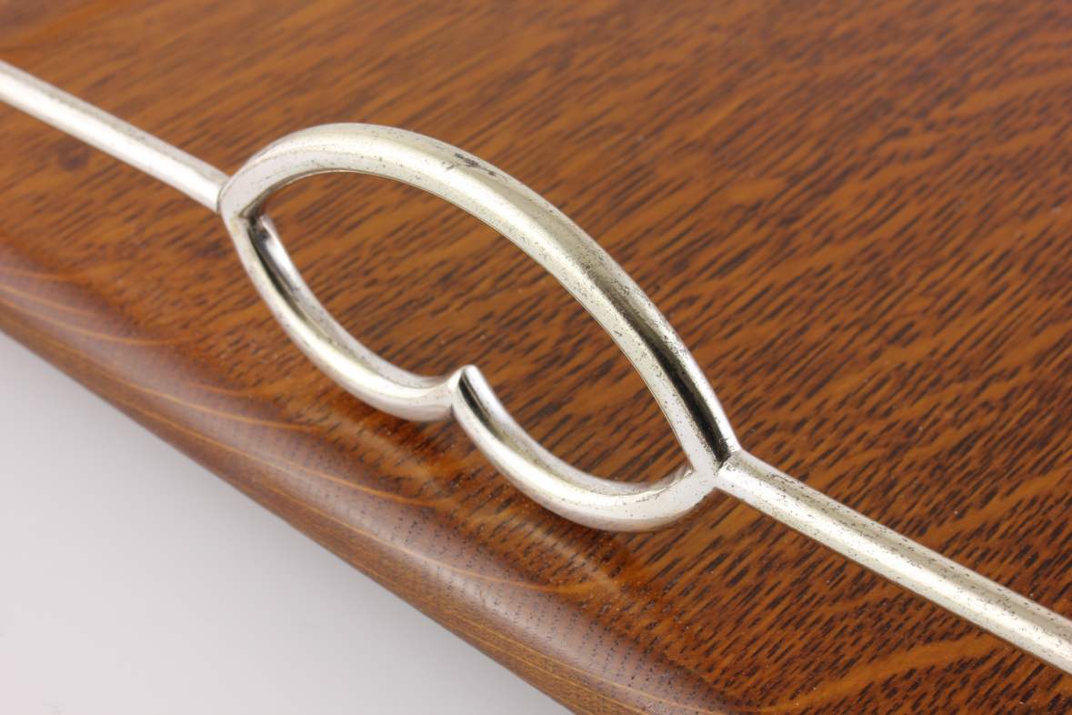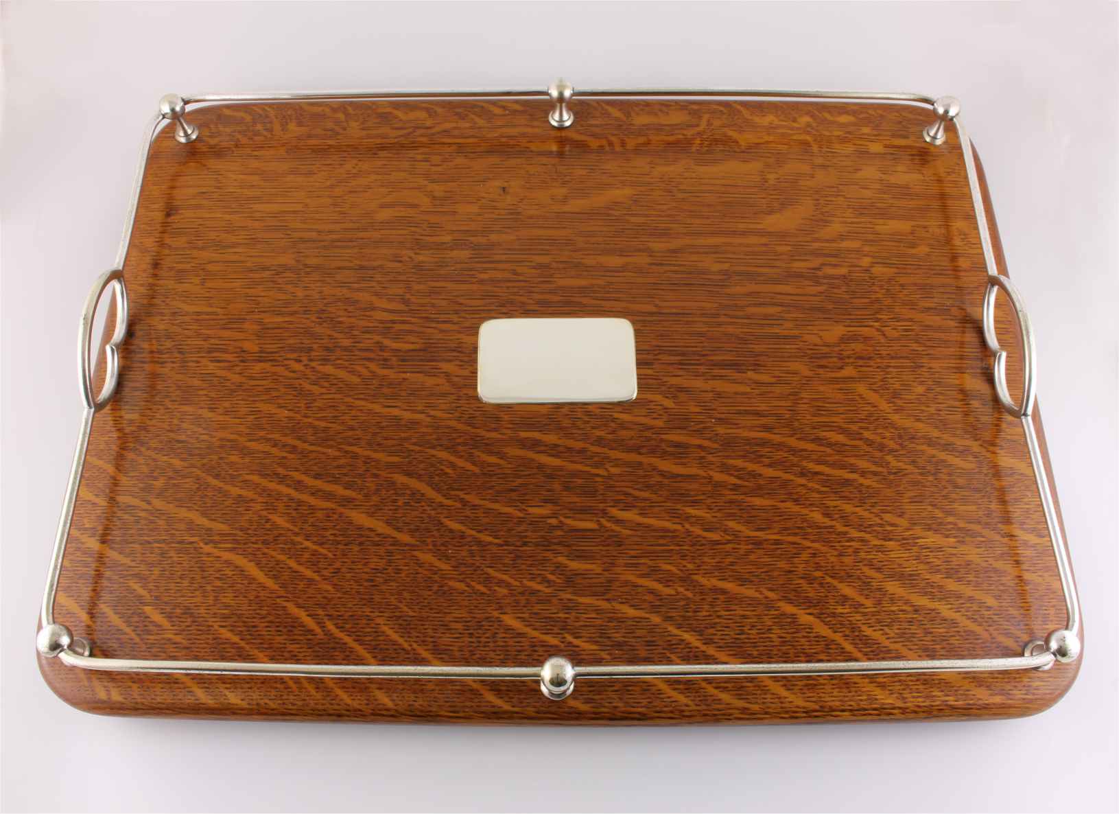 This stylish tray which is rectangular in shape is made of English oak with silver plated fittings and gallery.