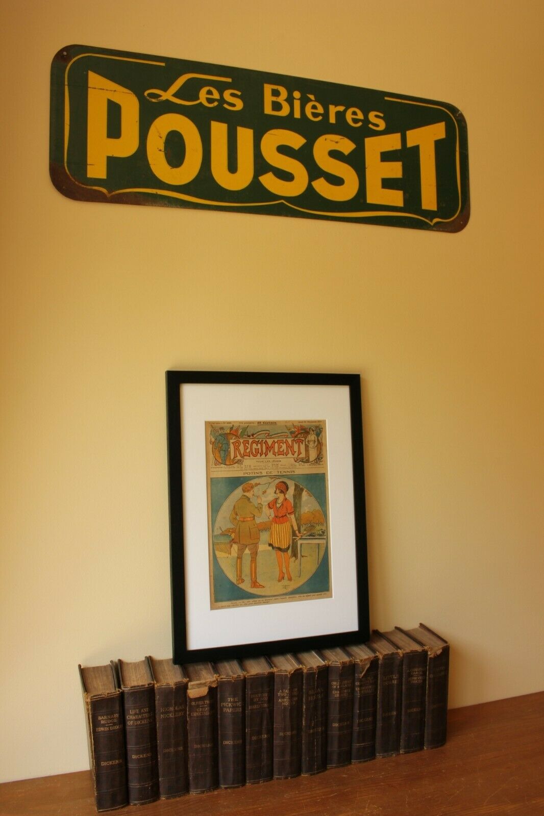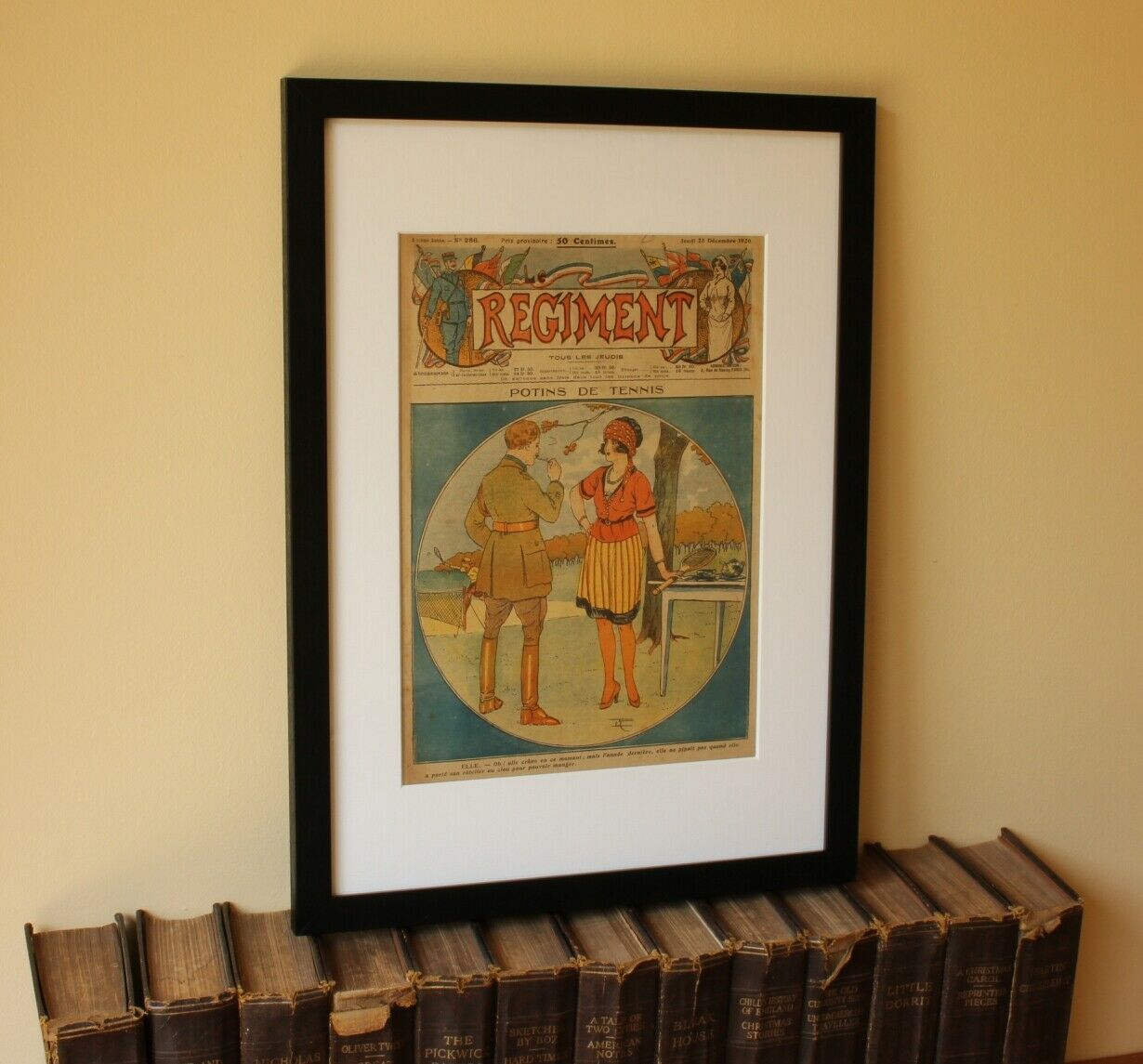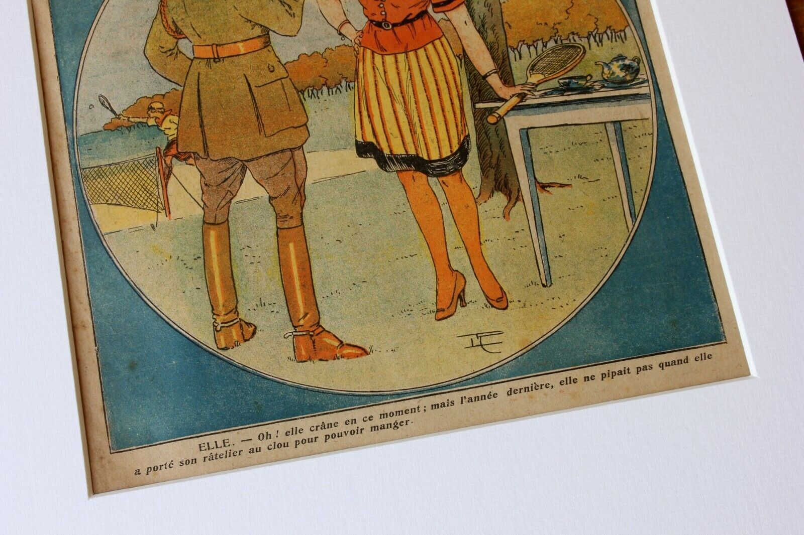 This stylish and scarce antique print is the front cover of the French magazine Le Regiment which was a light hearted magazine published weekly for the troops during WW1. This wonderful original picture which is from the 23 December 1920 edition is in colour and features a young lady about to play a game of tennis with somebody playing in the background.