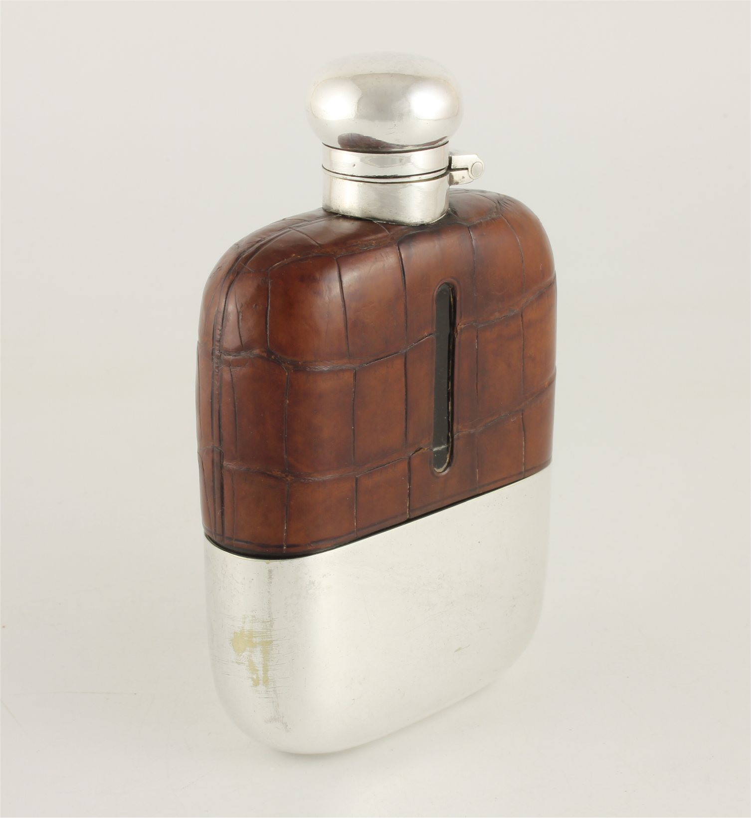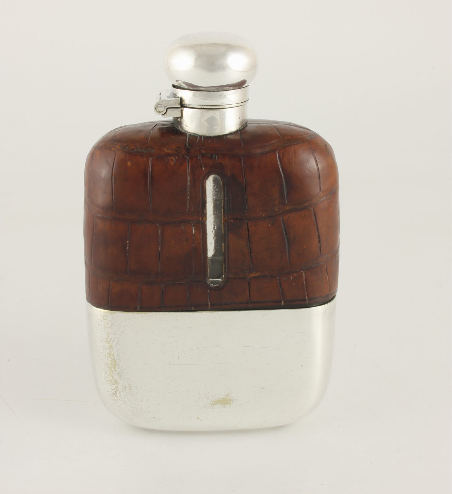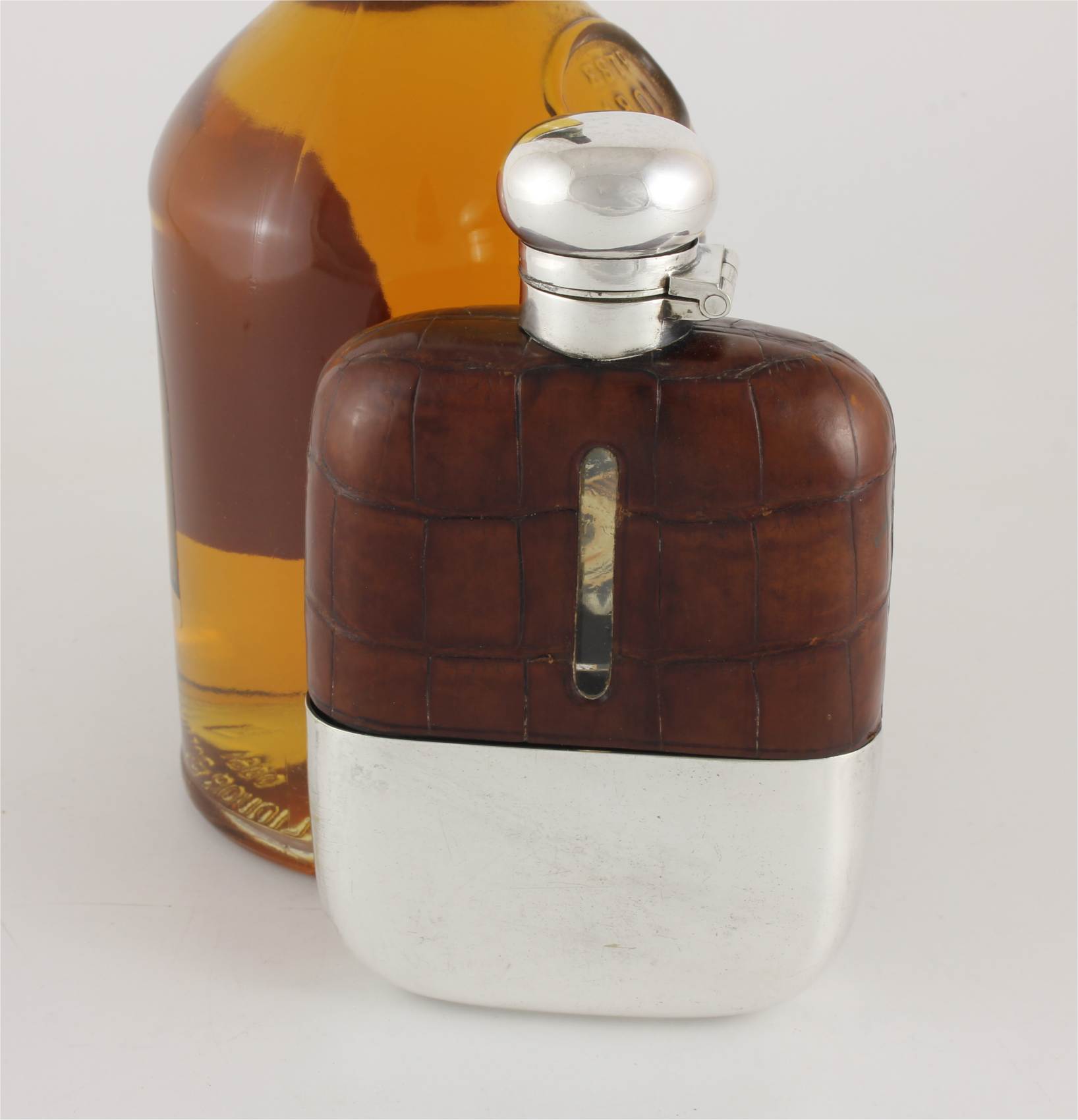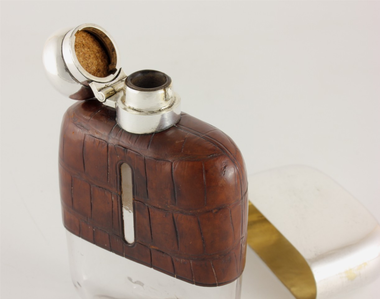 This antique glass spirit hip flask which dates from c1900 is covered in a handsome dark brown crocodile effect leather to the top half with a sight level to both sides.