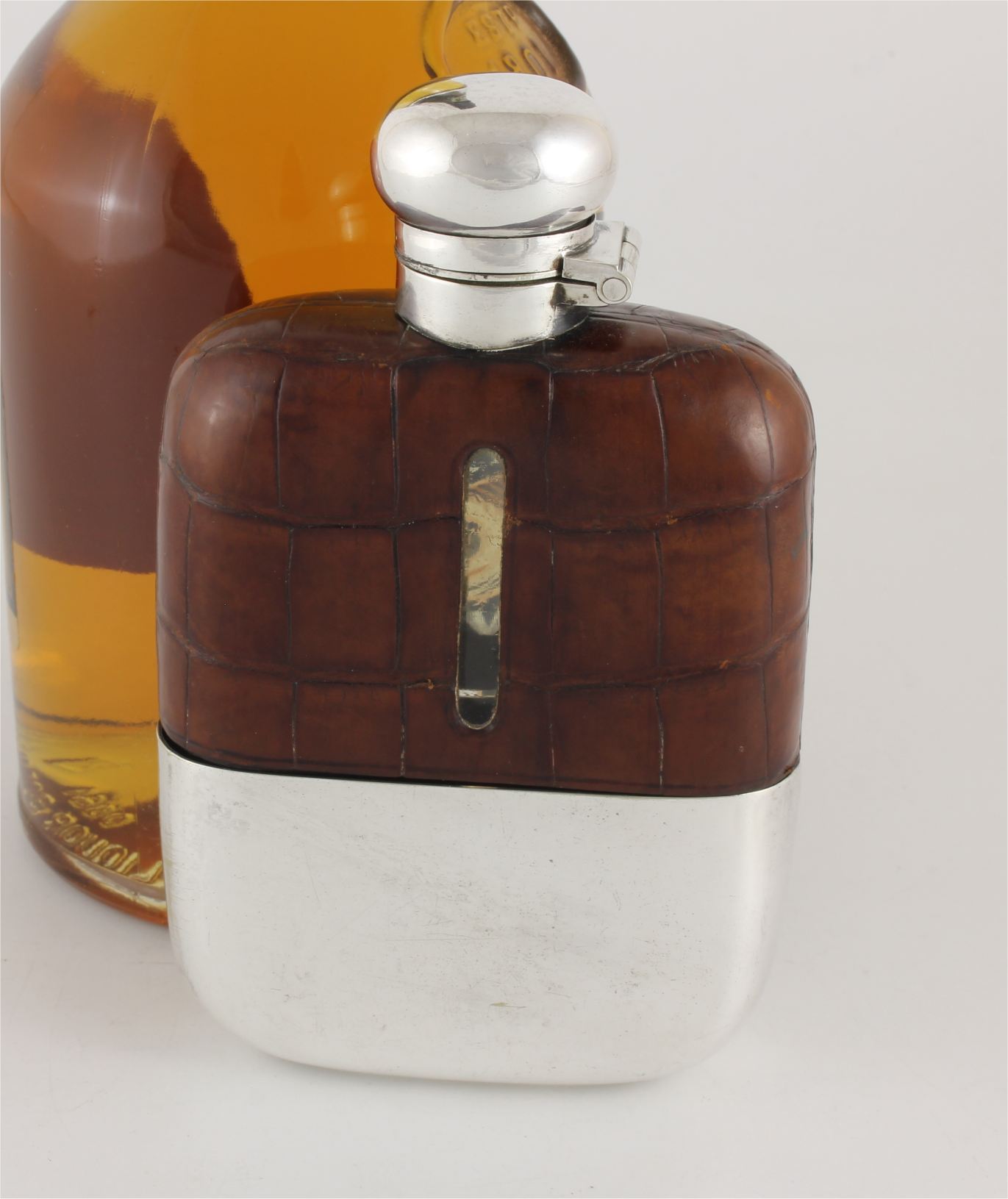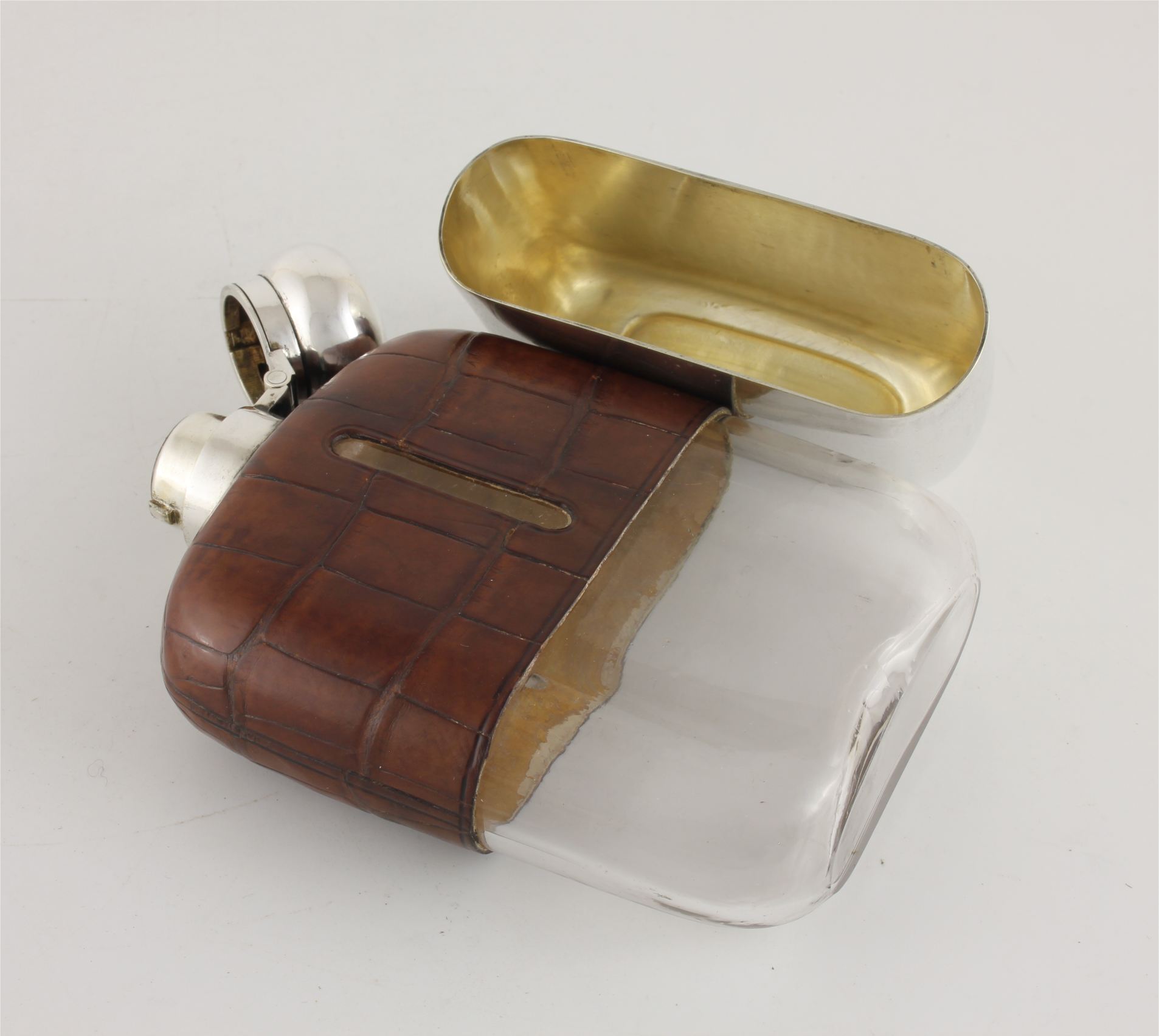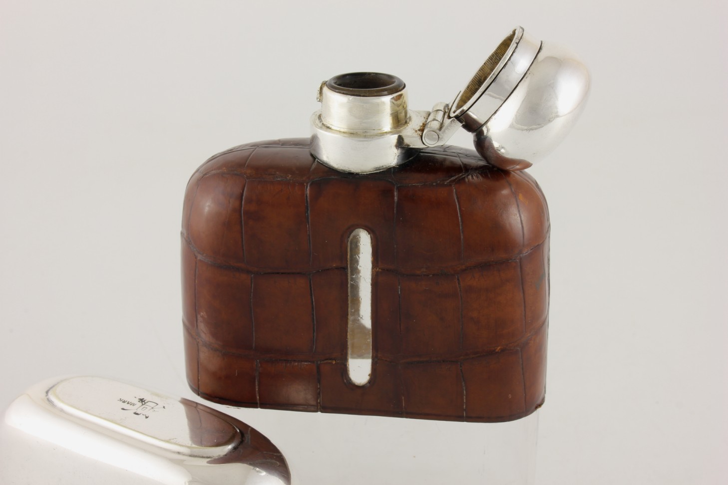 This antique glass spirit hip flask which dates from c1900 is covered in a handsome dark brown crocodile effect leather to the top half with a sight level to both sides.