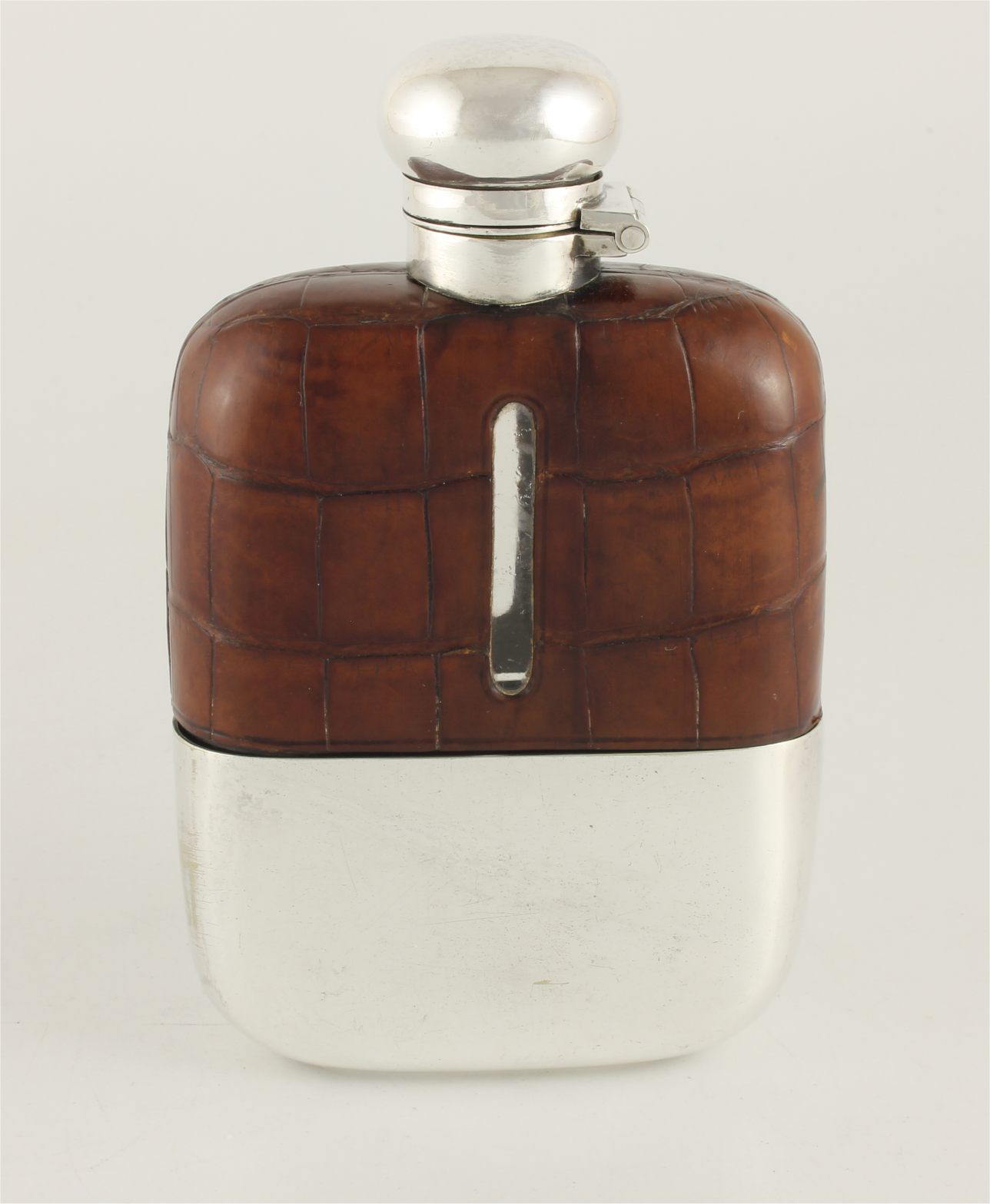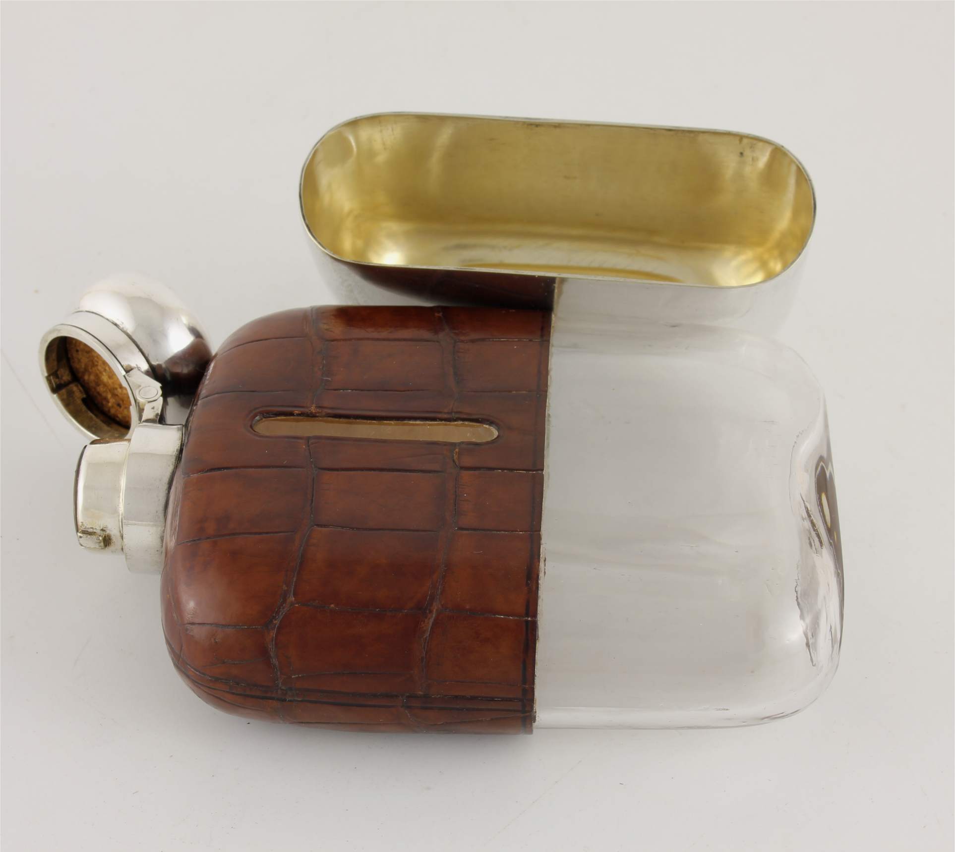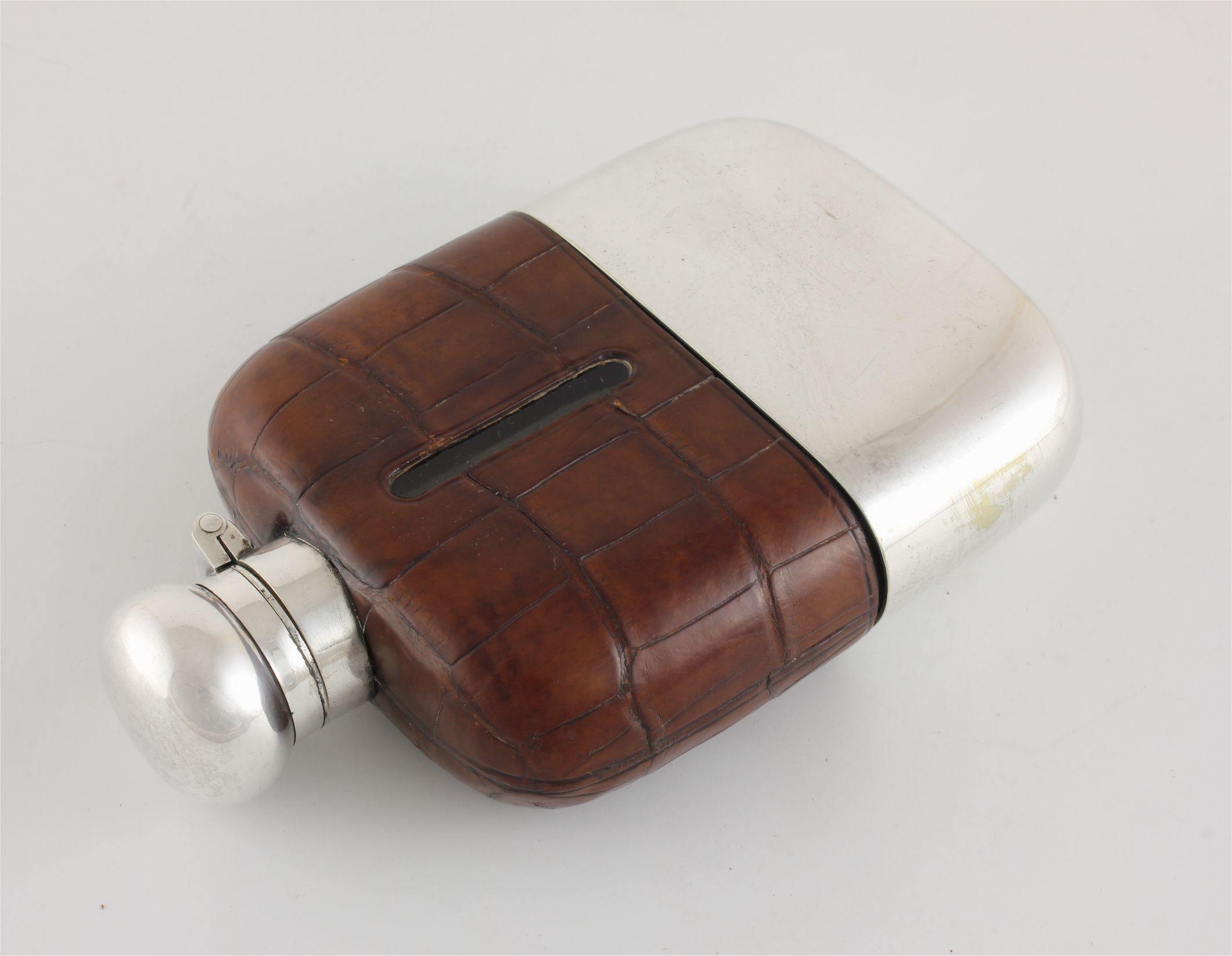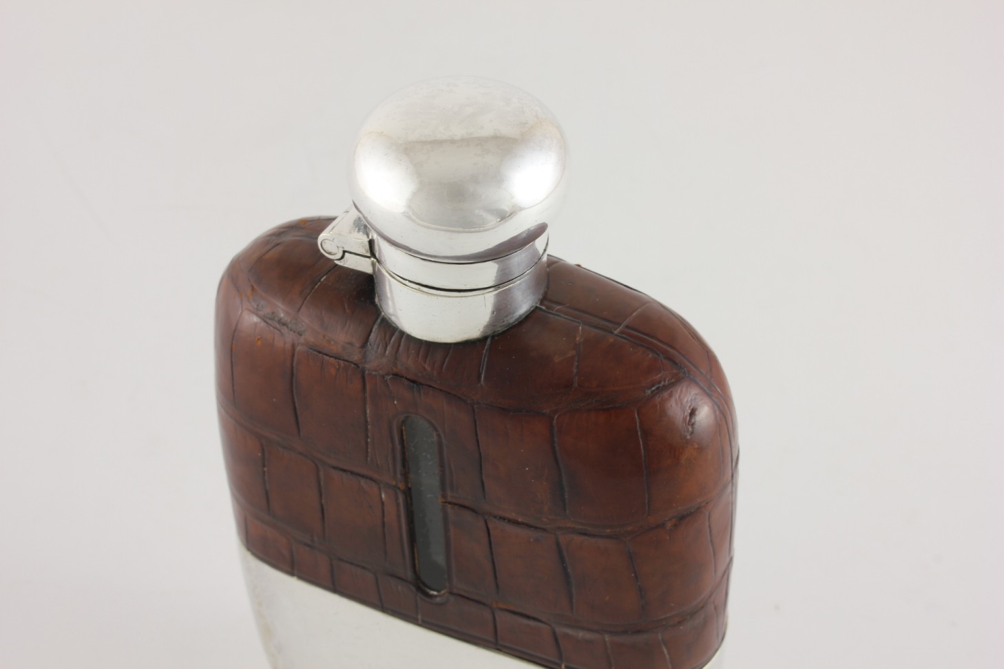 This antique glass spirit hip flask which dates from c1900 is covered in a handsome dark brown crocodile effect leather to the top half with a sight level to both sides.