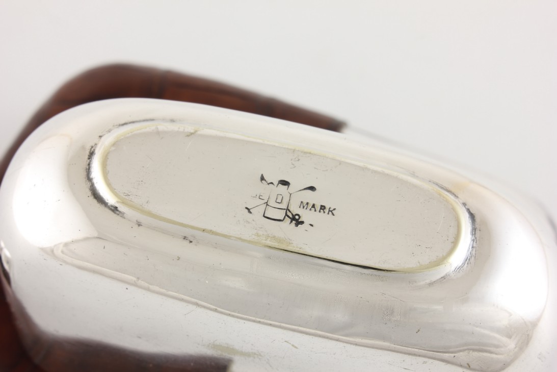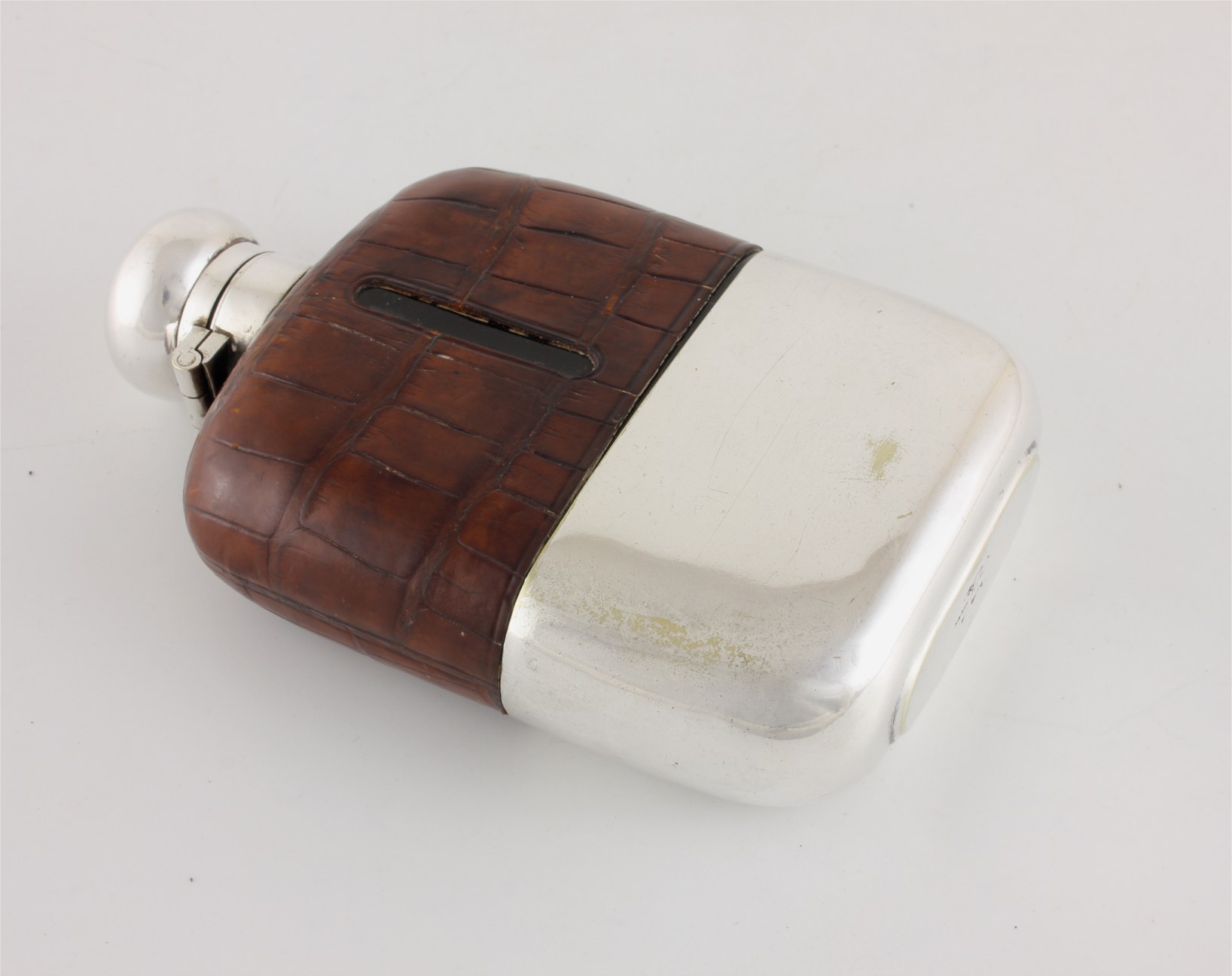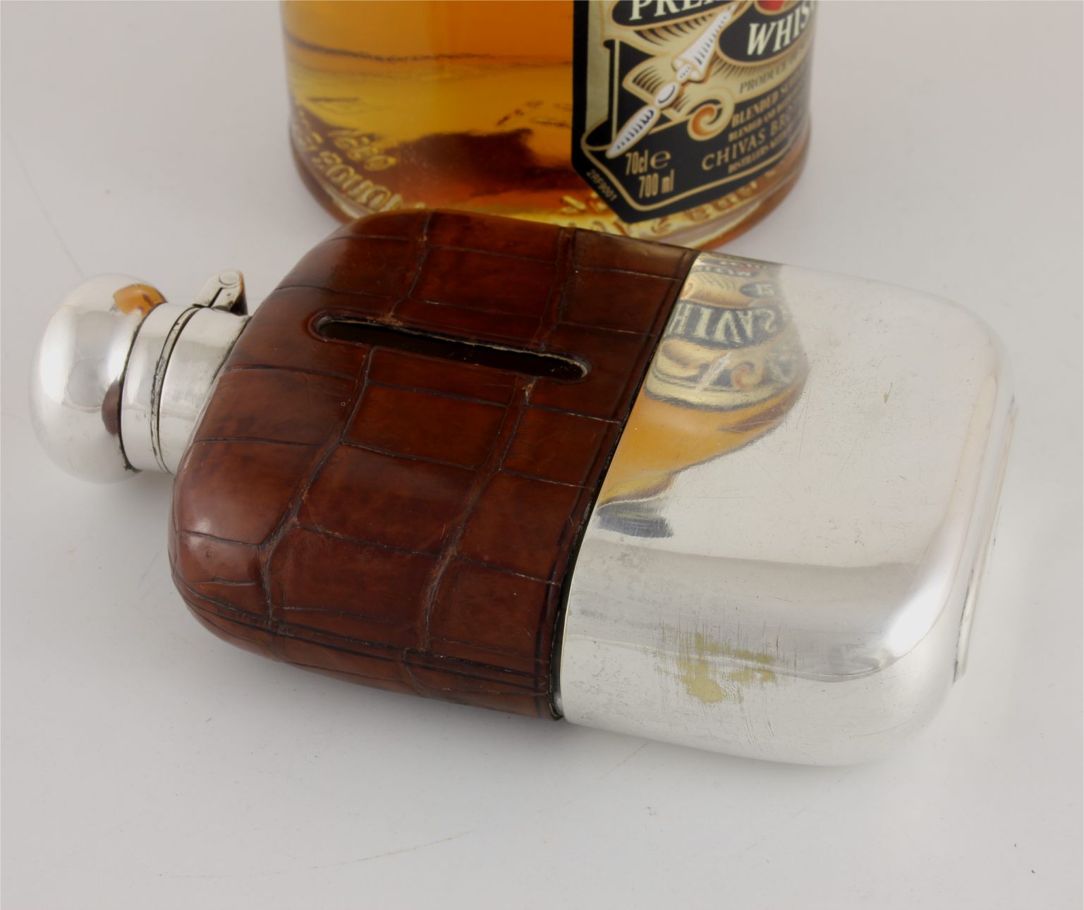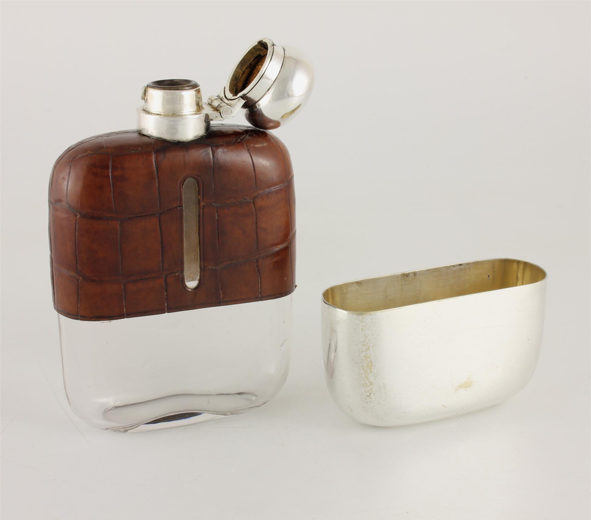 This handsome flask has a hinged flip / bayonet top which has a new cork fitted so does not leak and a detachable silver plated cup which is marked to the underside with the maker's mark.