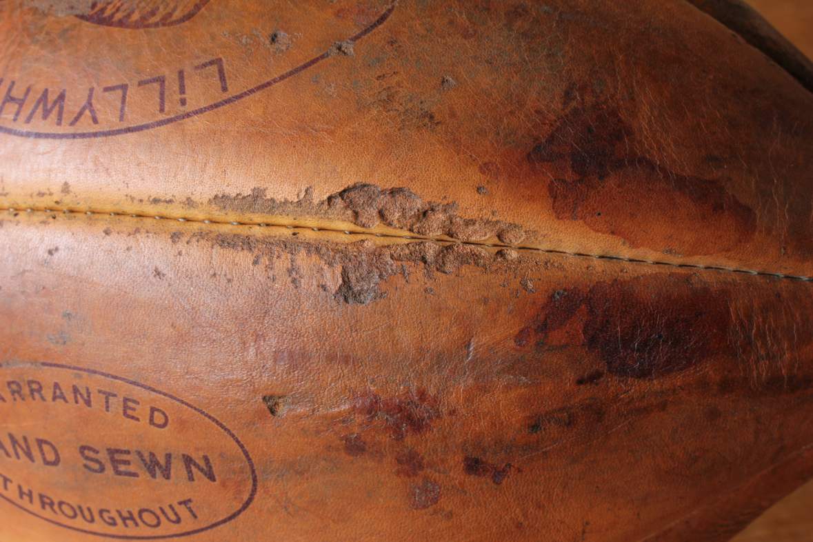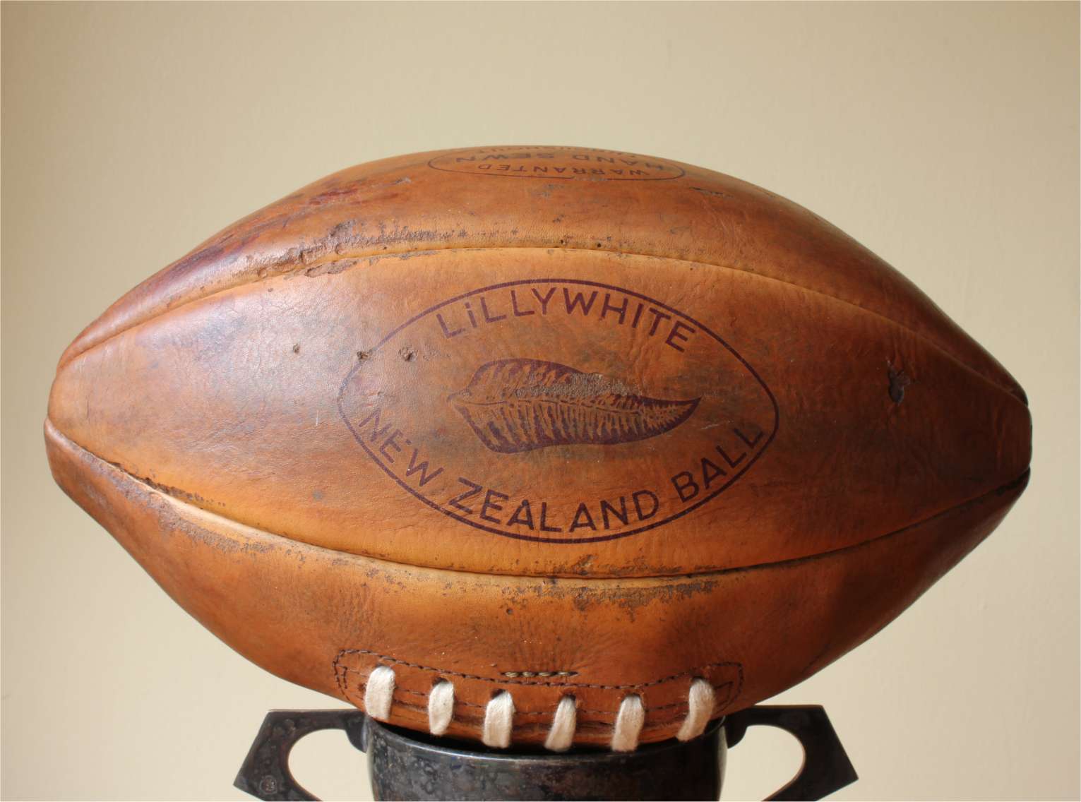This original vintage Rugby ball which dates from c1950 has 4 hand sewn leather panels and is marked Lillywhite New Zealand Ball. Warranted Hand Sewn Throughout.