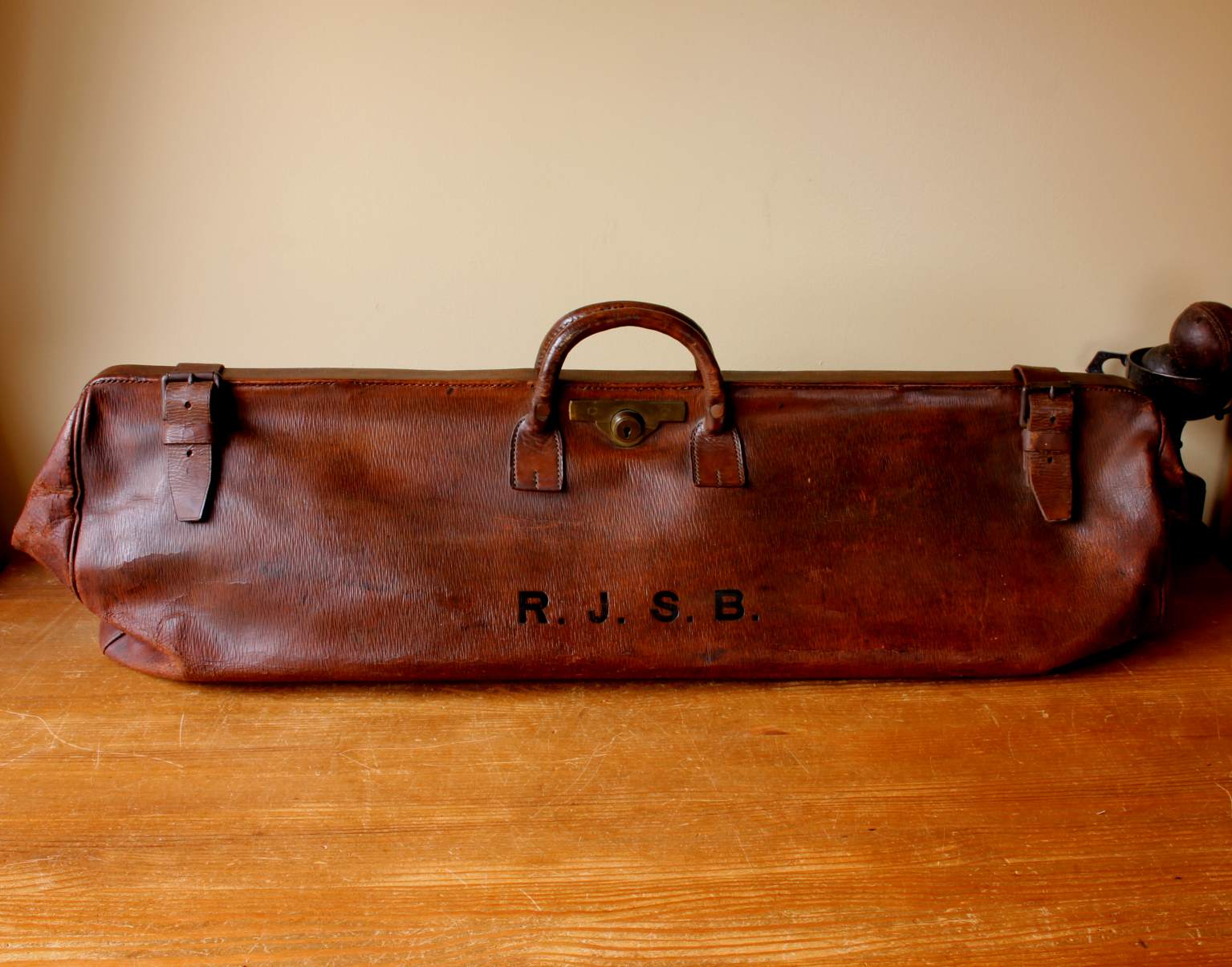 This handsome decorative leather bag which once belonged to someone with the initials R.J.S.B. would have been used to carry cricket bats, pads, shoes etc. This one would make a great show item in a cricket club, sports shop, bar or would make an interesting addition to a collection of cricket memorabilia.