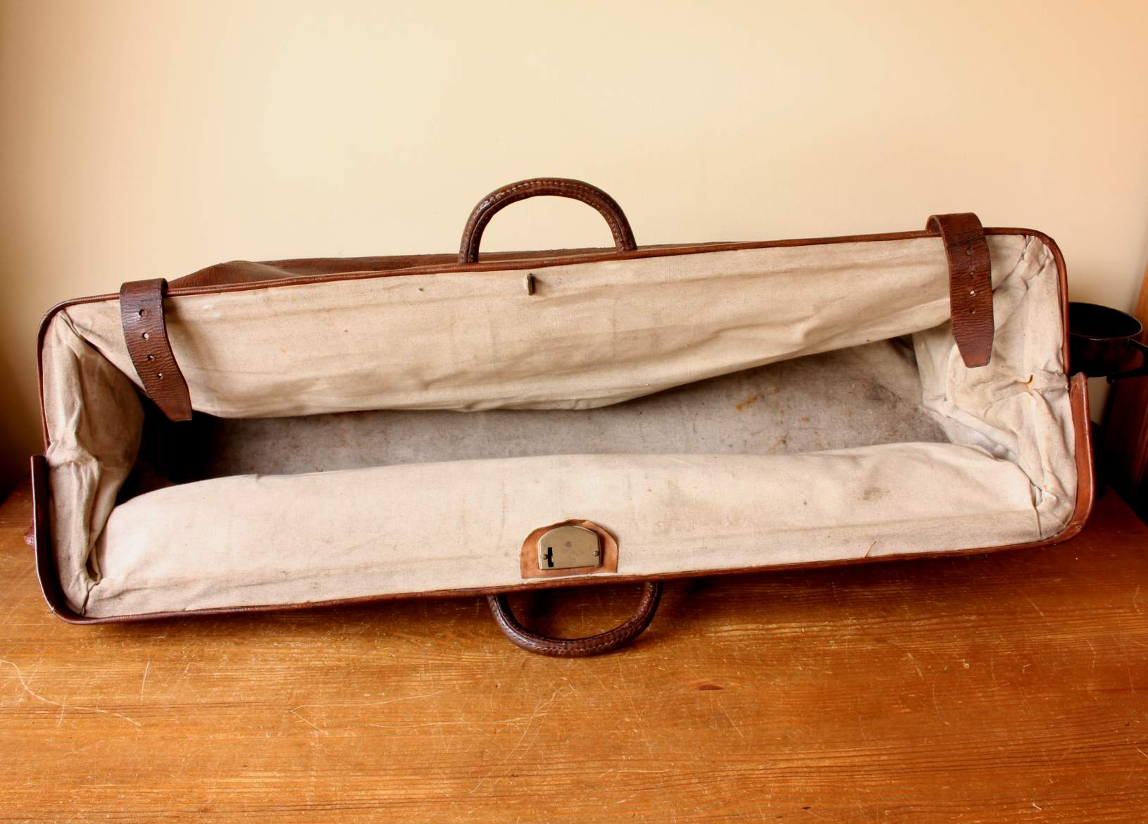 This antique long cricket bag which dates from the early 20th century is made of brown leather which has developed a nice aged look. The bag has carrying handles, two sturdy buckled straps and a secure lever brass lock.