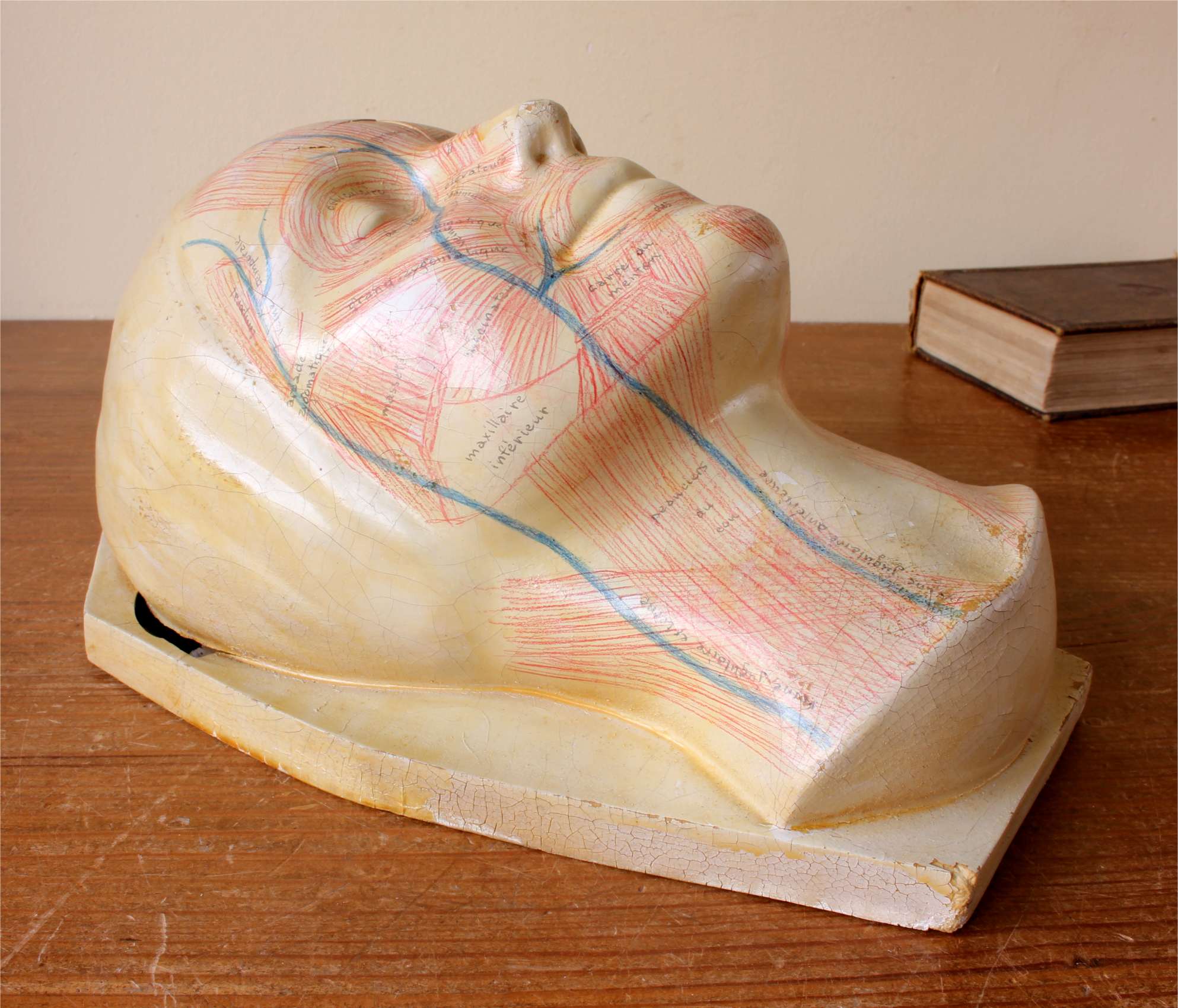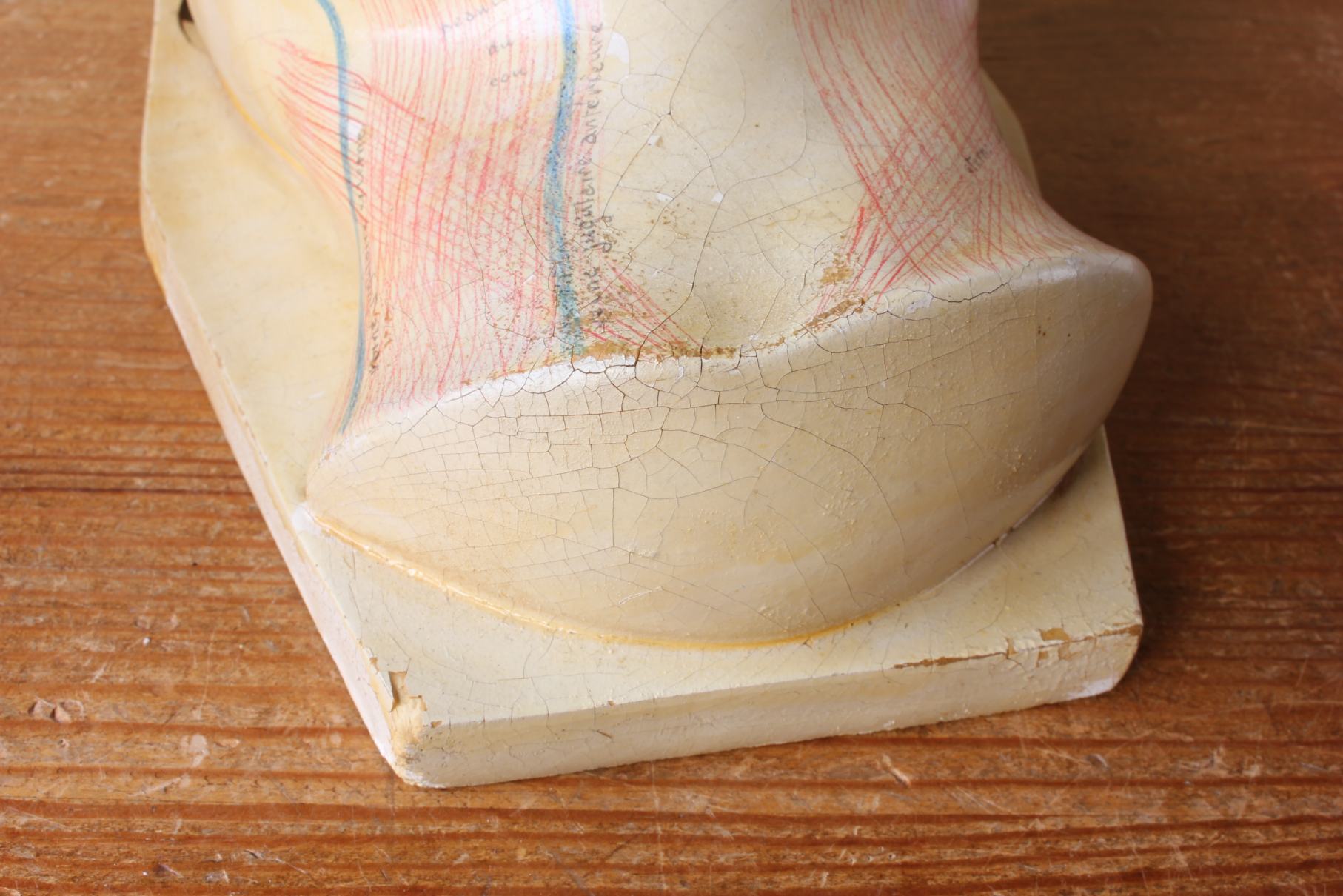 This educational anatomical model of a head which is made of hardened rubber is skilfully hand painted to show the facial muscles and primary veins in a human face with annotated notes.