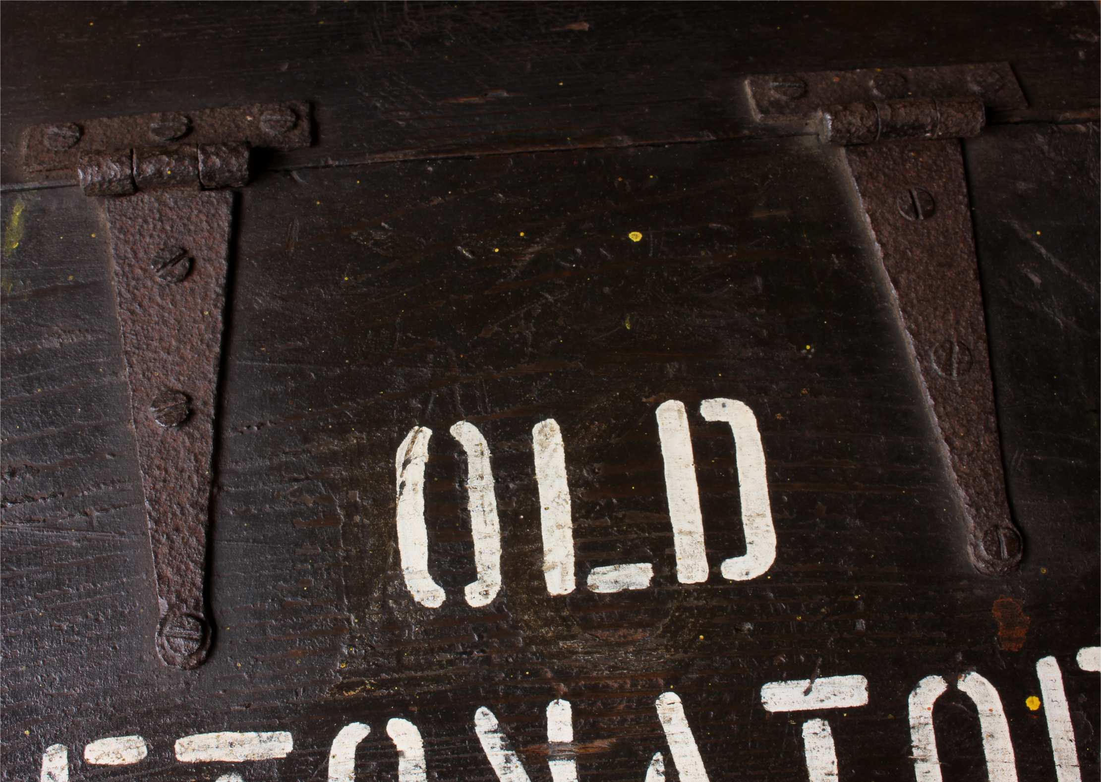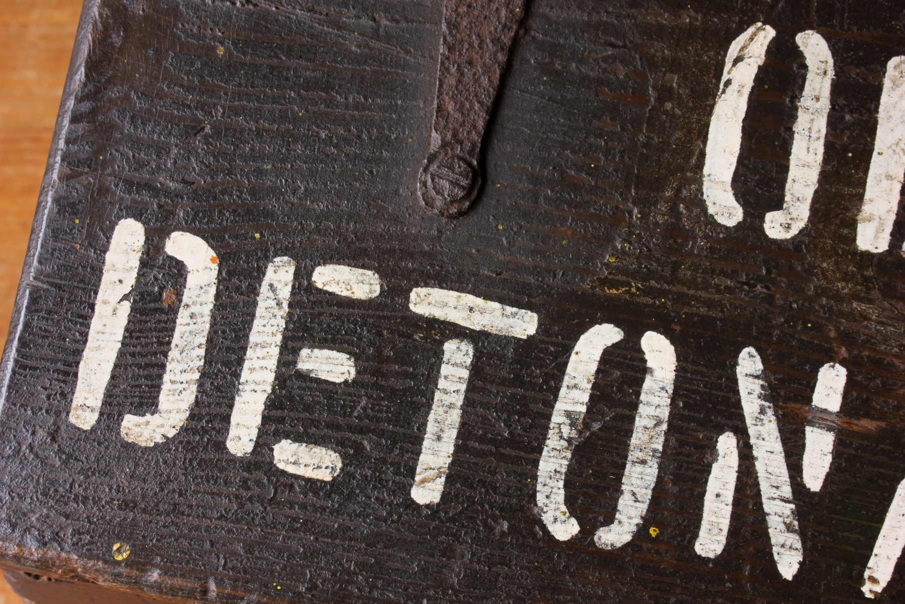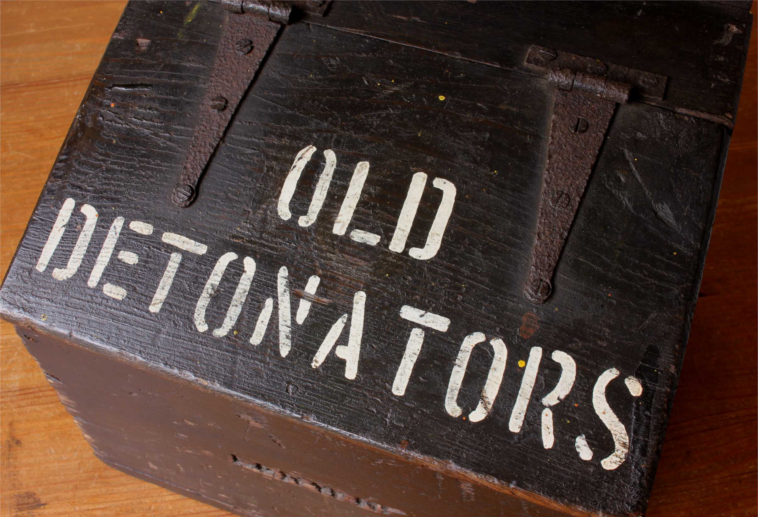 This antique box has a wonderful look with it's black paint and has the wording Old Detonators painted in white to the top lid.