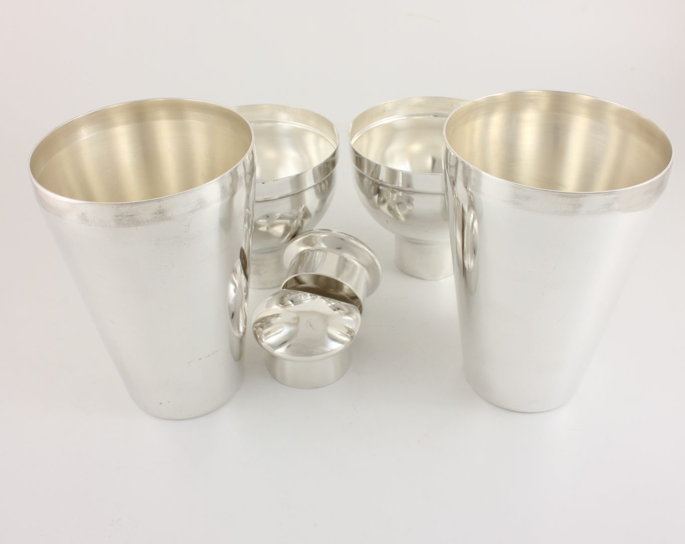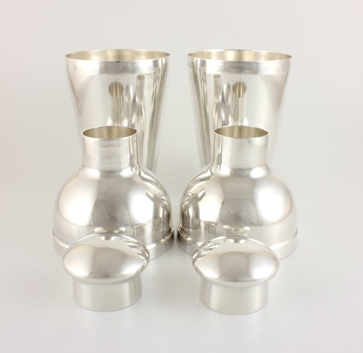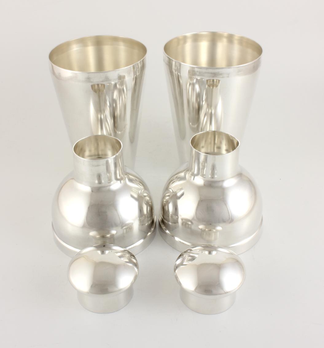 This pair of matching Belgian 3 piece silver plated cocktail shakers which date from c1930 are made by quality Belgian silversmith Wiskemann and have a wonderful stylish design with removable mushroom dome style lids.