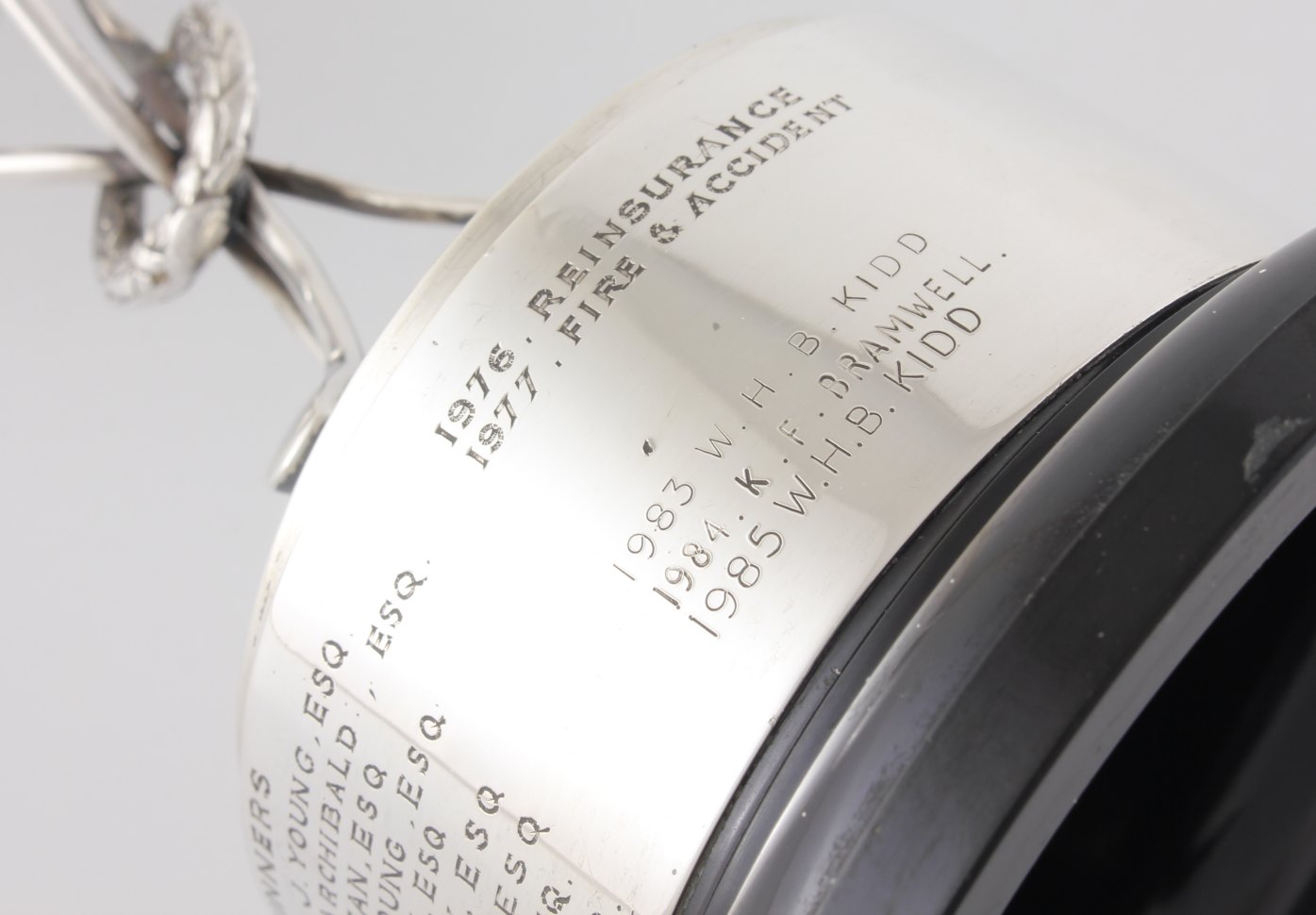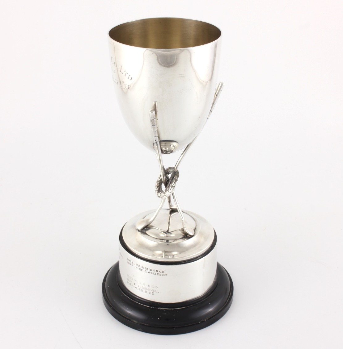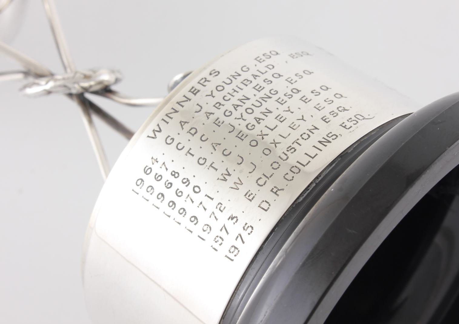 This trophy cup comes complete with it's black plastic base which has a sterling silver band showing winners of this cup from 1964.