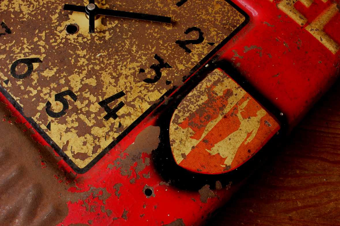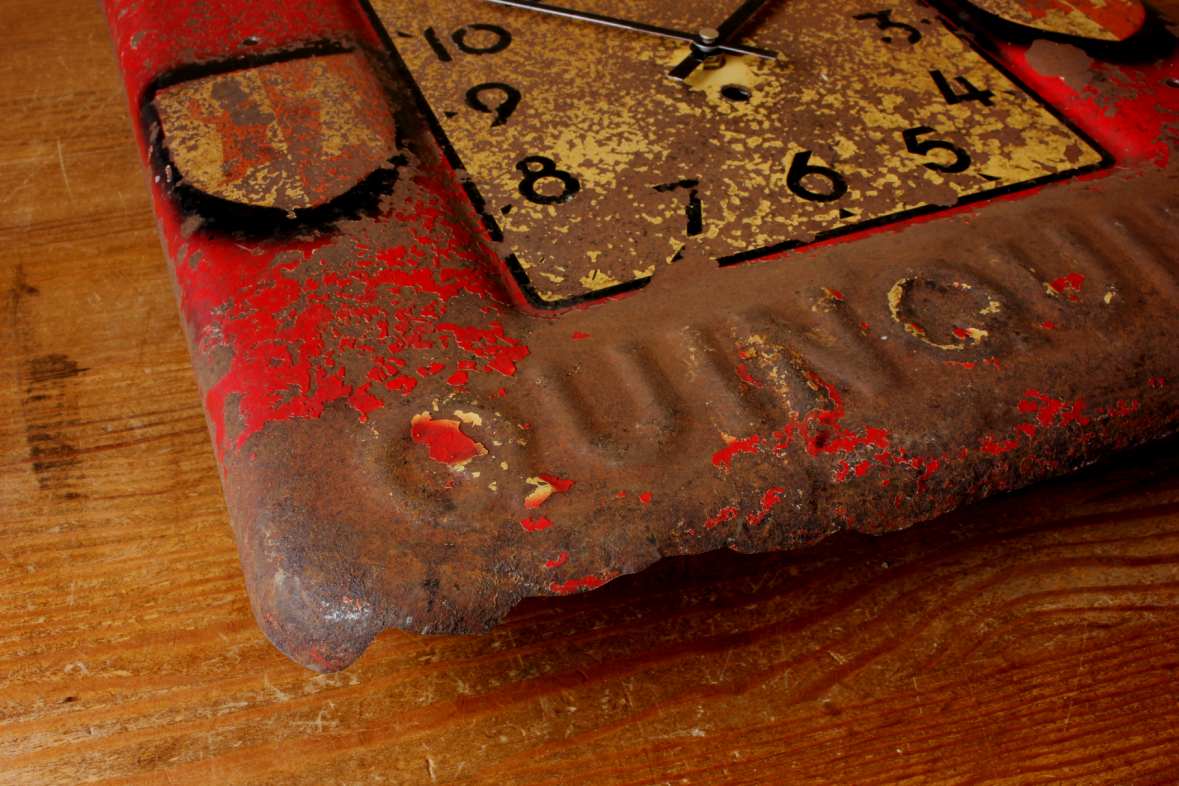 Condition: Original distressed condition with a wonderful patina. Some holes, dents, surface rust, heavy wear and scratches. The movement has been replaced with a modern quartz battery movement for convenience. Please see pictures.