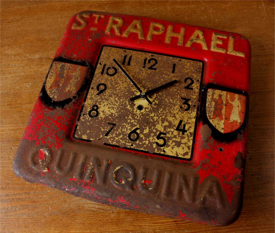 This rustic French Art Deco advertising wall clock which dates from the 1930's would have been hung in a French bar to advertise the aperitif drink St. Raphael Quinquina.