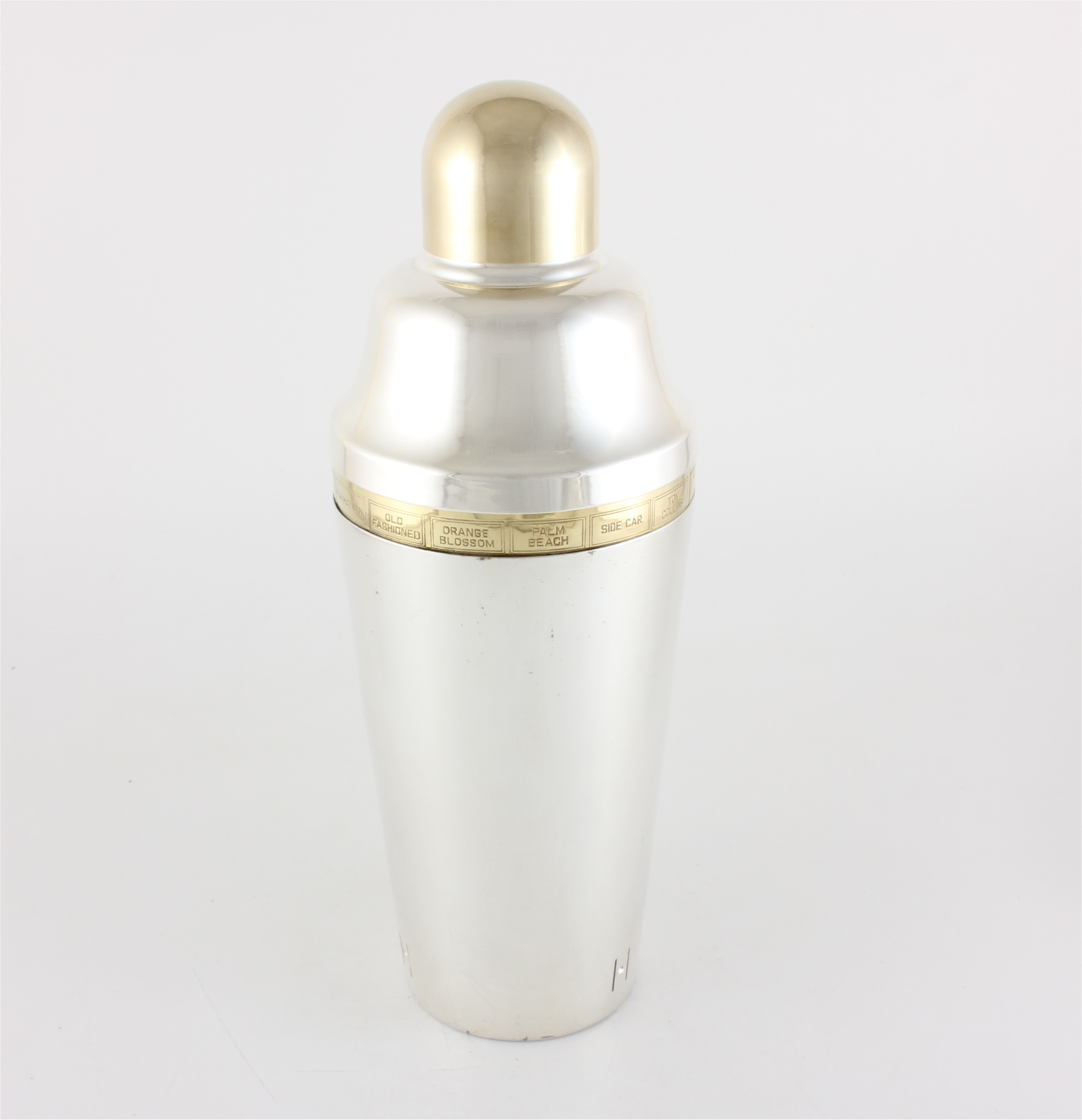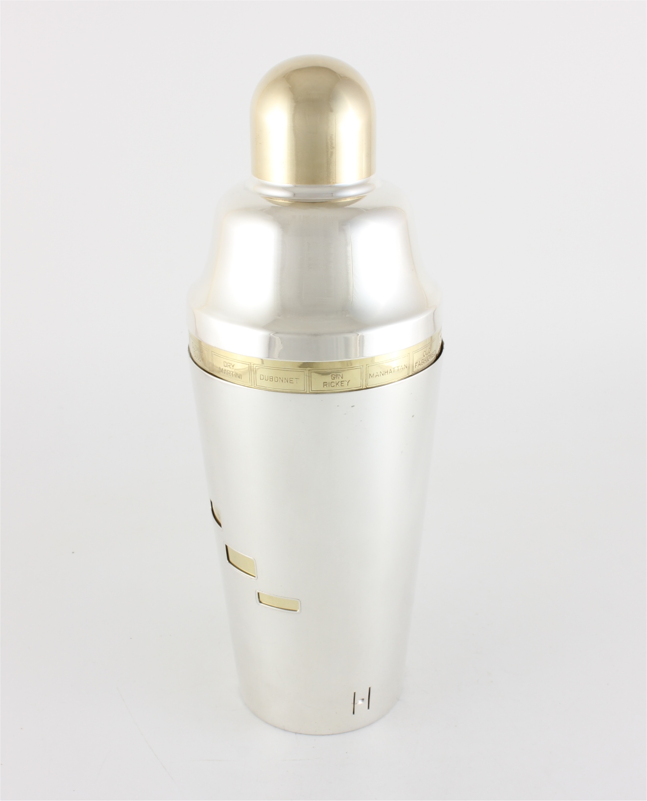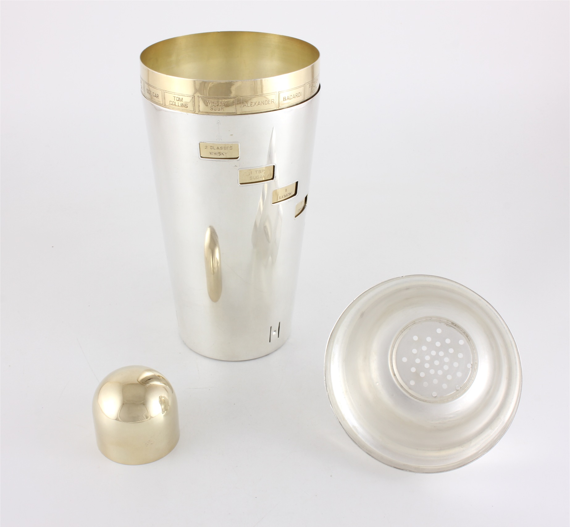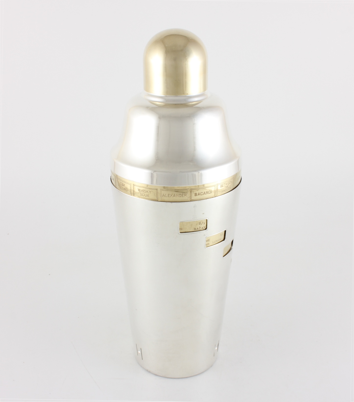 This stylish Art Deco Dial a Drink recipe cocktail shaker is by the American company Napier and features a silver plated sleeve which fits over the nicely gilded body.