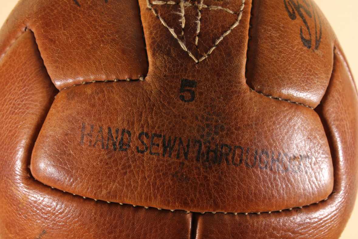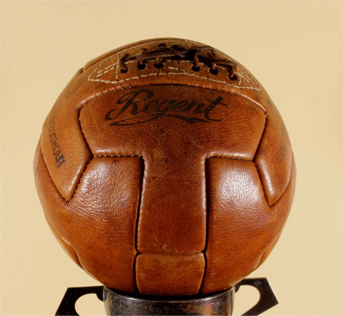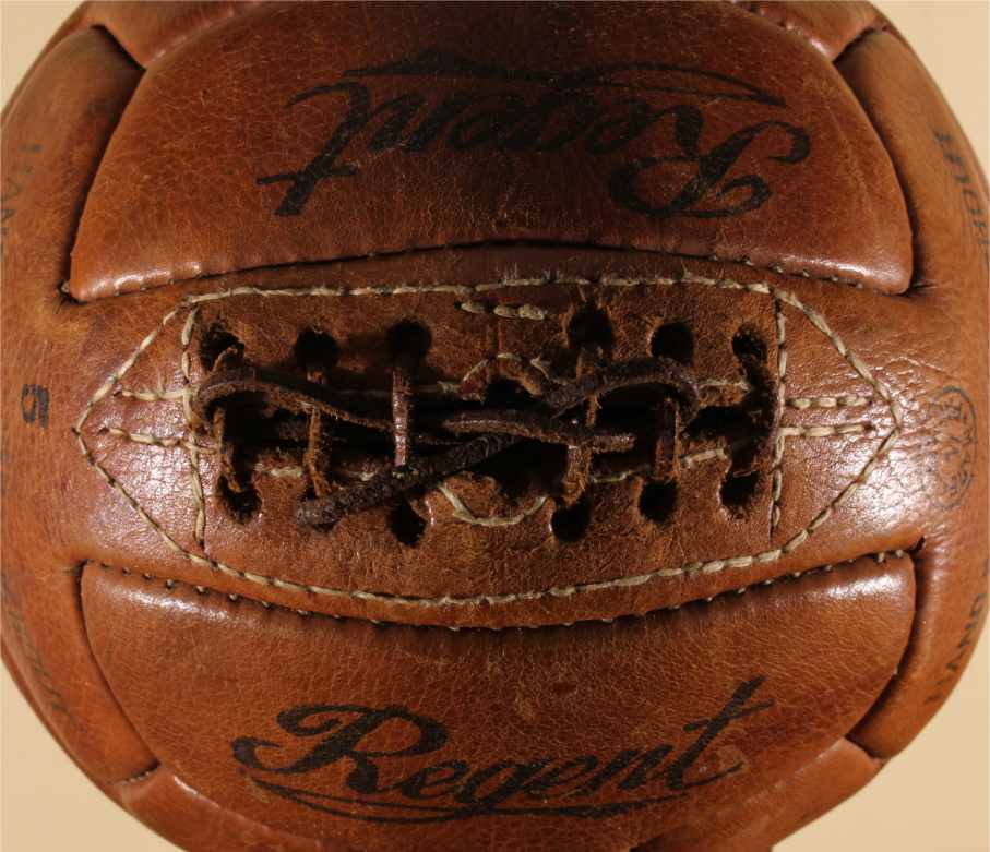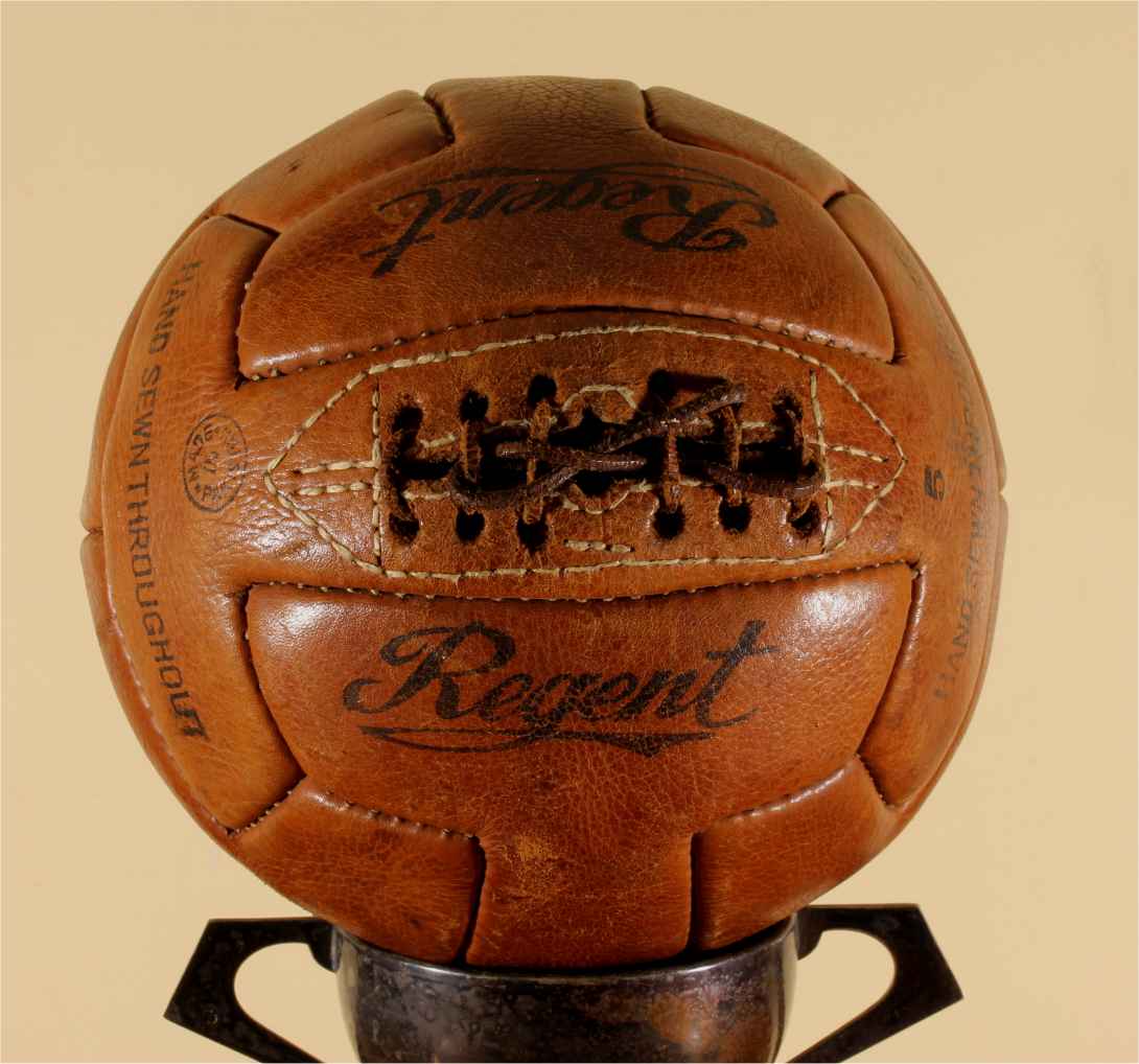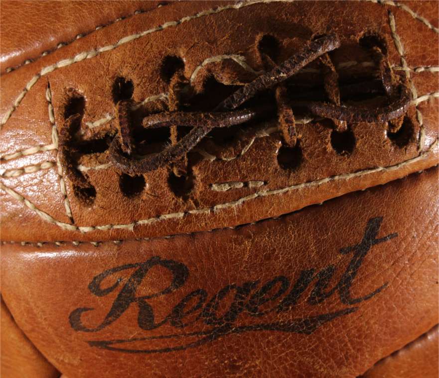 This original vintage football which is a T panel design ball with 6 pairs of lace holes is stamped with Regent, number 5, Hand Sewn Throughout and Made in Pakistan.