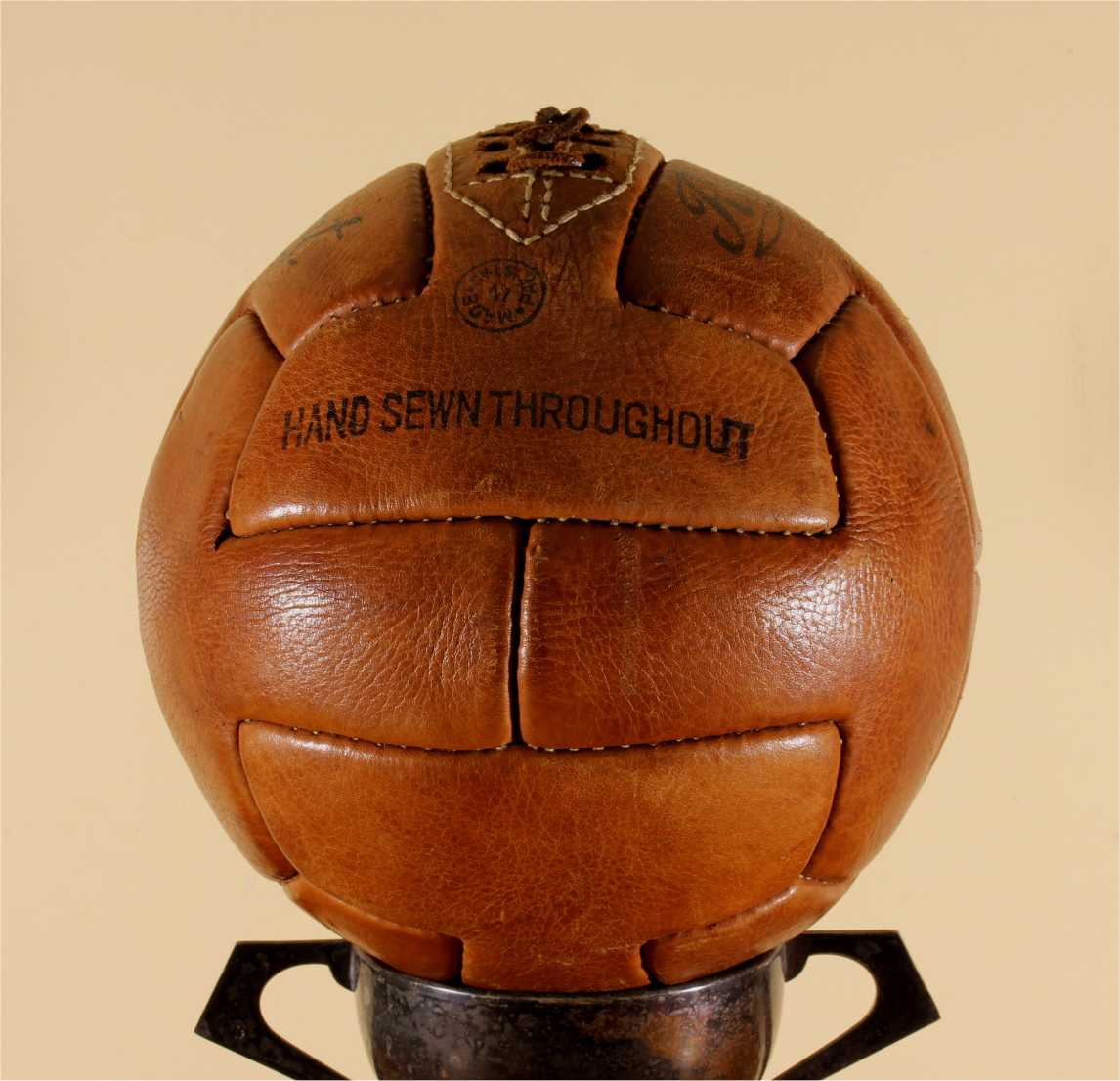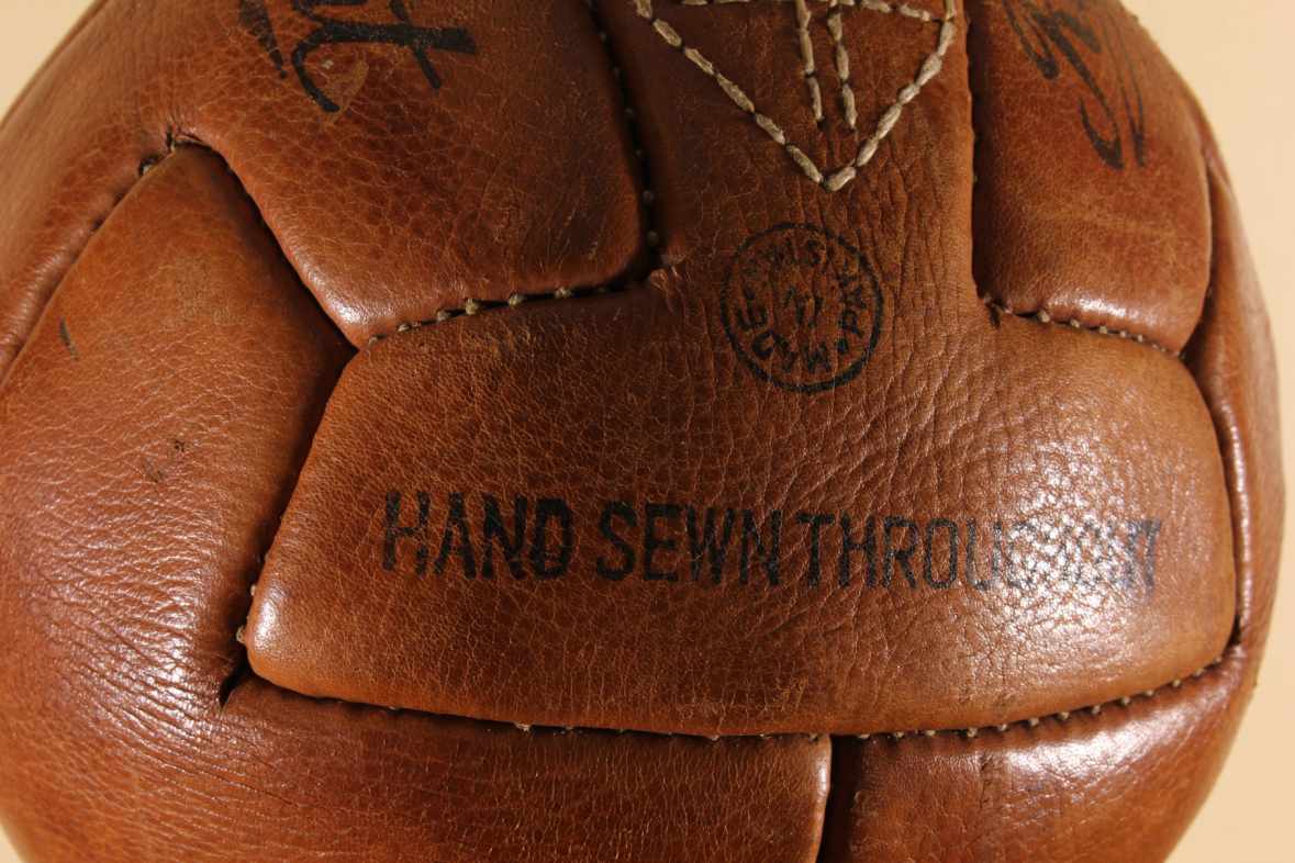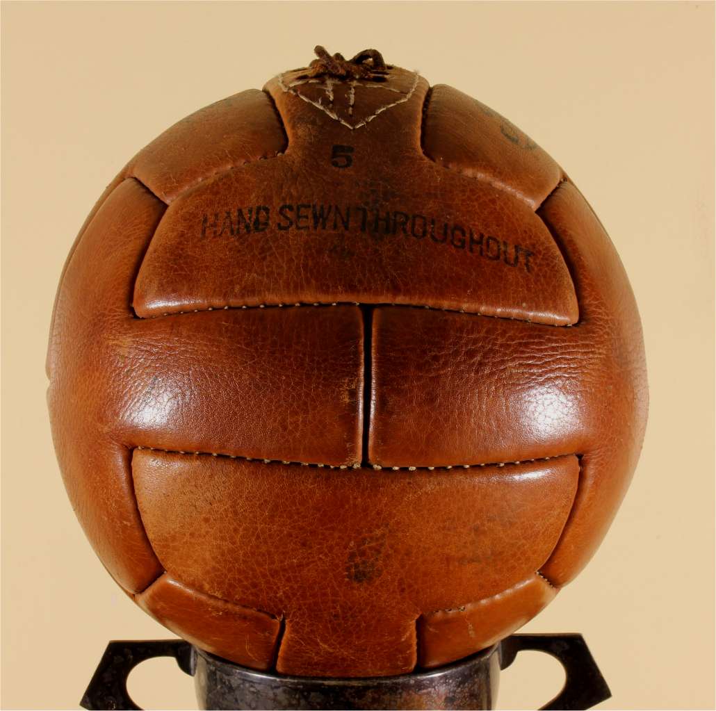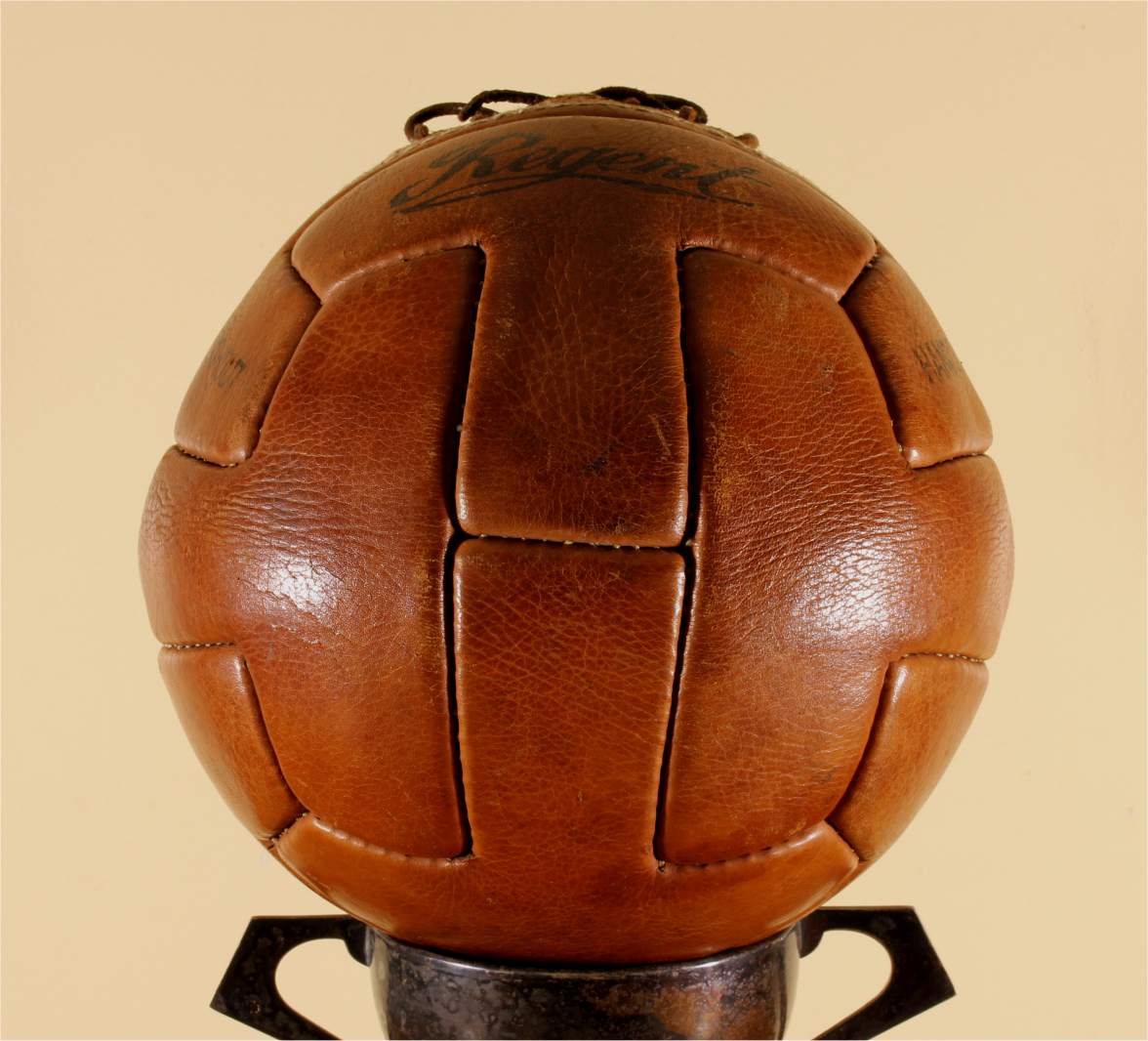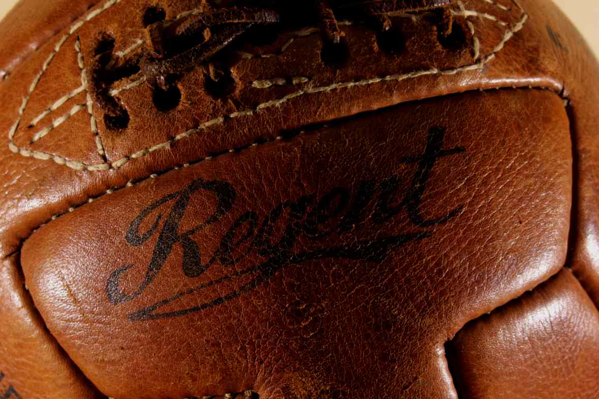 This original vintage football which is a T panel design ball with 6 pairs of lace holes is stamped with Regent, number 5, Hand Sewn Throughout and Made in Pakistan.