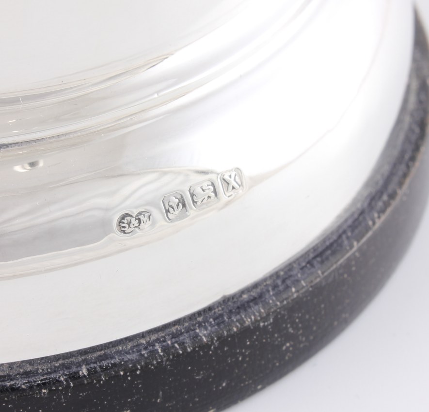 The sterling silver base has some engine turned decoration and bears an interesting inscription reading