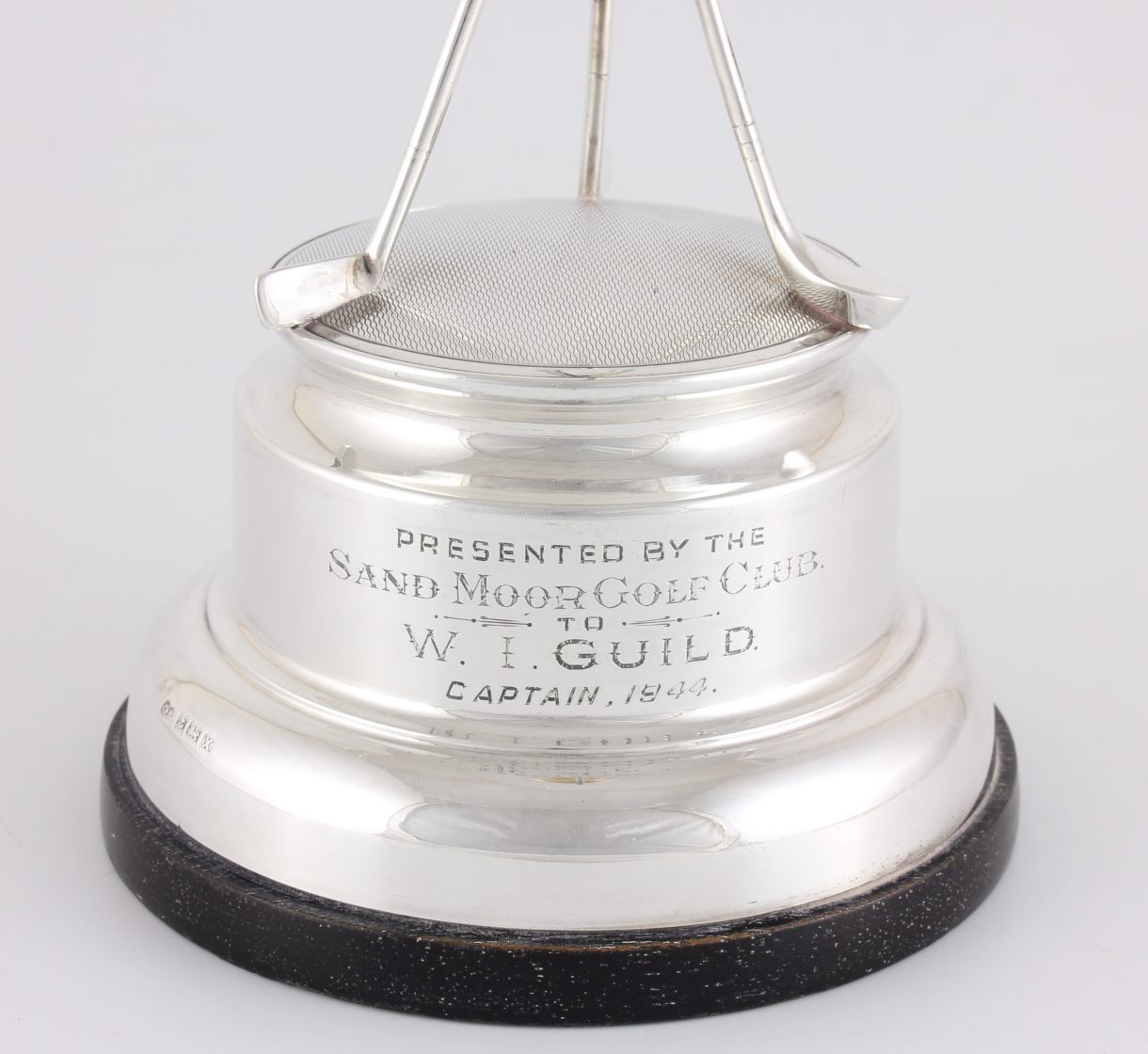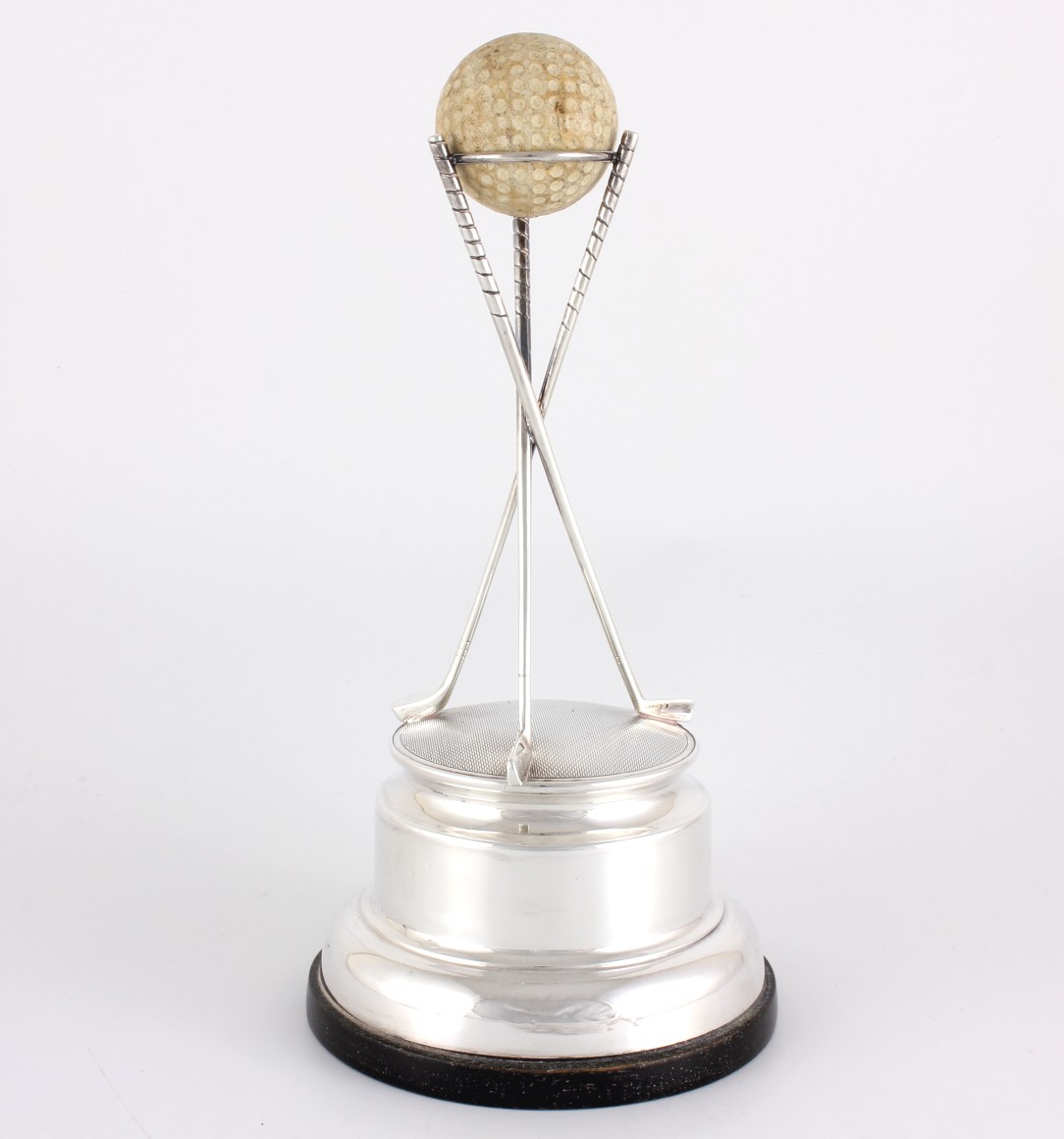 This hallmarked silver golf trophy which features three crossed golf clubs with a golf ball holder at the top is by Sanders & Mackenzie and is unusual as the base section is also made of silver with a wood bottom.