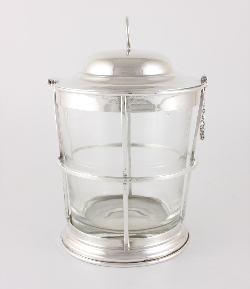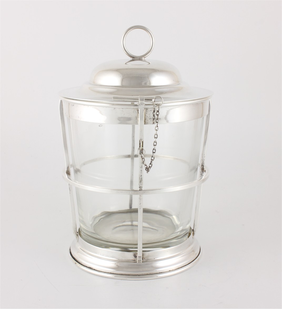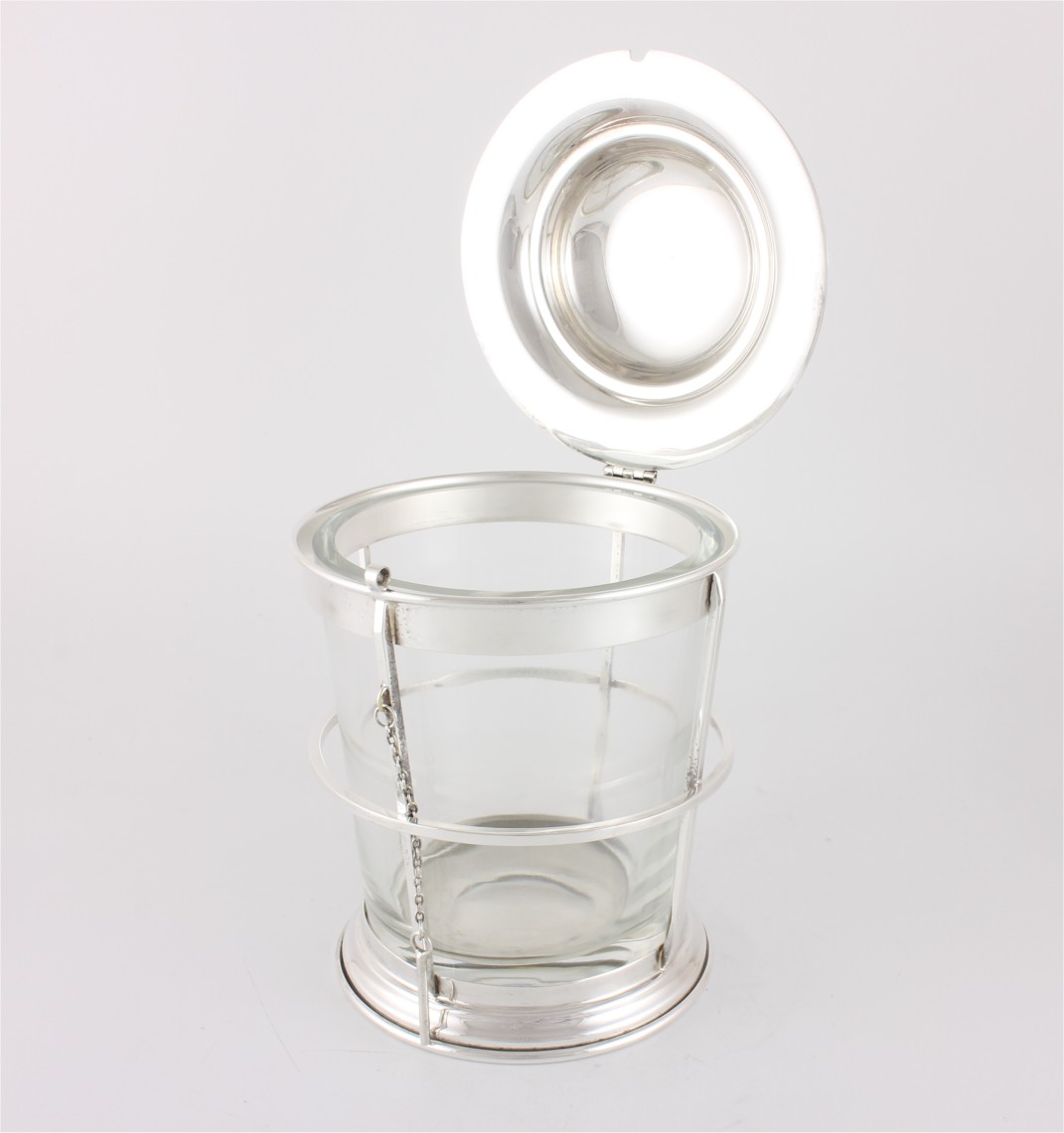 This unusual design ice pail has a hinged domed lid with a ring top handle, a removable heavy hand blown glass ice bucket and a stepped base. The lid can be secured by using the bar lock and chain.