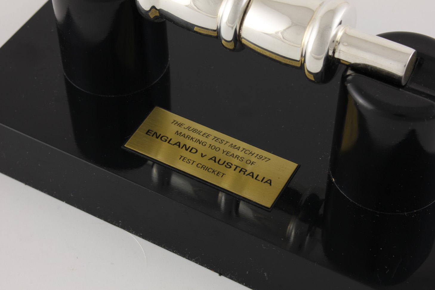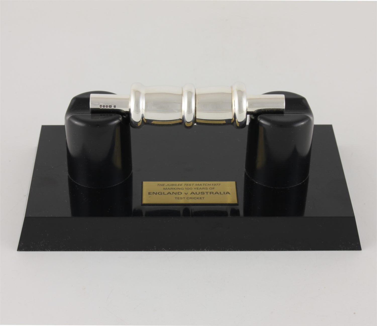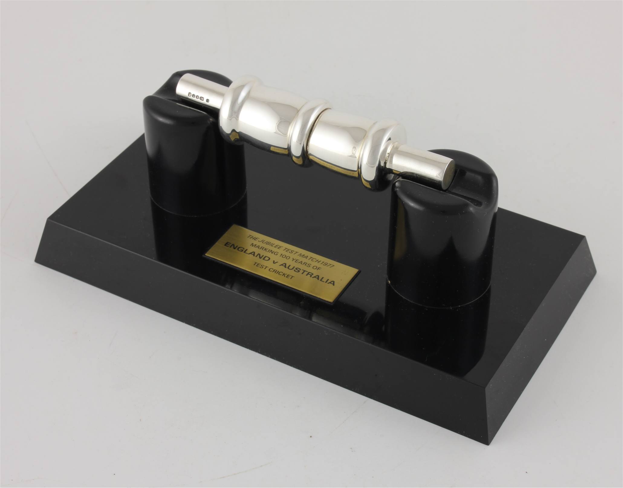 The bail sits nicely on it's black plastic presentation plinth which features an engraved plaque that reads: The Jubilee Test Match 1977. Marking 100 years of England V Australia Test Cricket and the silver bail is fully hallmarked for 1977.