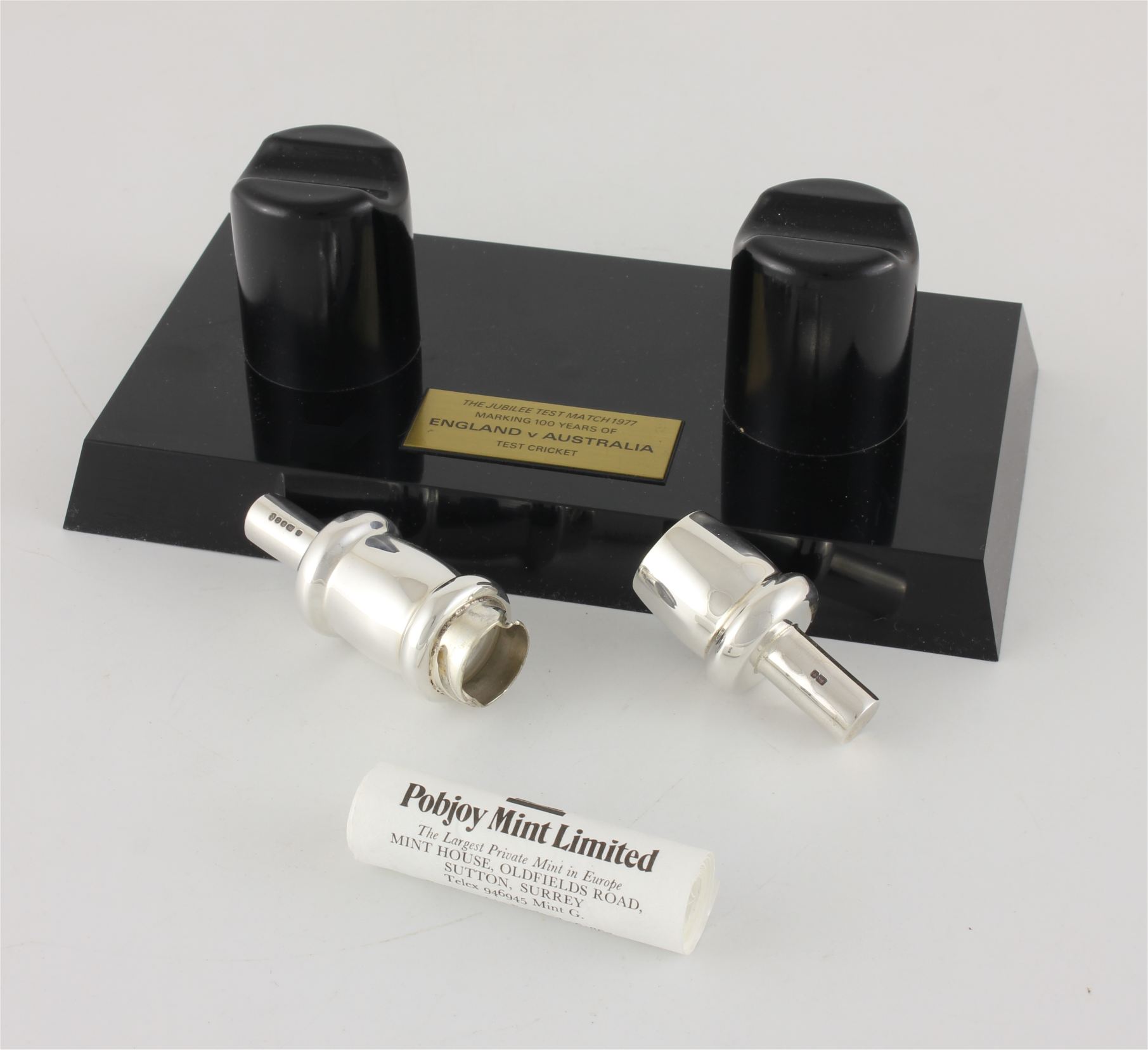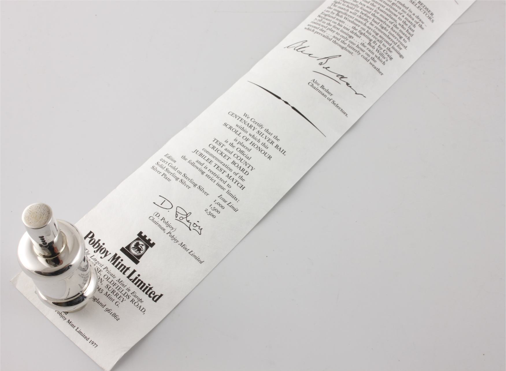 This limited edition collector's piece which is in the form of a solid silver cricket bail is fully hallmarked and was made by Pobjoy Mint to commemorate the 1977 Jubilee Test.